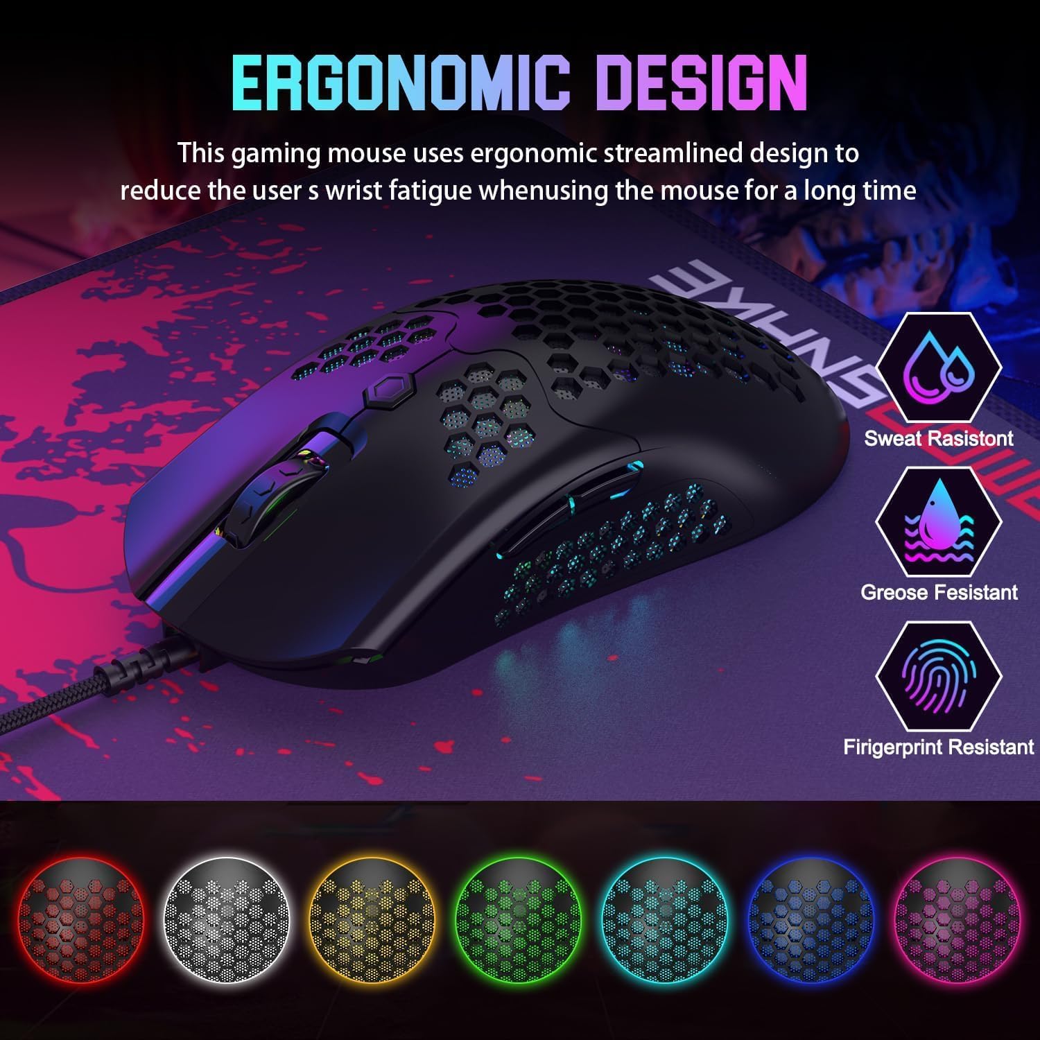 • ️ ЛЕКА RGB ГЕЙМЪРСКА МИШКА Кабелната геймърска мишка е оборудвана с перфориран корпус тип „пчелна пита“, намалява теглото, спестява повече енергия, подобрява разсейването на топлината, има 6 бутона, „дишаща“ подсветка, 4 регулируеми нива на DPI (800/1600/2400/3200) и е по-издръжлива, а гъвкавото, ергономично тяло пасва идеално на дланта ви, което прави използването ѝ по-приятно, особено при игри.