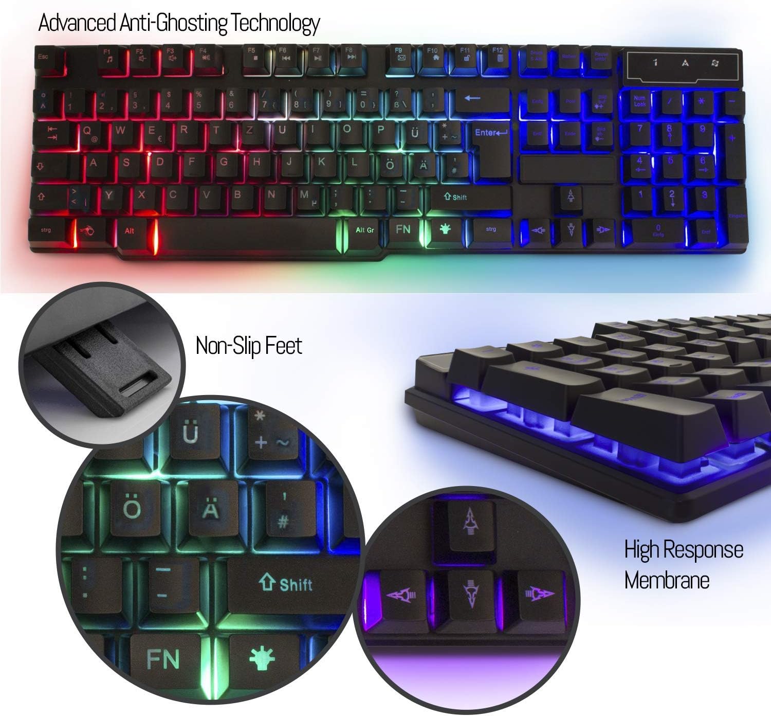 Геймърска клавиатура с кабелна механична клавиатура с многоцветна LED подсветка, anti-ghosting технология с 19 клавиша, плавен ход за бързи действия в тишина, клавиши за управление на медийни файлове, функционални клавиши за режим на игра и регулируеми крачета за по-голям комфорт на китката.