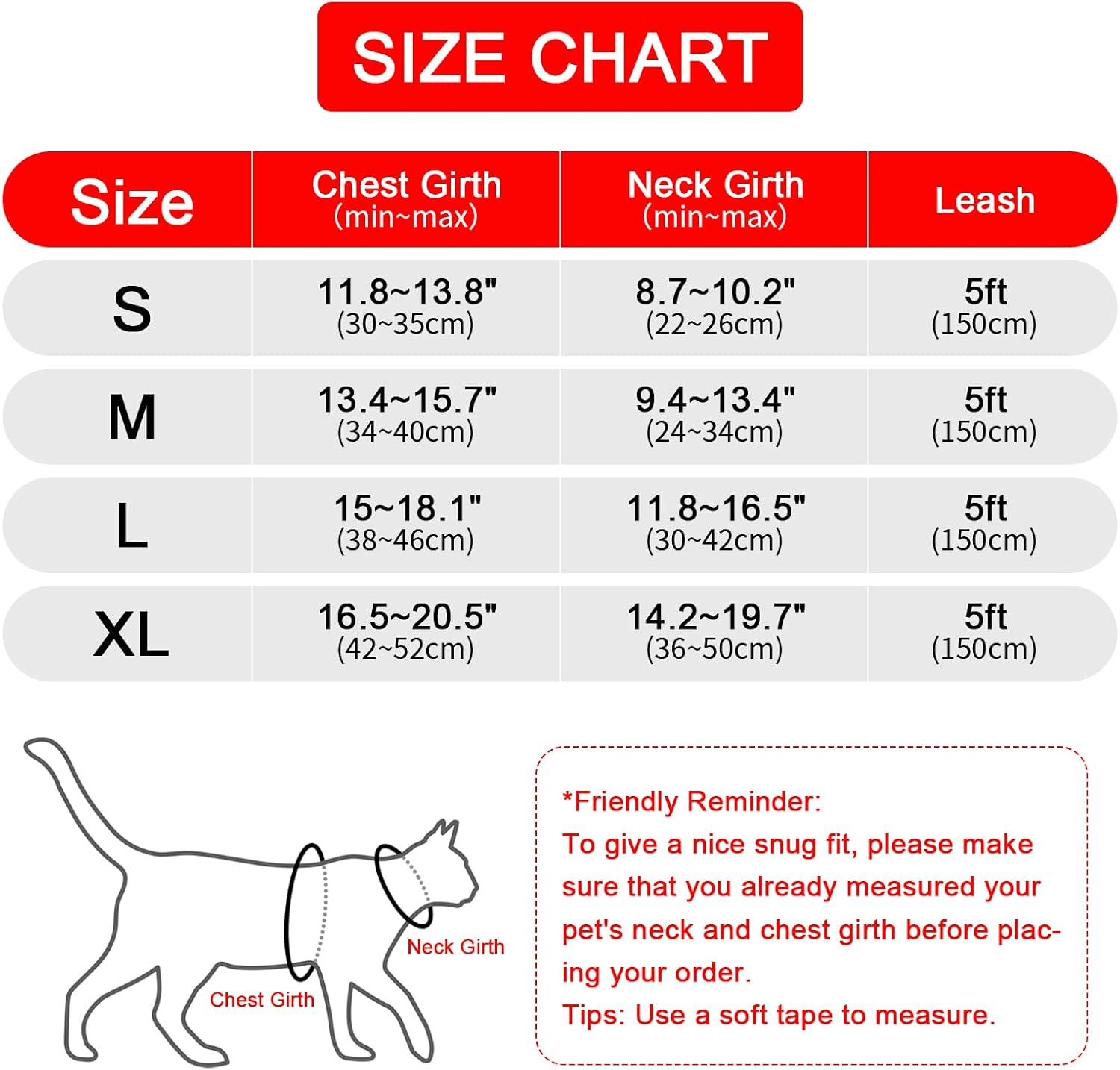 • Пакетът включва 1 XL нагръдник и 1 найлонова каишка (150 см). За да сте сигурни, препоръчваме да използвате ролетка, за да получите по-точни данни. Тъй като котките са много чувствителни, можете да ги разсейвате с лакомства, докато миете чиниите.