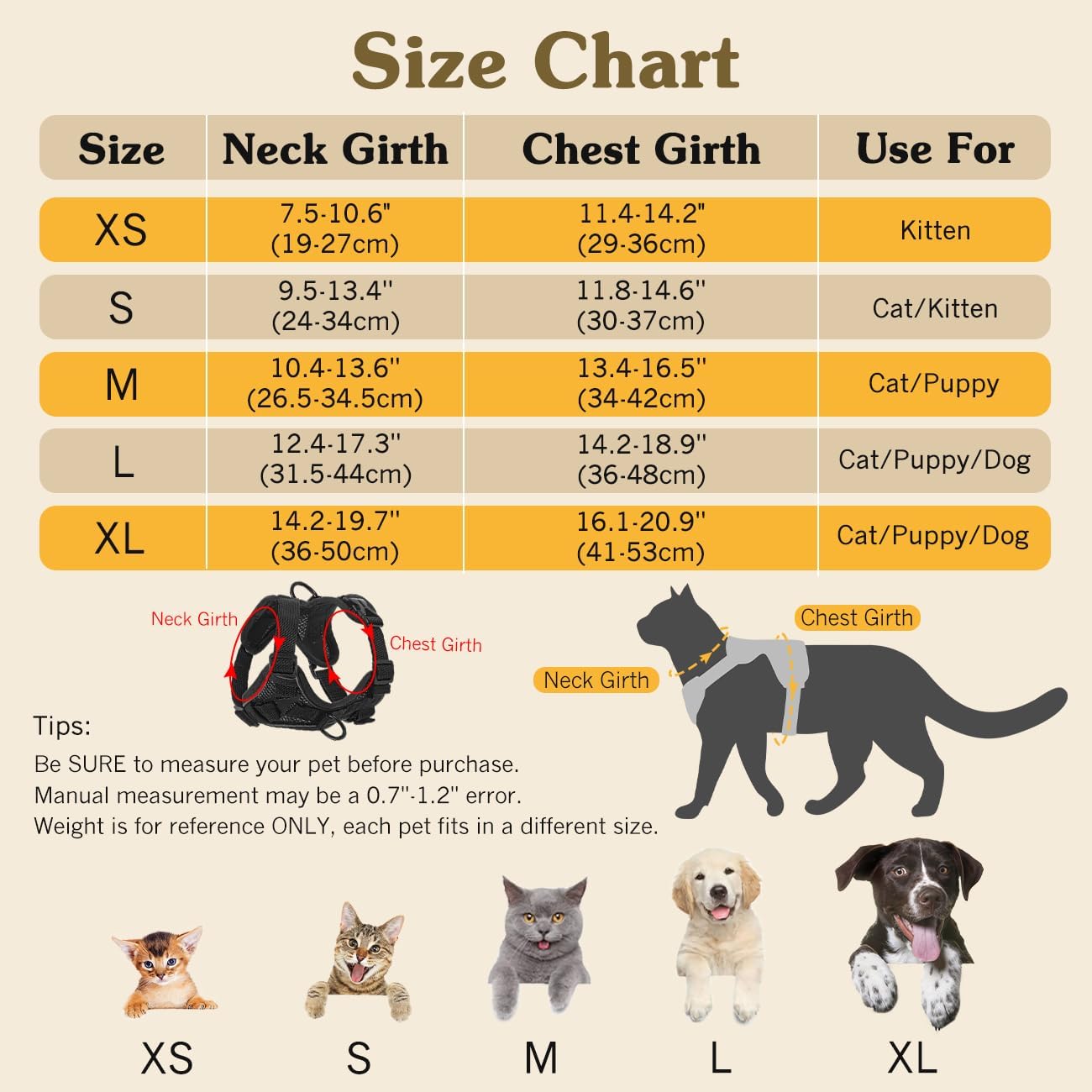 • 【Предлагат се различни размери】Пакетът включва: 1 x Нагръдник за котки и 1 x Каишка (60,5 инча). Регулируемият нагръдник за котки е подходящ за различни домашни любимци. Предлагаме ви 4 размера, от които да избирате, включително S, M, L и XL. След многобройни потребителски тестове, размерите S и M са по-препоръчителни за котки, а размерите X и XL са по-препоръчителни за малки кучета (за справка). Забележка: Моля, изберете правилния размер според вашите действителни мерки.