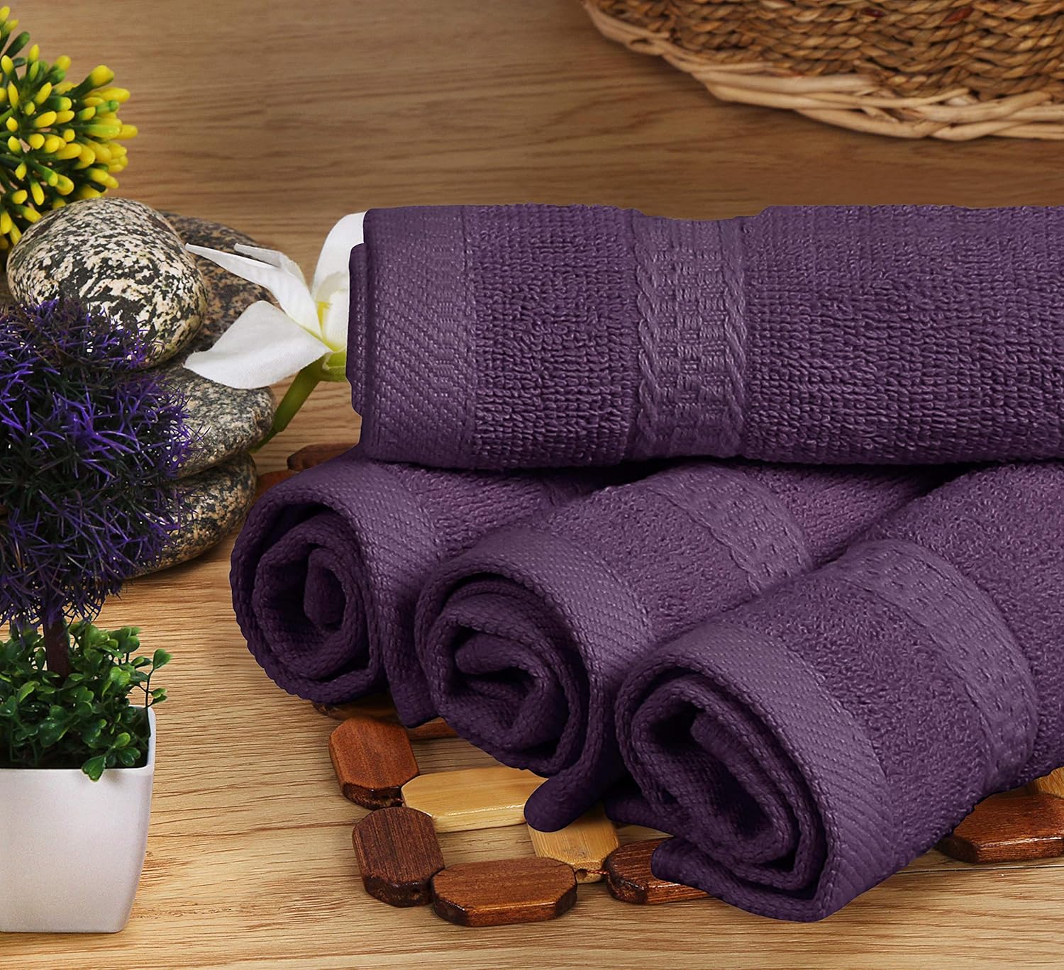 Комплектът е с двойно зашита подгъната повърхност, за да се намали разпадането след пране. Професионално подгънатите краища са внимателно обработени, за да се подобри качеството и издръжливостта на кърпата. Кърпите са изработени от пениран памук и двойна прежда.