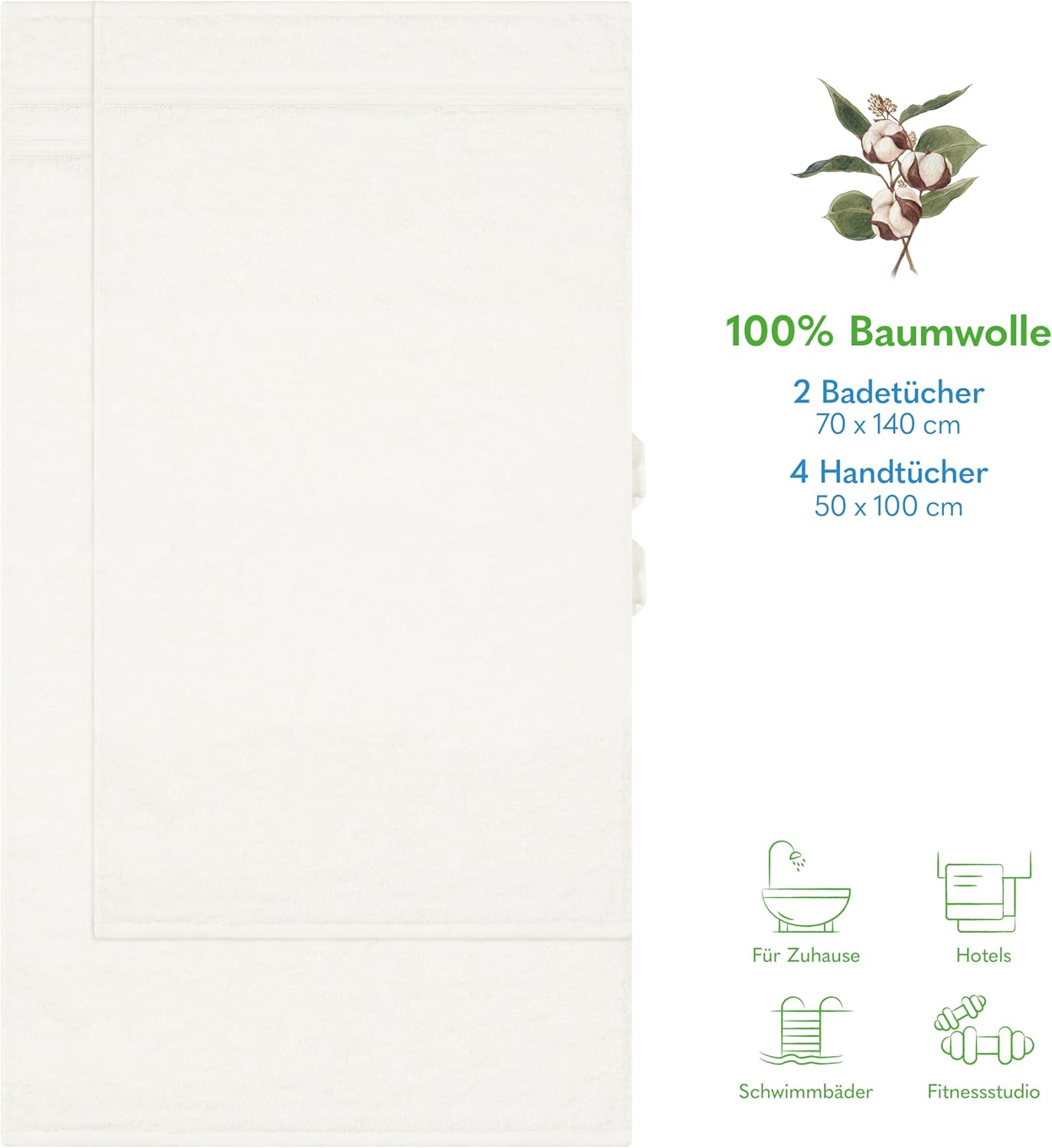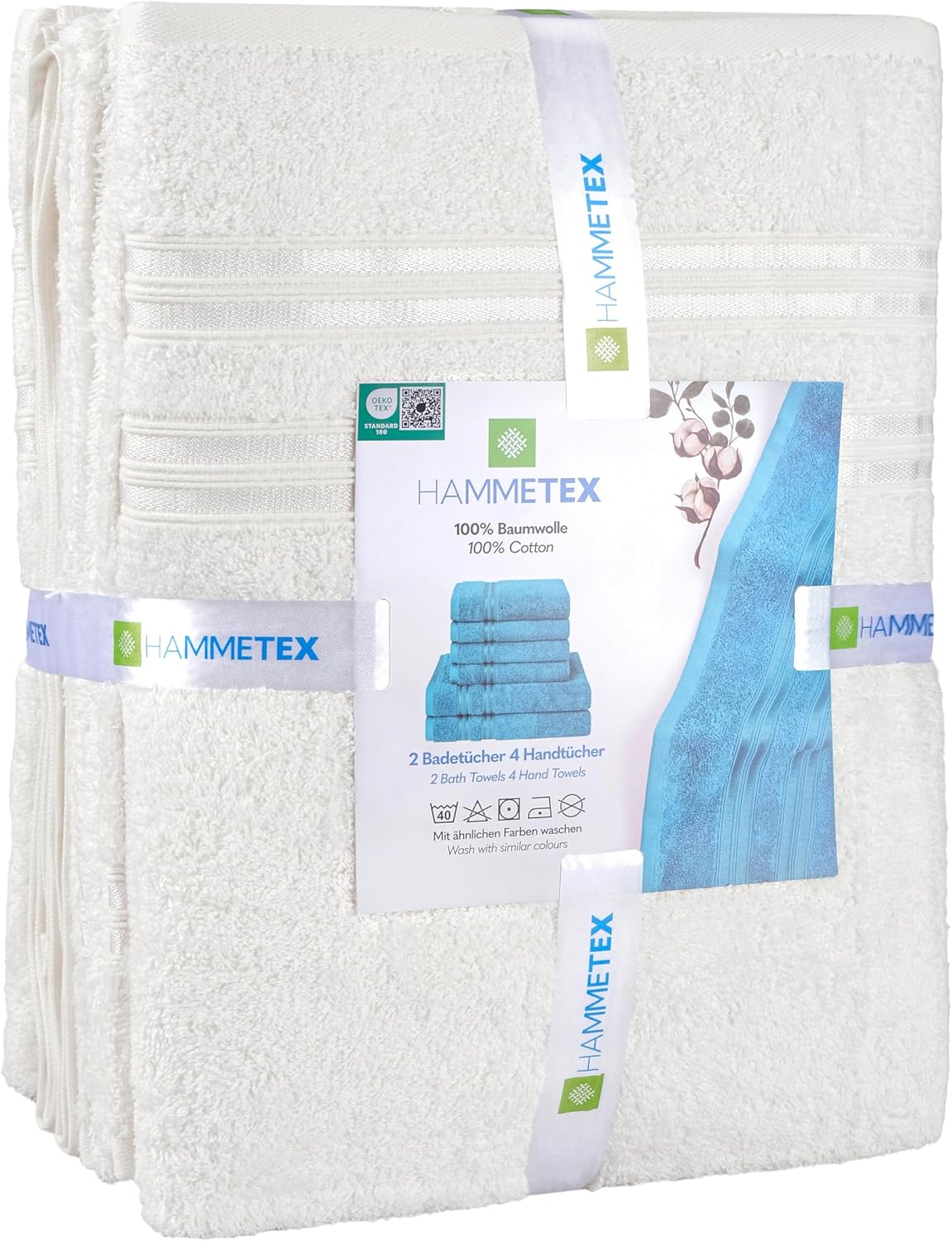 Открийте комплекта HAMMETEX: 2 големи кърпи за баня (70x140 см) и 4 кърпи за ръце (50x100 см). Изработени от фин турски памук за комфорт и функционалност – идеални за ежедневна употреба или специални поводи.