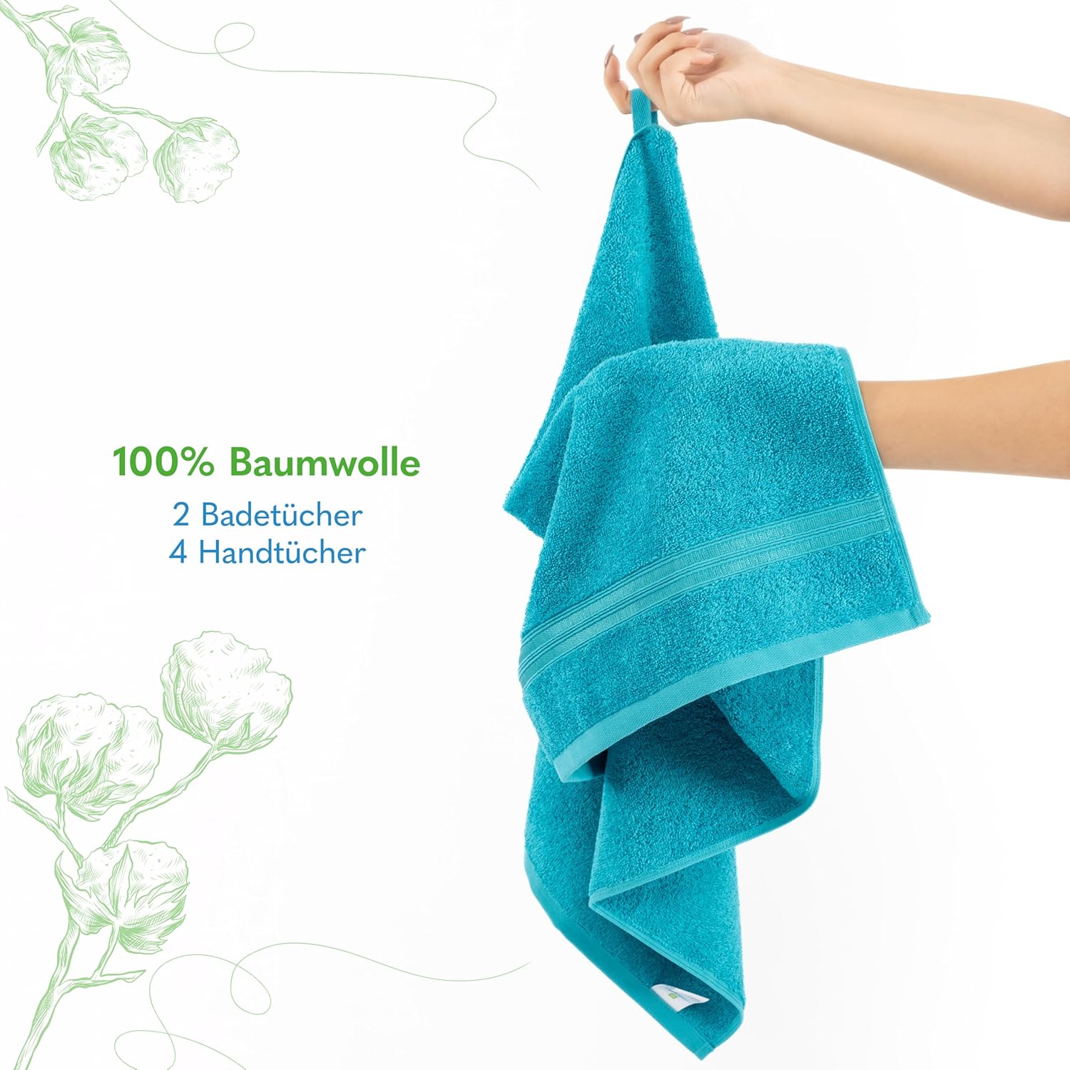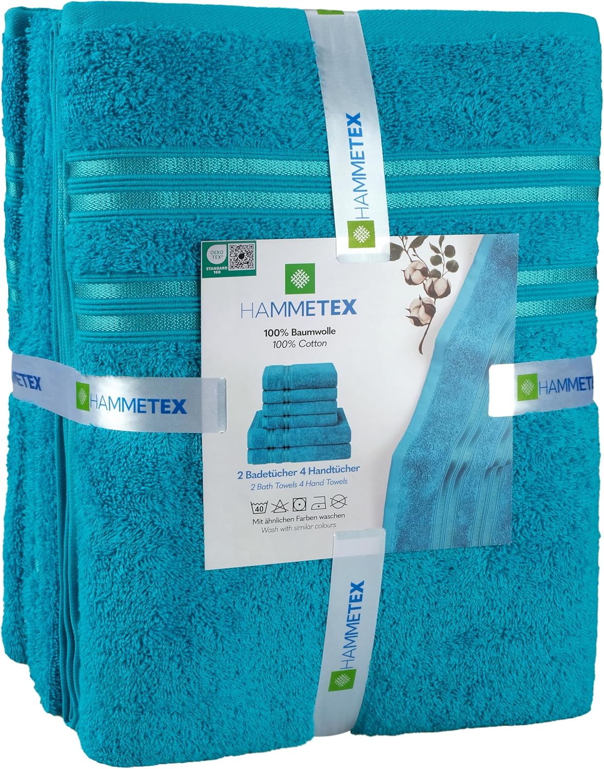 Открийте комплекта HAMMETEX: 2 големи кърпи за баня (70x140 см) и 4 кърпи за ръце (50x100 см). Изработени от фин турски памук за комфорт и функционалност – идеални за ежедневна употреба или специални поводи.
