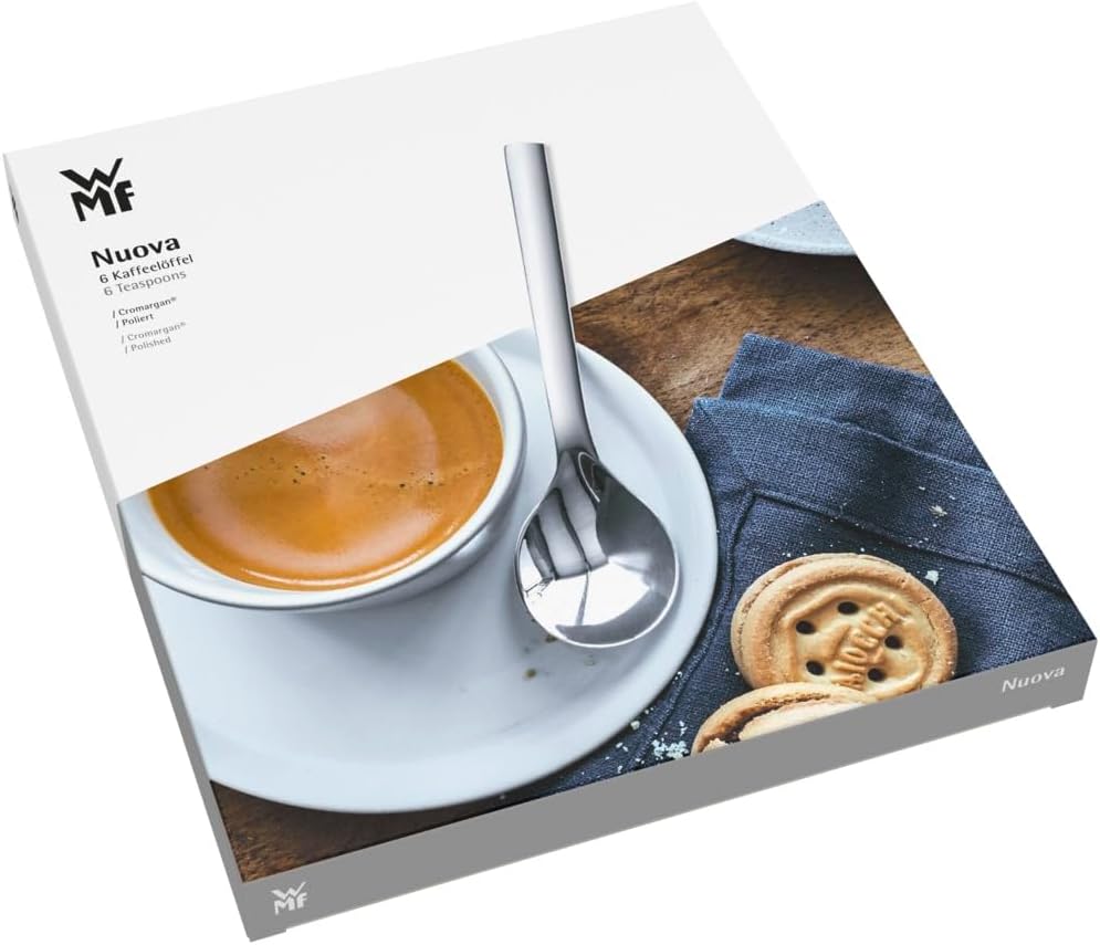 Комплект лъжички за чай/кафе WMF Nuova, 6 части, 13,5 см, Чаена лъжичка, изработена от полирана неръждаема стомана Cromargan, Десертни лъжички, подходящи за съдомиялна машина