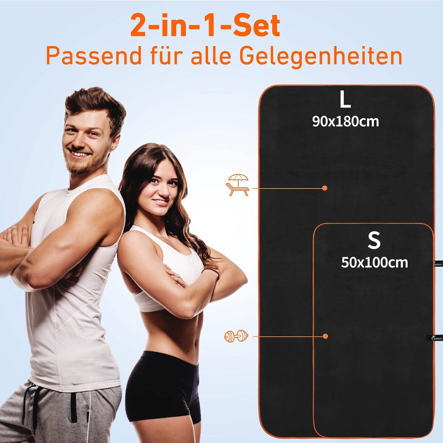 • Комплект от 2 кърпи: ще получите кърпа с размери 180 x 90 см и 100 x 50 см. Този комплект големи микрофибърни кърпи е идеален за всички ваши нужди, независимо дали сте във фитнеса като кърпа за фитнес, за спорт като спортна кърпа за фитнес или като голяма кърпа за плажа. Той предлага перфектната комбинация от размер и функционалност.