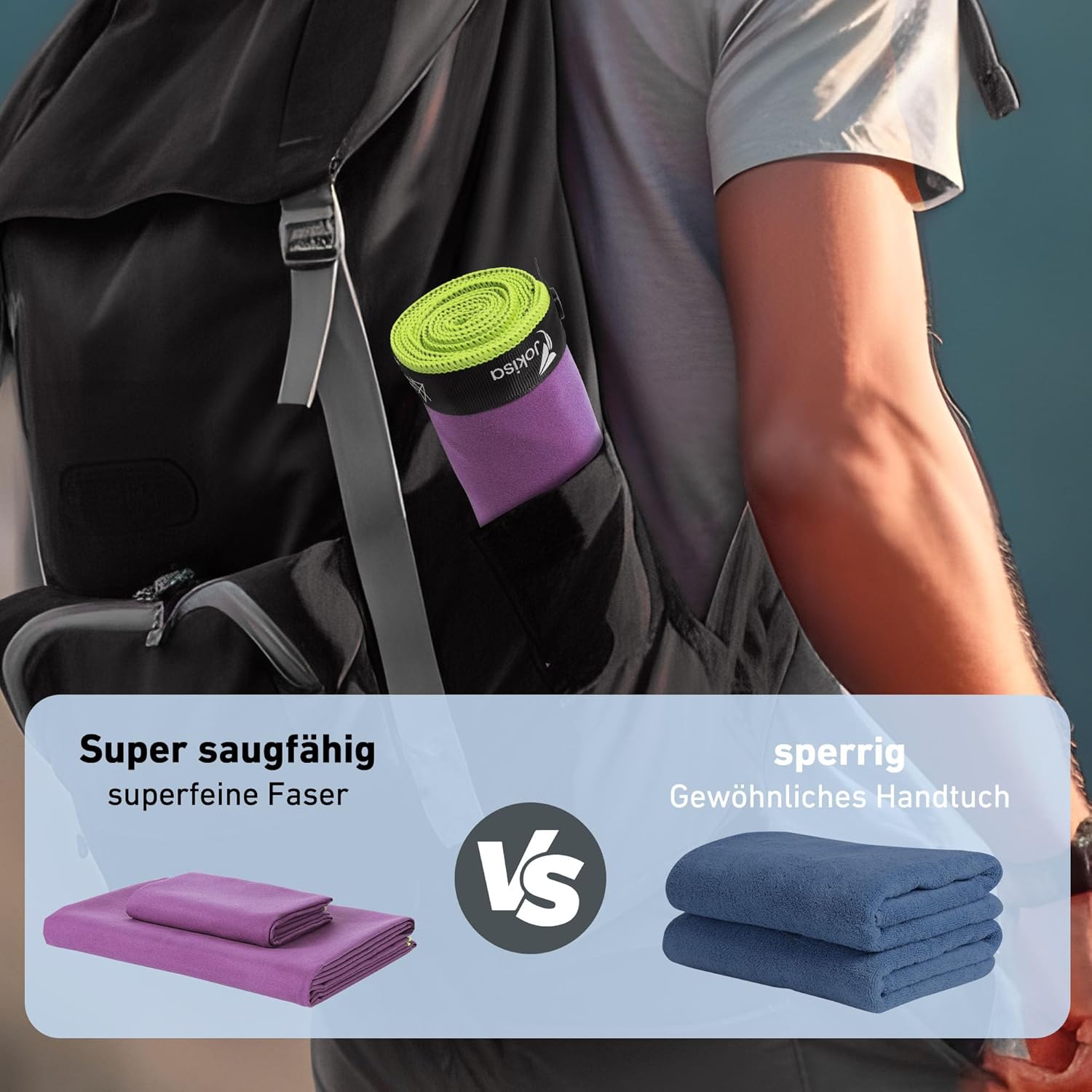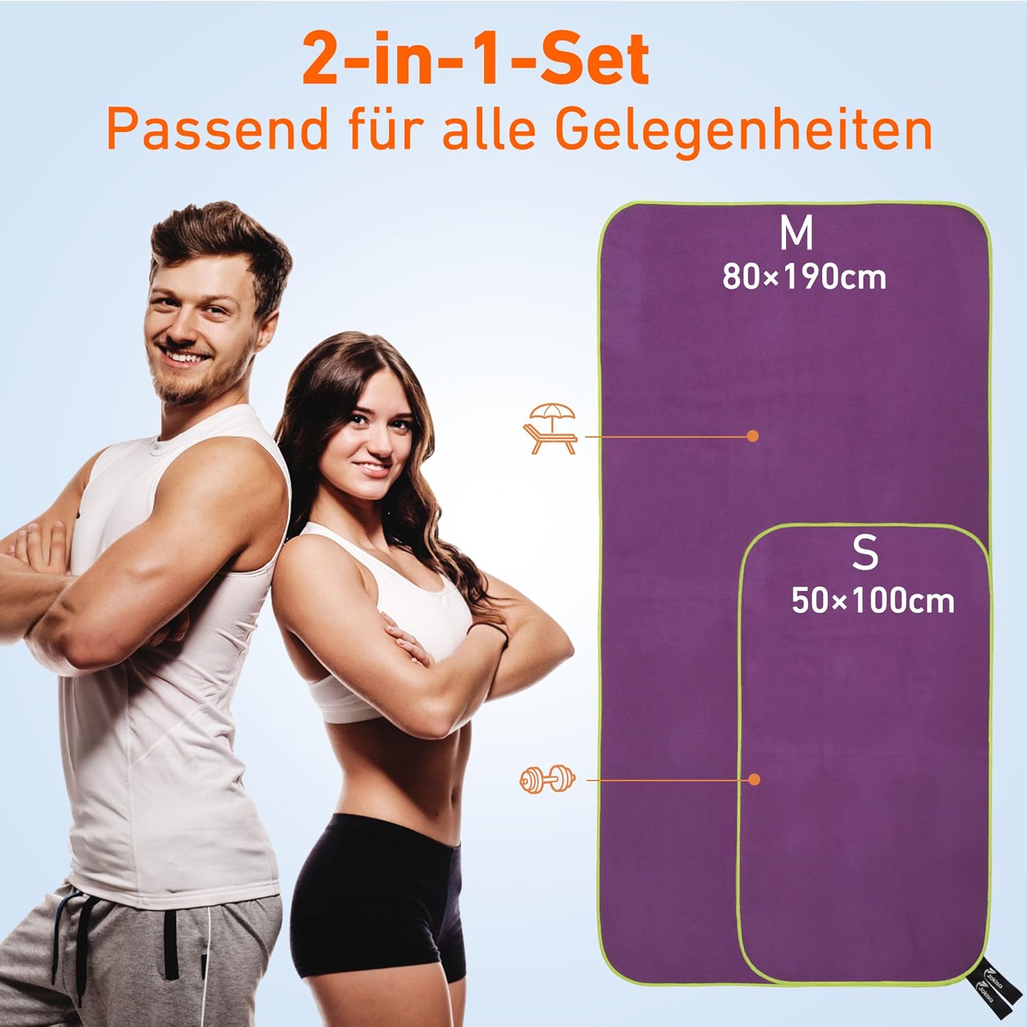 • Комплект от 2 кърпи: ще получите кърпа с размери 180 x 90 см и 100 x 50 см. Този комплект големи микрофибърни кърпи е идеален за всички ваши нужди, независимо дали сте във фитнеса като кърпа за фитнес, за спорт като спортна кърпа за фитнес или като голяма кърпа за плажа. Той предлага перфектната комбинация от размер и функционалност.