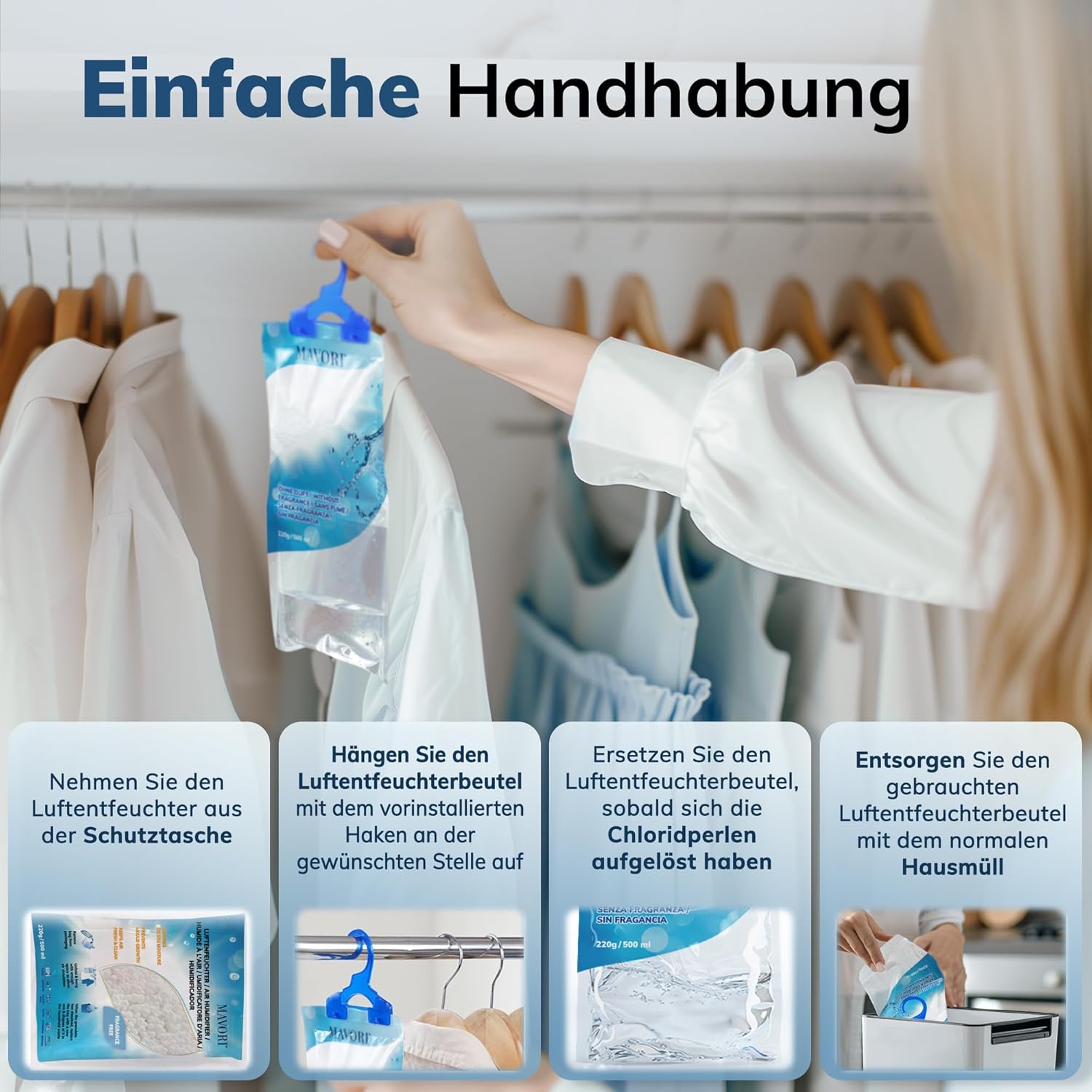 • Съдържание на кутията: ще получите 10 броя. Влагоабсорбатор за стаи и шкафове с 220 г гранули за влагоабсорбатор (калциев хлорид). Висящият влагоабсорбатор е подходящ за помещения с размер до 15 м² и издържа до 6 седмици.