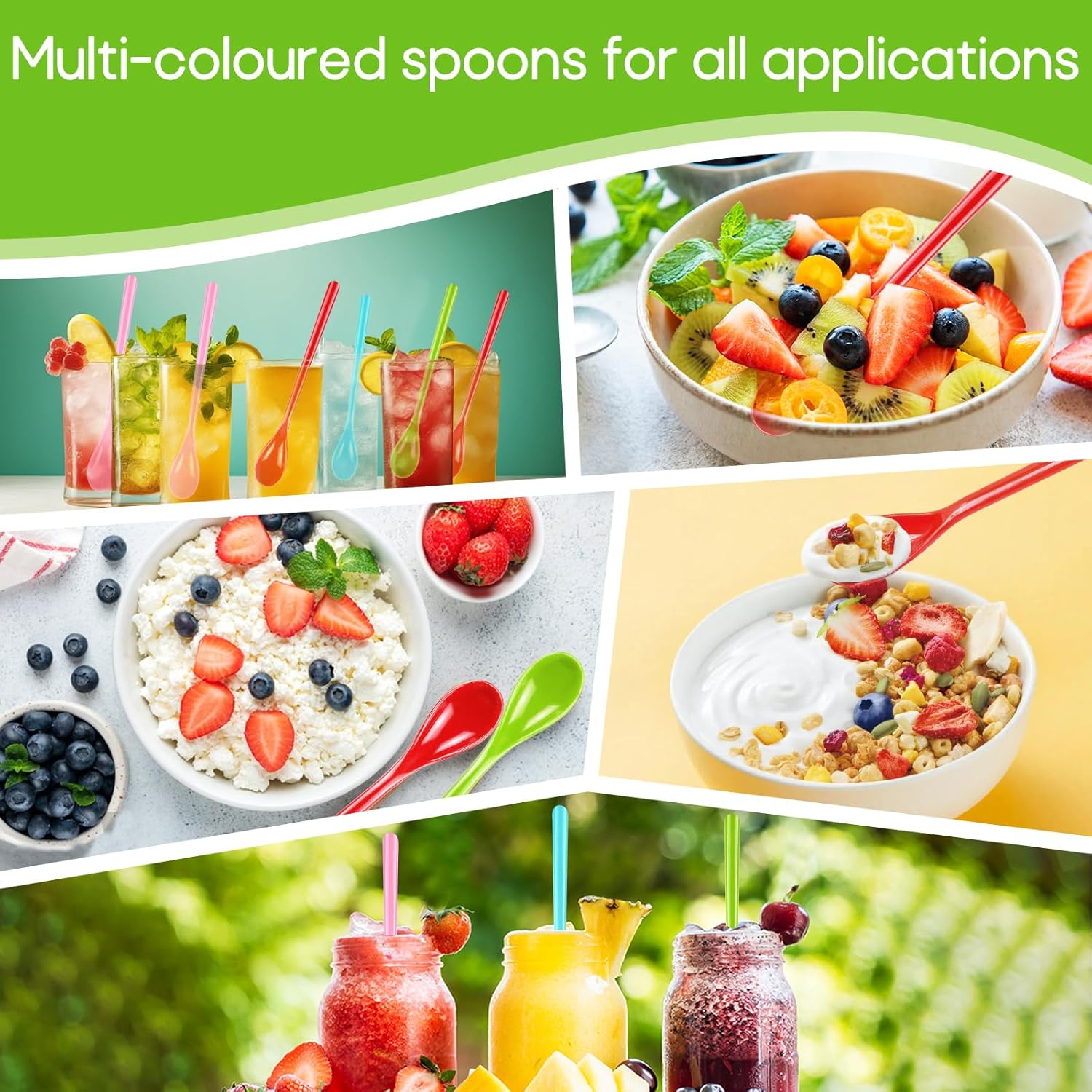 • 【Цветни опции】: Тези дълги пластмасови лъжици за многократна употреба се предлагат в широка гама от живи цветове, включително розово (3 броя), червено (3 броя), тъмносиньо (3 броя) и тревистозелено (3 броя). Ярките цветове не само ще повдигнат настроението ви, но и ще добавят цветен акцент към вашата маса. Идеални за партита, кафенета или домашна употреба.
