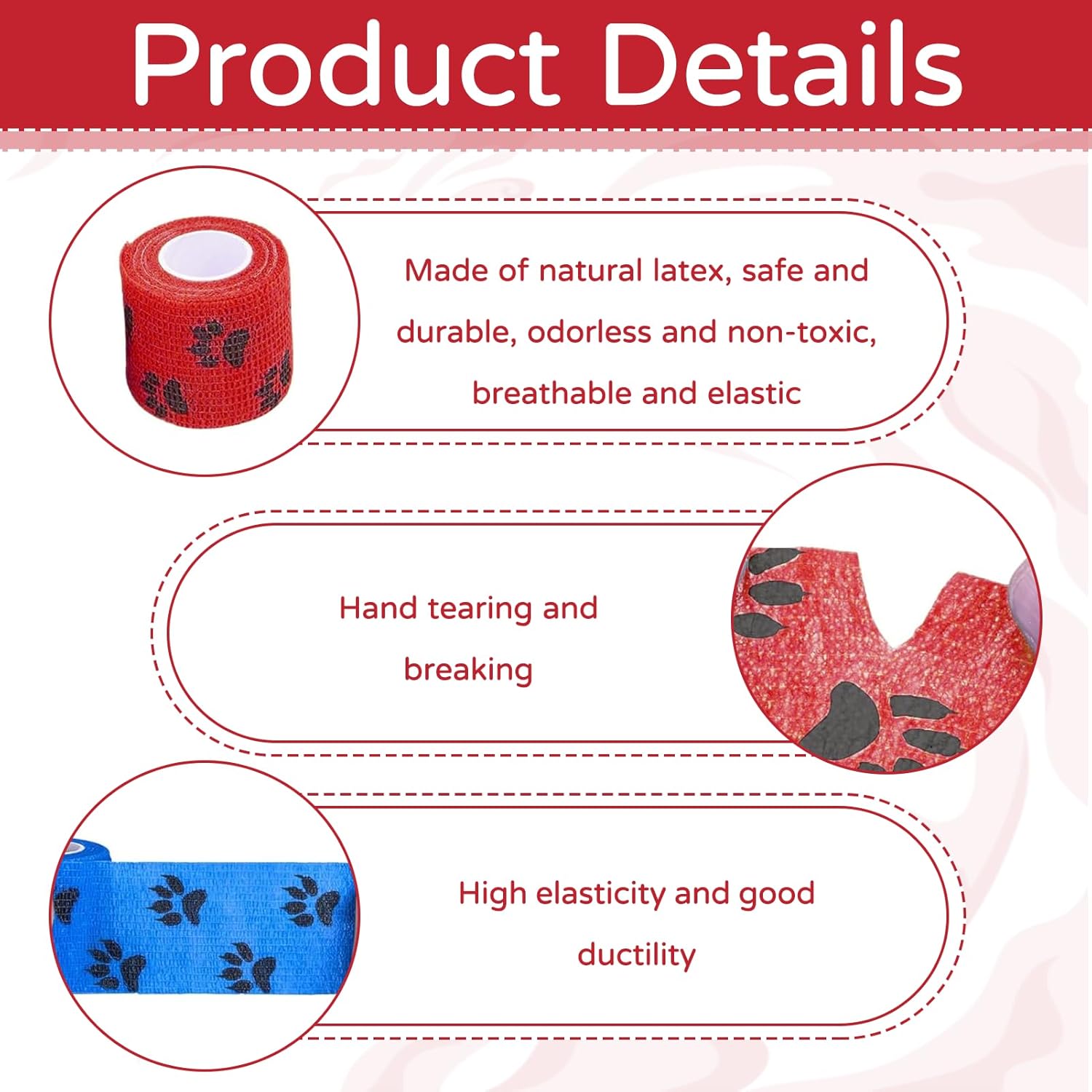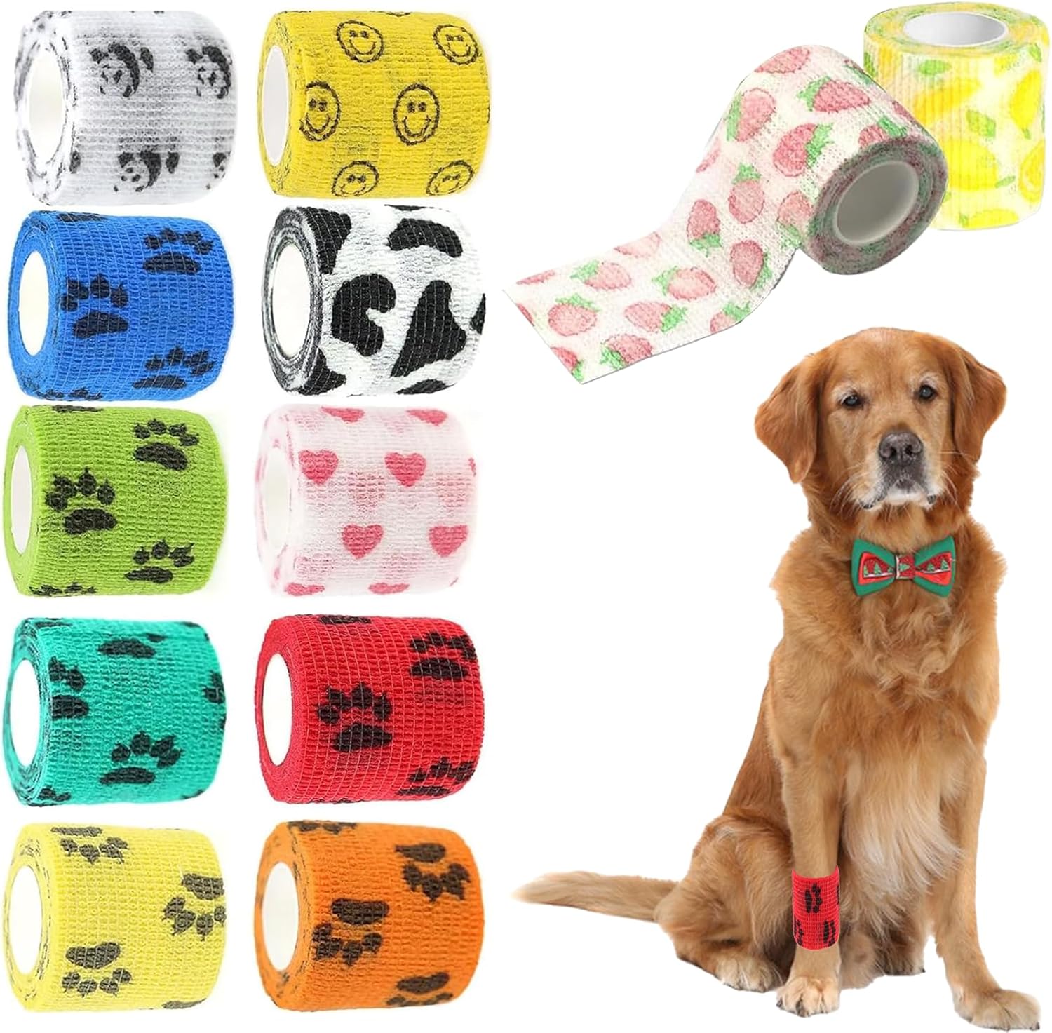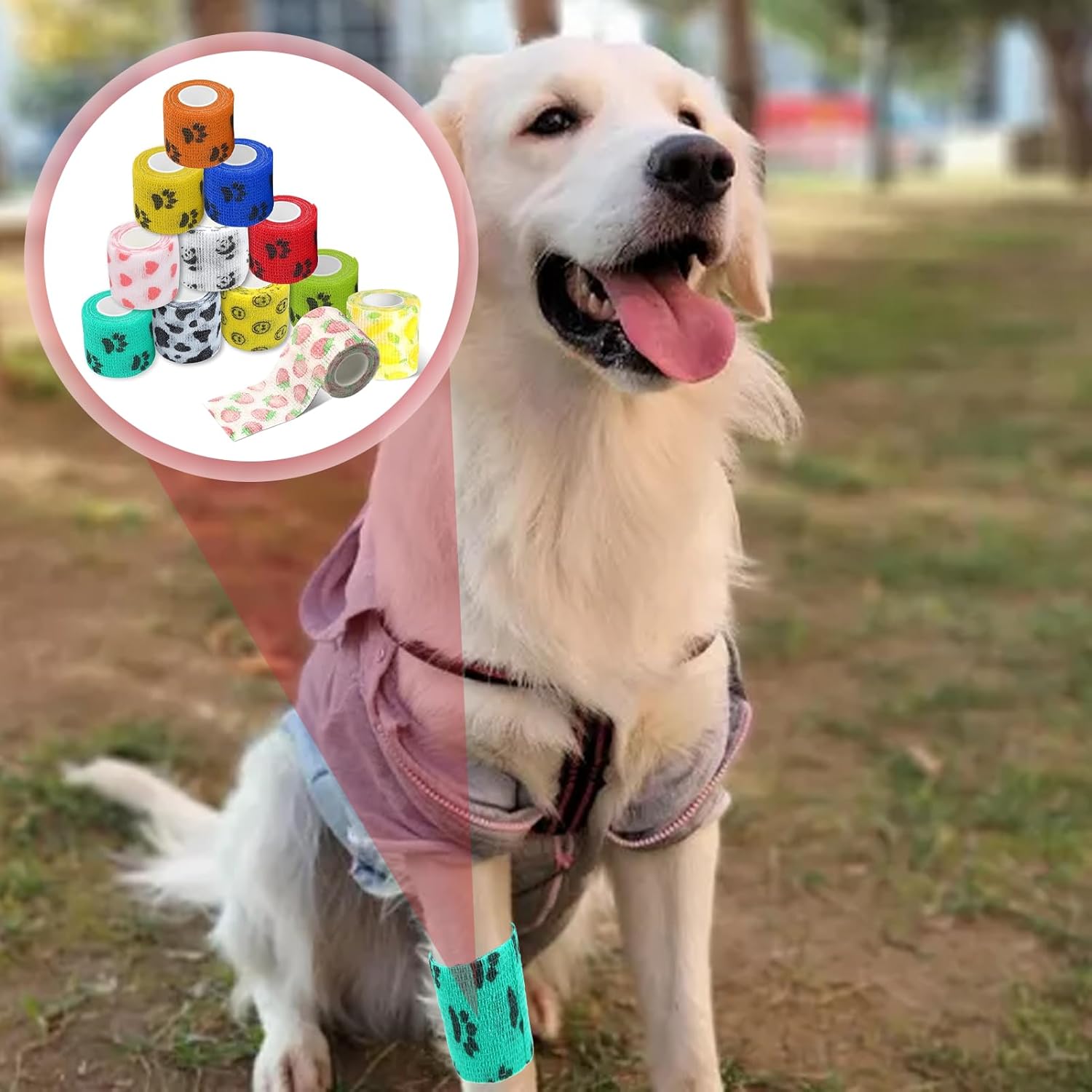 Материал: [Нетъкан текстил] Цвят: [12 цвята] Размер: [2,5 см x 4,5 м] [Щампа] Тази превръзка за кучета с уникалния си щампа не само добавя нотка елегантност към превръзката на вашия домашен любимец, но и я прави уникална. [Висококачествен материал] Тази превръзка за кучета е изработена от нетъкан текстил от естествен латекс и е превръзка против облизване, която може да се носи удобно за продължителни периоди. [Многофункционална] Извитият дизайн на самозалепващата се превръзка приляга перфектно към кожата, не се деформира лесно, не се хлъзга и е дишаща. [Лесна за употреба] Превръзката за кучета може лесно да се отваря на ръка и да се регулира перфектно. Тя осигурява персонализирано и сигурно прилягане за здраво задържане. [Универсална употреба] При наранявания като наранявания на глезена, самозалепващата се превръзка може да се използва за фиксиране, компресия и опора.