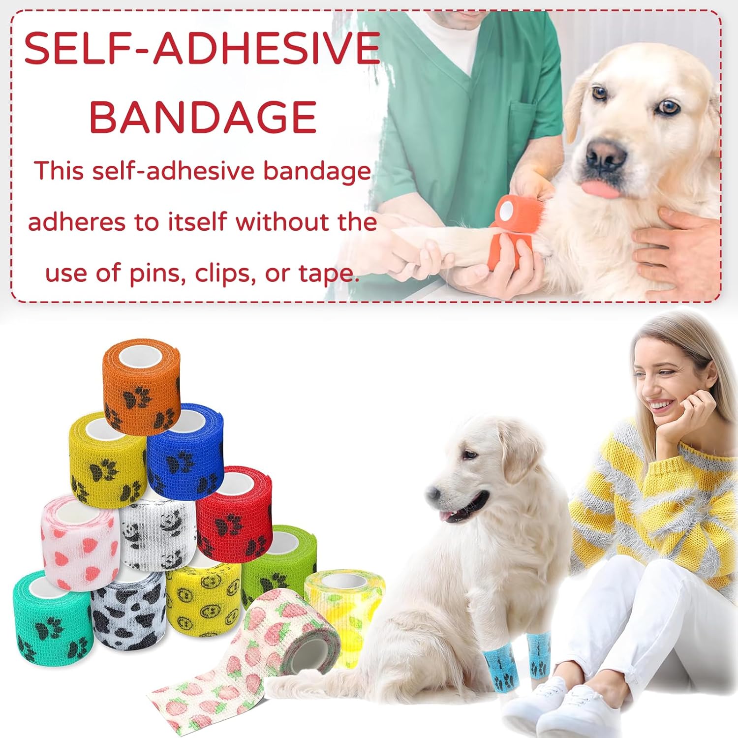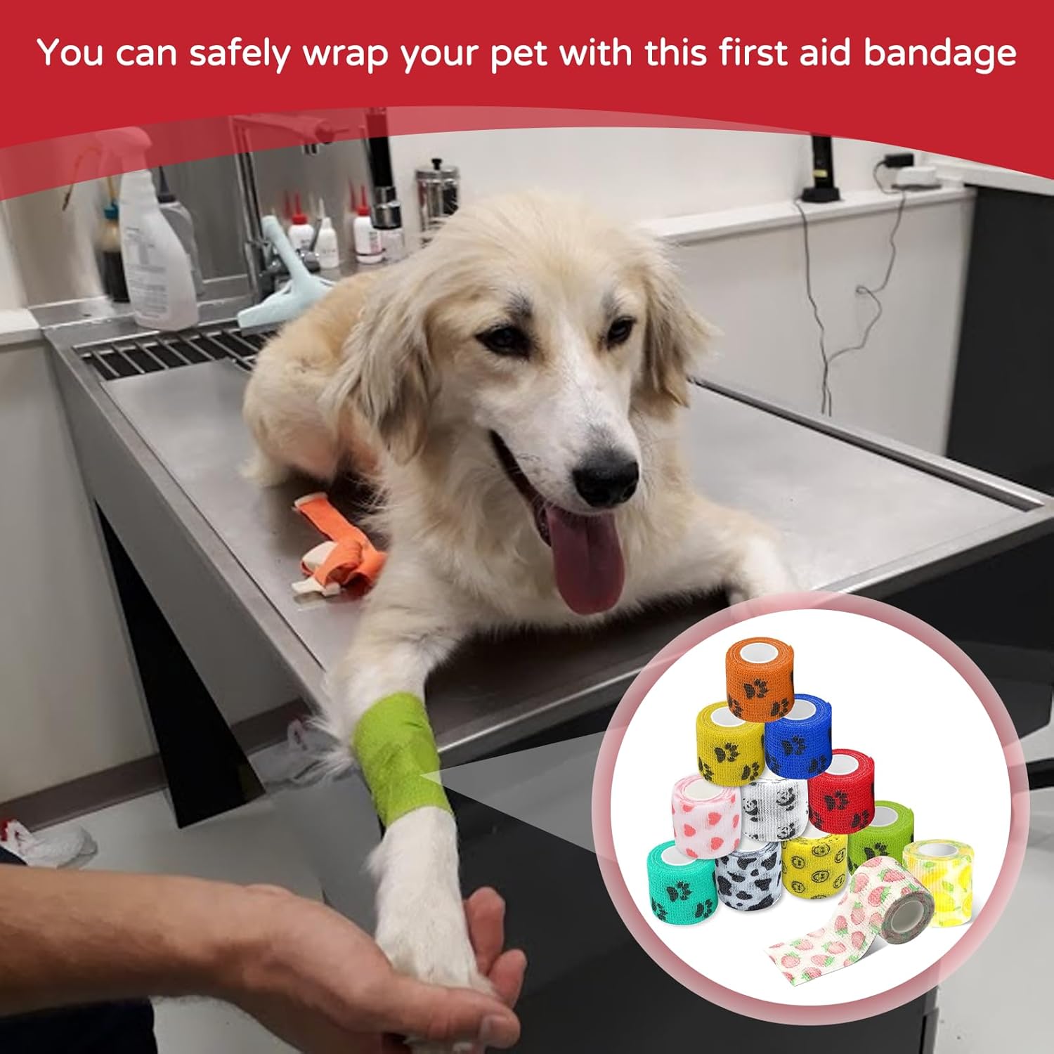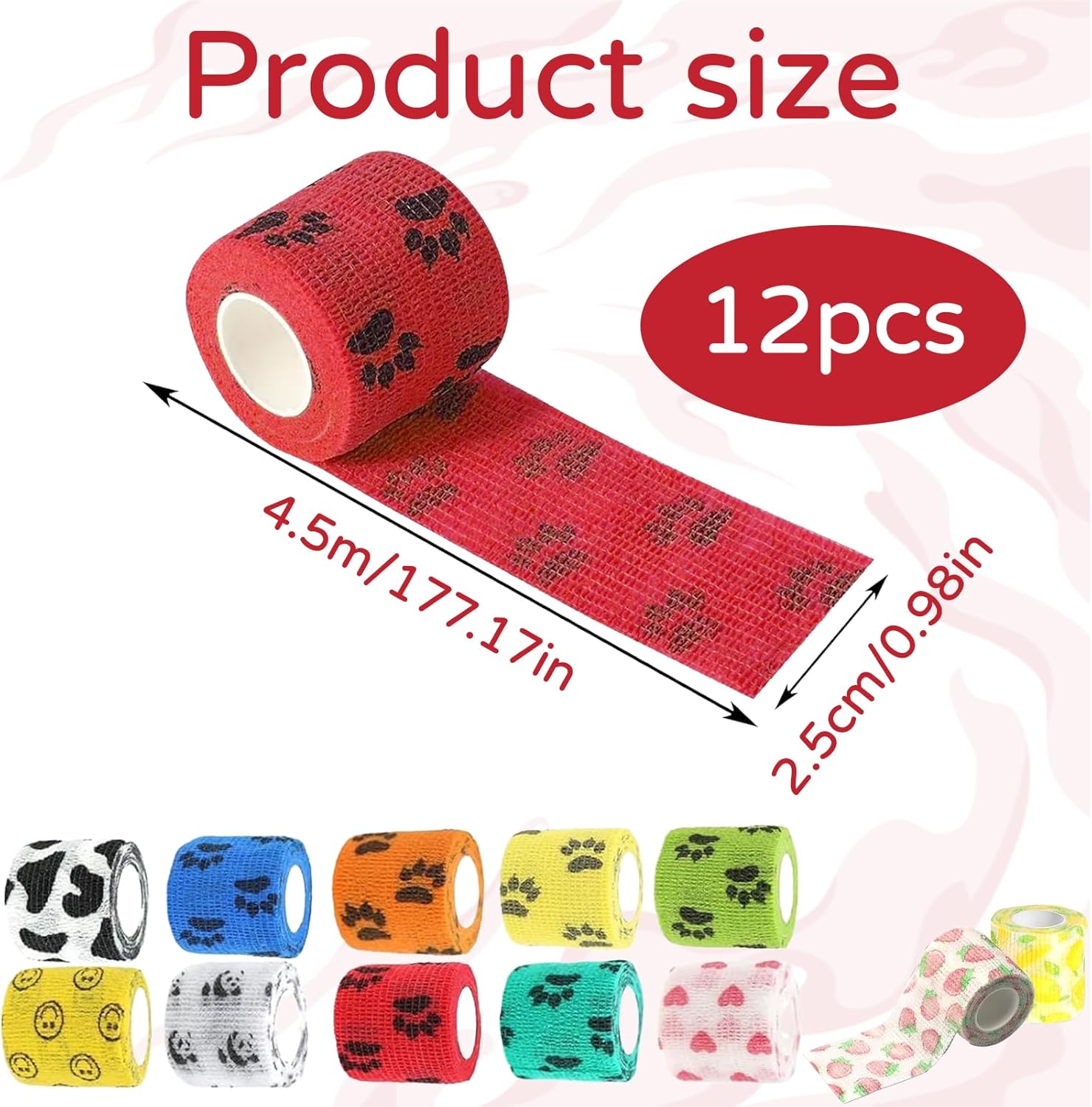 Материал: [Нетъкан текстил] Цвят: [12 цвята] Размер: [2,5 см x 4,5 м] [Щампа] Тази превръзка за кучета с уникалния си щампа не само добавя нотка елегантност към превръзката на вашия домашен любимец, но и я прави уникална. [Висококачествен материал] Тази превръзка за кучета е изработена от нетъкан текстил от естествен латекс и е превръзка против облизване, която може да се носи удобно за продължителни периоди. [Многофункционална] Извитият дизайн на самозалепващата се превръзка приляга перфектно към кожата, не се деформира лесно, не се хлъзга и е дишаща. [Лесна за употреба] Превръзката за кучета може лесно да се отваря на ръка и да се регулира перфектно. Тя осигурява персонализирано и сигурно прилягане за здраво задържане. [Универсална употреба] При наранявания като наранявания на глезена, самозалепващата се превръзка може да се използва за фиксиране, компресия и опора.