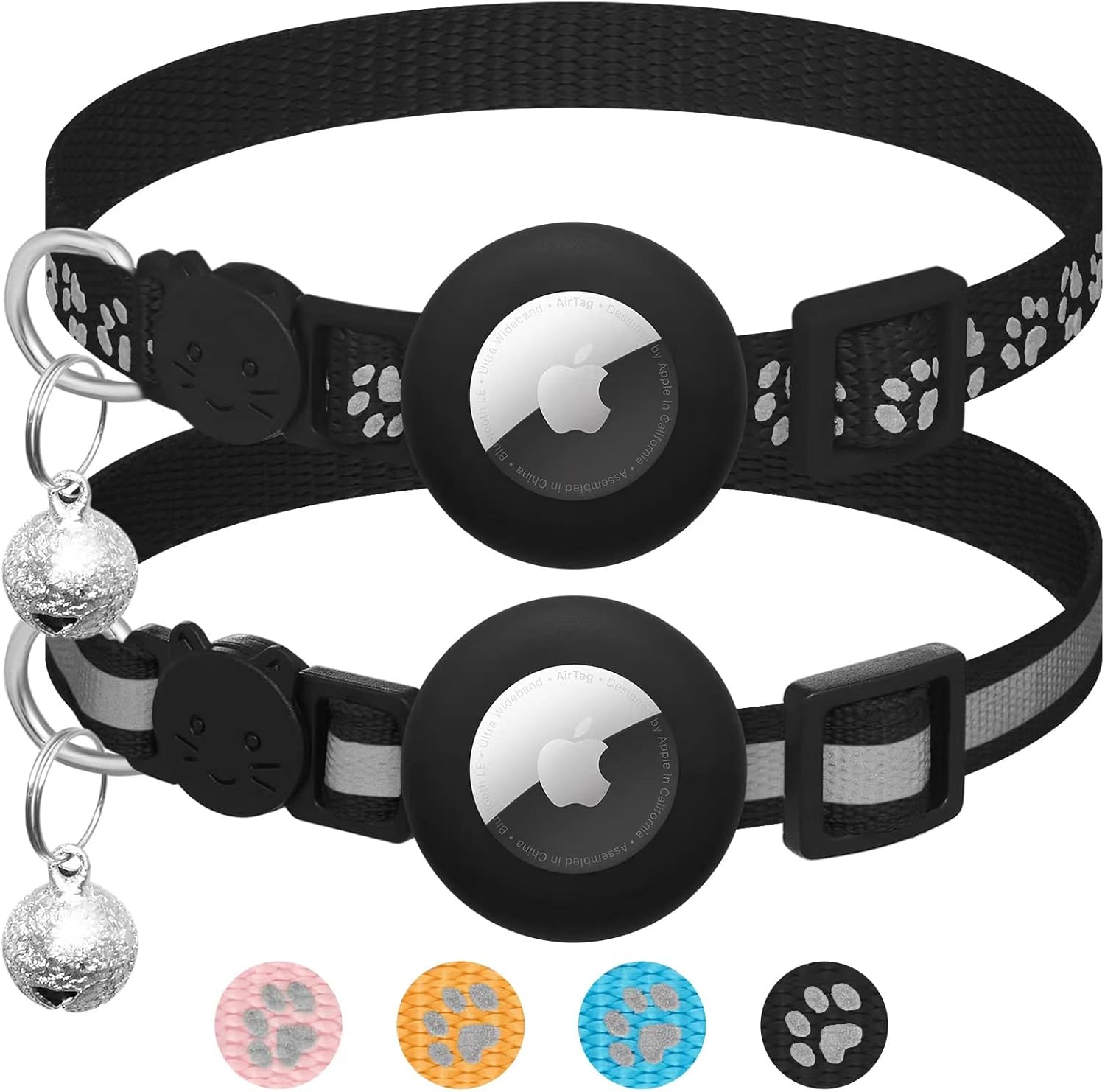 Комплект от 2 броя, съвместим с Airtag нашийник за котки със звънец, отразяващ GPS тракер за котки, съвместим с Apple Airtag калъф, персонализиран, съвместим с Airtag нашийник за котки с предпазна закопчалка
