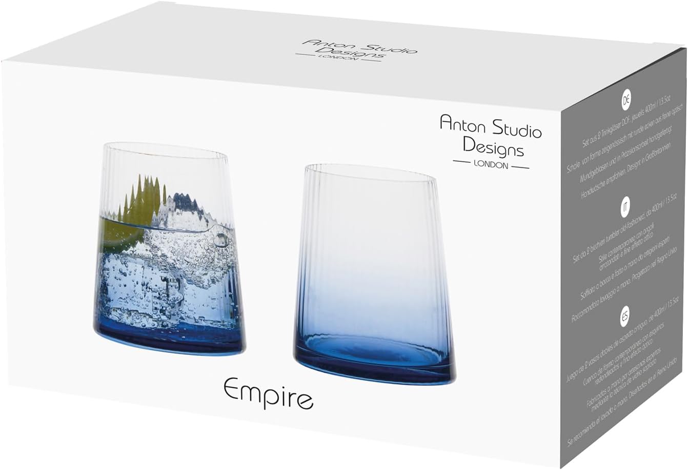 • СЕРИЯ EMPIRE: Тази изящна серия стъклени изделия представя ръчно издухани и изработени дизайни. Колекцията Empire въплъщава модерността с гама от заострени и ъглови дизайни. Ще откриете характерен вертикален мотив, който се простира нагоре и надолу по всяка чаша, излъчвайки изтънченост и оригиналност. Специализирана в стъклените изделия, серията Empire от Anton Studio Designs включва чаши за флейти, чаши за вино, чаши за джин, хайбол и DOF чаши, образуващи фантастичен завършен комплект.