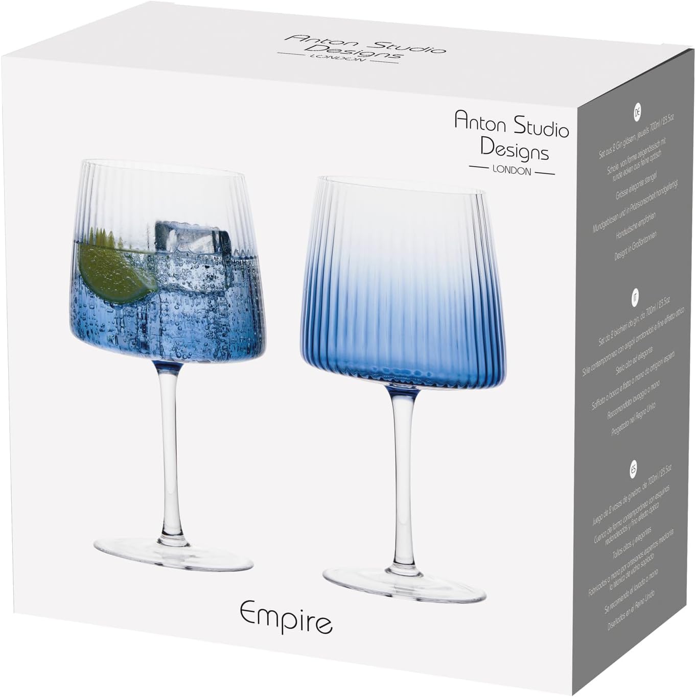 • СЕРИЯ EMPIRE: Тази изящна серия стъклени изделия представя ръчно издухани и изработени дизайни. Колекцията Empire въплъщава модерността с гама от заострени и ъглови дизайни. Ще откриете характерен вертикален мотив, който се простира нагоре и надолу по всяка чаша, излъчвайки изтънченост и оригиналност. Специализирана в стъклените изделия, серията Empire от Anton Studio Designs включва чаши за флейти, чаши за вино, чаши за джин, хайбол и DOF чаши, образуващи фантастичен завършен комплект.