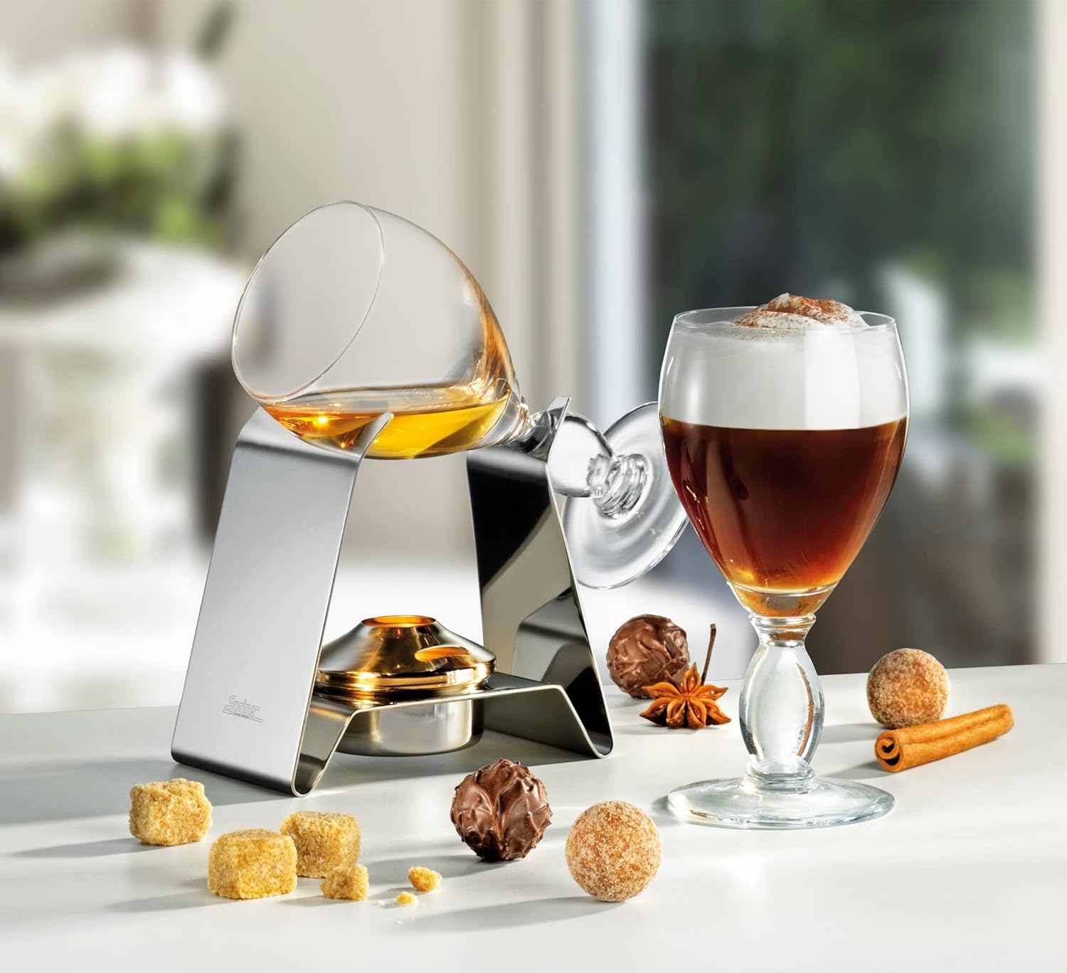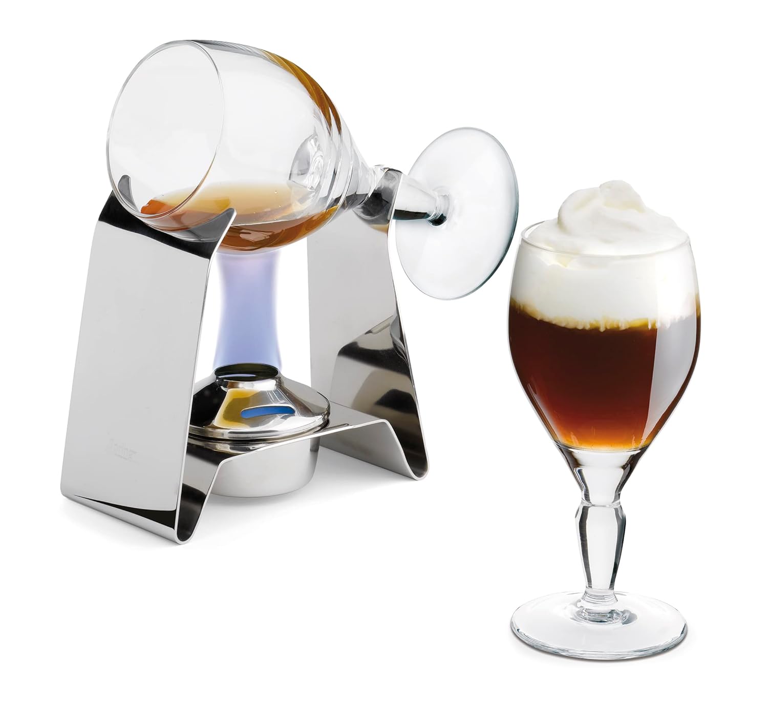 Западна Ирландия, 1942 г. Главният готвач Джоузеф Шеридан сервира на гостите си в ресторанта на летището подсладено кафе с шот ирландско уиски и лъжичка бита сметана. Сега ценителите по целия свят са във възторг от неговото творение. Комплектът за ирландско кафе от Spring е идеален за всеки, който иска да приготви това емблематично кафе у дома. Той включва две термоустойчиви чаши с форма на лале и нагревател от неръждаема стомана. Нагревателят стои здраво на масата или плота. Загрейте уискито над нагревателя и веднага напълнете чашата с подсладено, горещо кафе. Дръжте чаена лъжичка с дъното нагоре над чашата и бавно изсипете полуразбитата сметана. Спрете! Сега, моля, не бъркайте, просто се насладете на тази вкусна напитка.