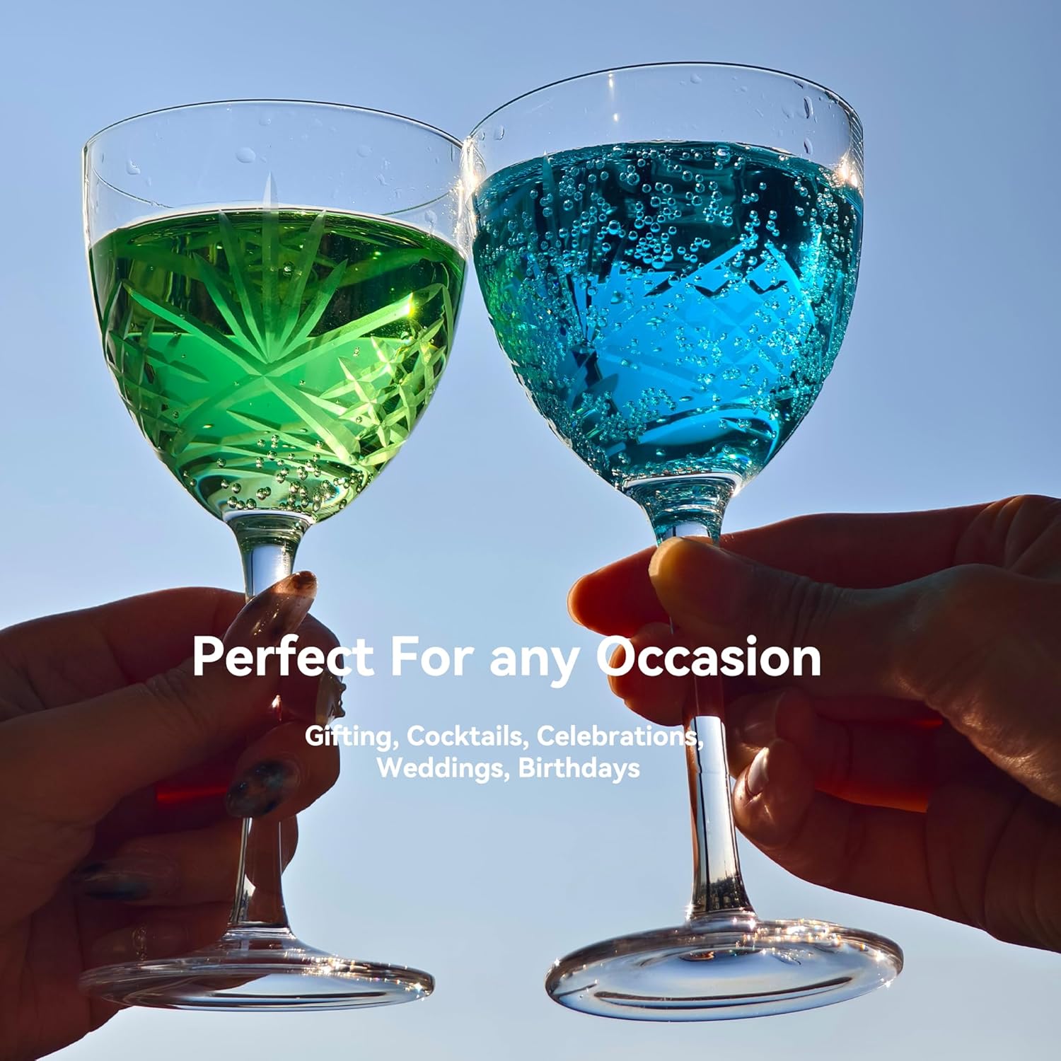 • [Бляскаво и искрящо] – Всяка чаша е ръчно изработена от безоловно кристално стъкло с деликатно гравиране (листни и геометрични шарки), което отразява светлината и кара коктейлите ви да искрят. Ергономичната форма стои удобно в ръката – идеална за дълги празненства!