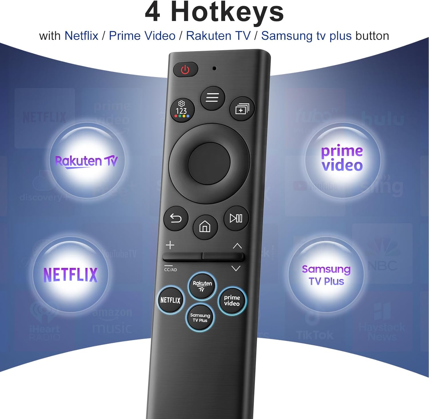 • 4 бързи клавиша: дистанционното управление е оборудвано с 4 популярни бутона за стрийминг, включително Netflix, Prime-video, Rakuten TV и Samsung TV plus, за да можете лесно да превключвате към любимото си приложение.