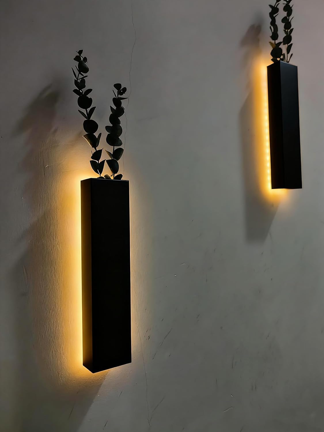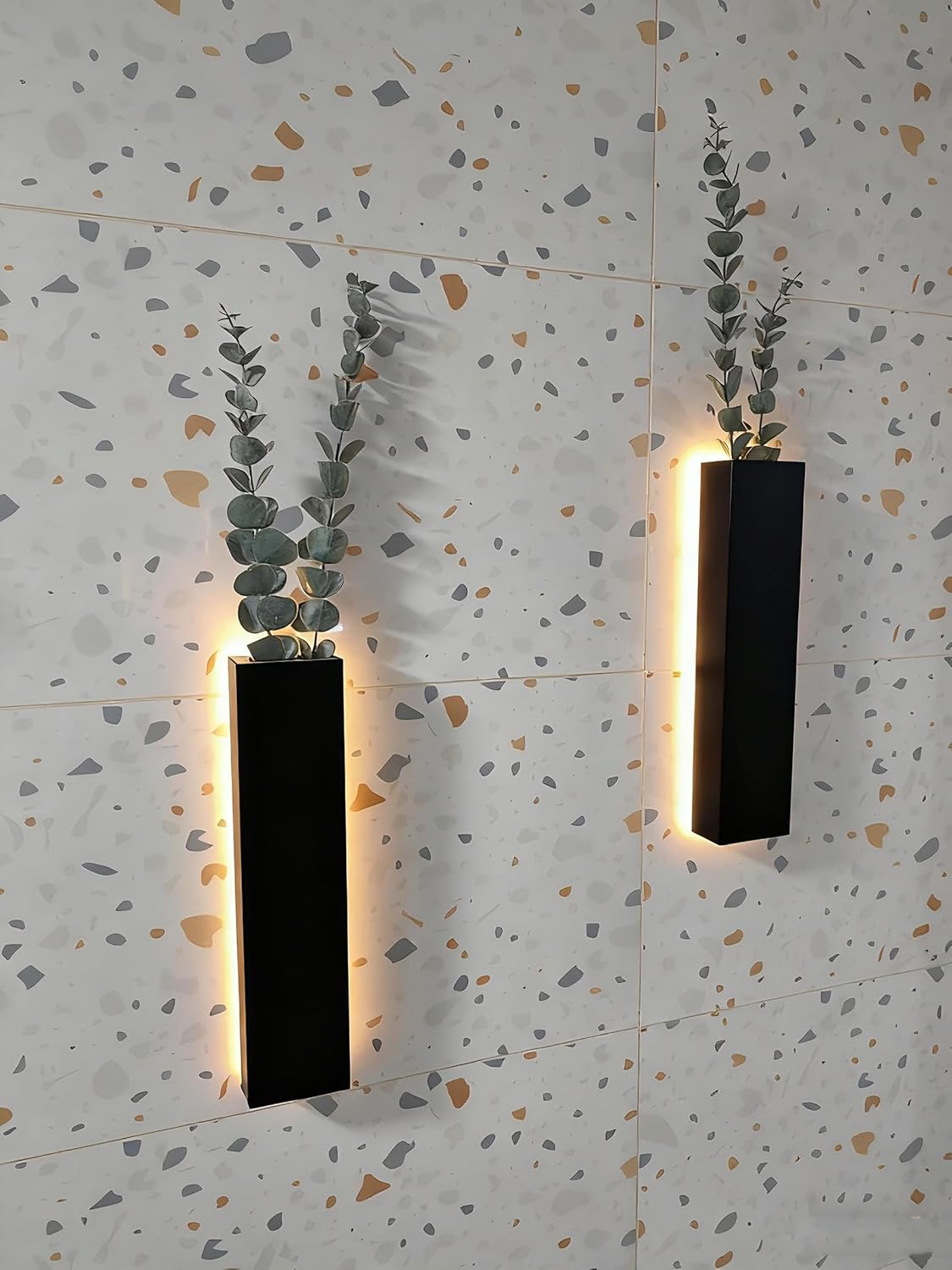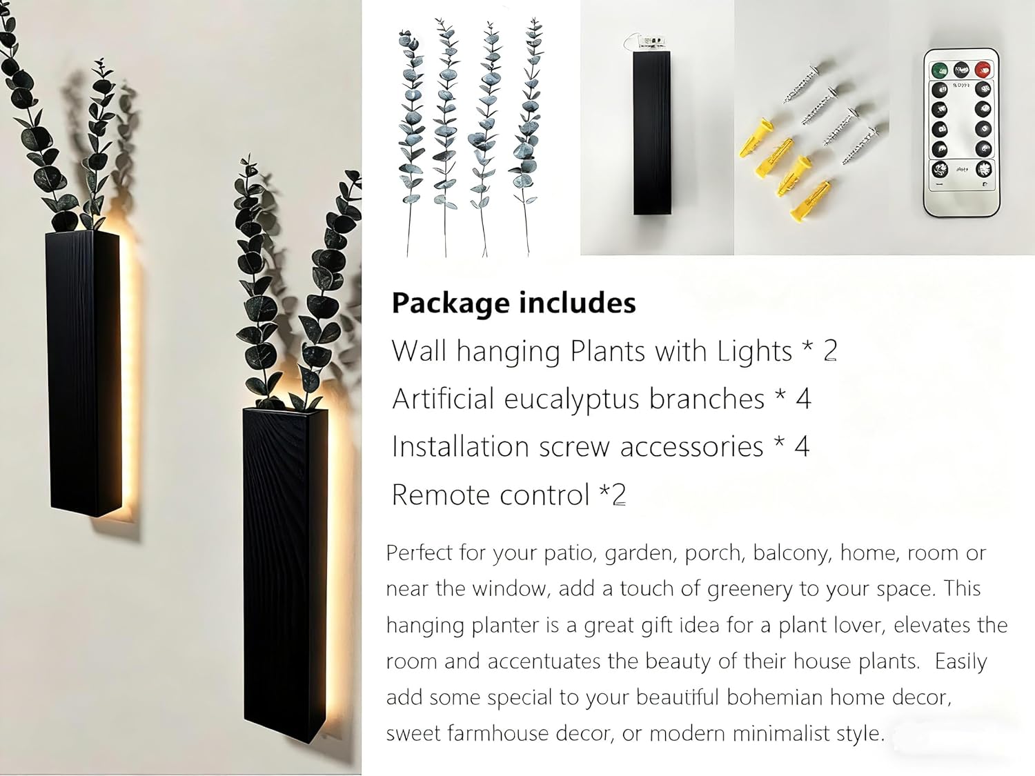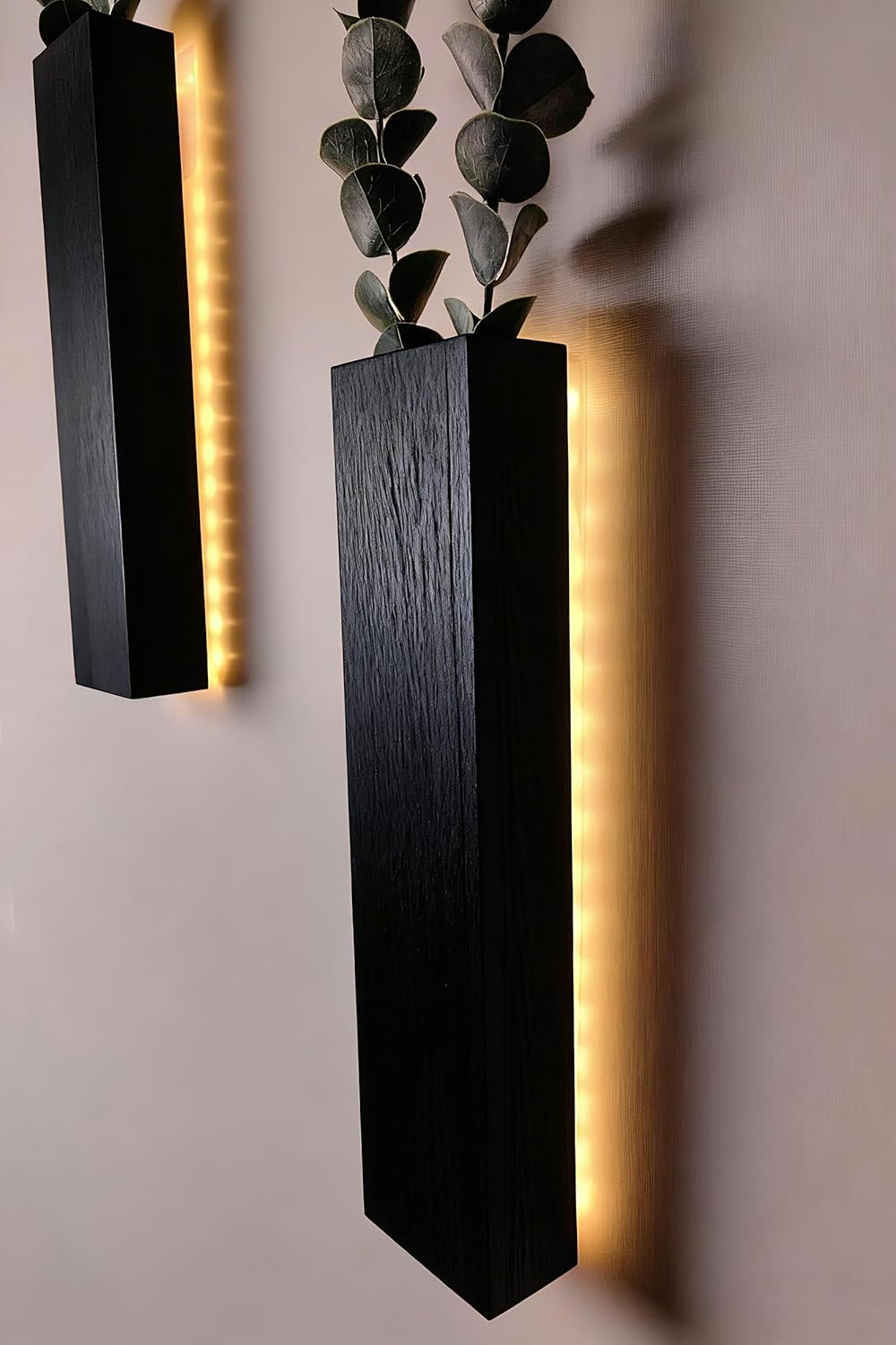 • LED дървена стенна ваза за декорация - Тези тънки дървени стенни вази с LED светлини и 4 парчета изкуствен евкалипт са перфектната декорация за всяка стена във вашия дом или офис. Те добавят характер към вашата галерия, спалня, нощно шкафче, хол, трапезария, кухня, баня, двор, спалня, входно пространство, общежитие или офис.