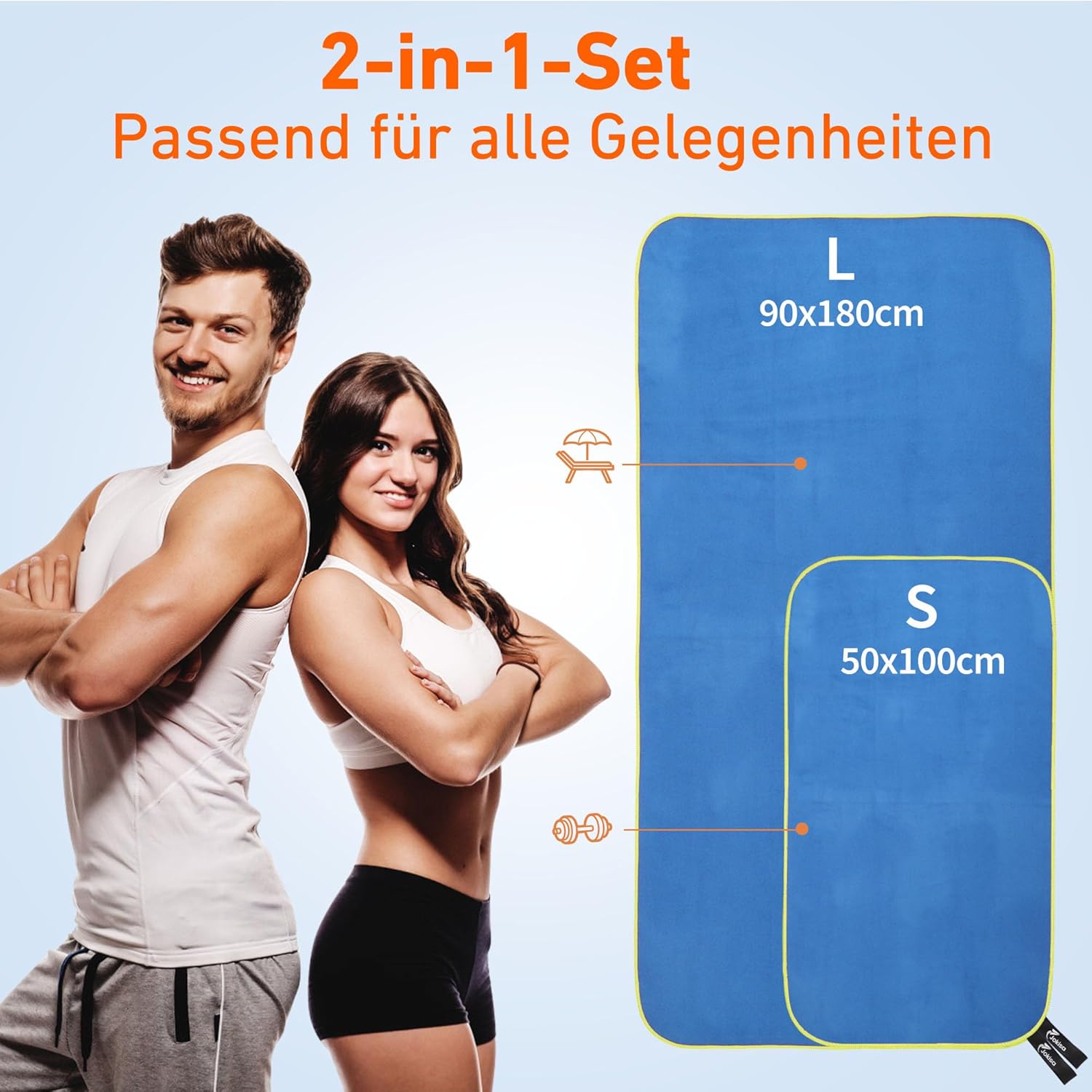 • Комплект от 2 кърпи: ще получите кърпа с размери 180 x 90 см и 100 x 50 см. Този комплект големи микрофибърни кърпи е идеален за всички ваши нужди, независимо дали сте във фитнеса като кърпа за фитнес, за спорт като спортна кърпа за фитнес или като голяма кърпа за плажа. Той предлага перфектната комбинация от размер и функционалност.