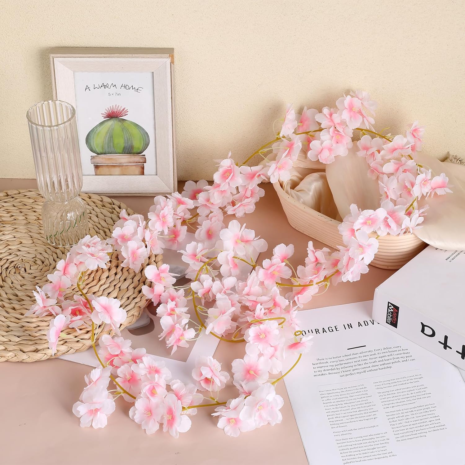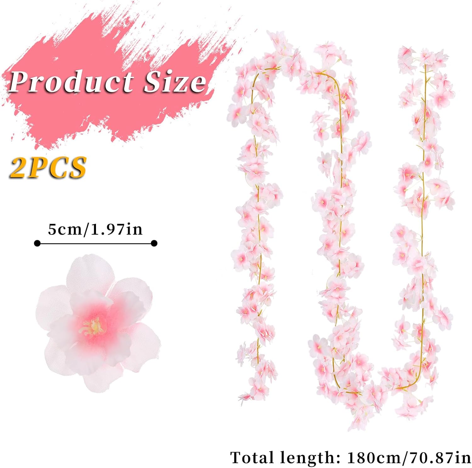 • Изкуствена лоза Сакура: Пакетът съдържа 2 изкуствени лози от черешов цвят с дължина 1,8 м всяка и около 144 малки черешови цвята. Дължината е подходяща за повечето сцени.