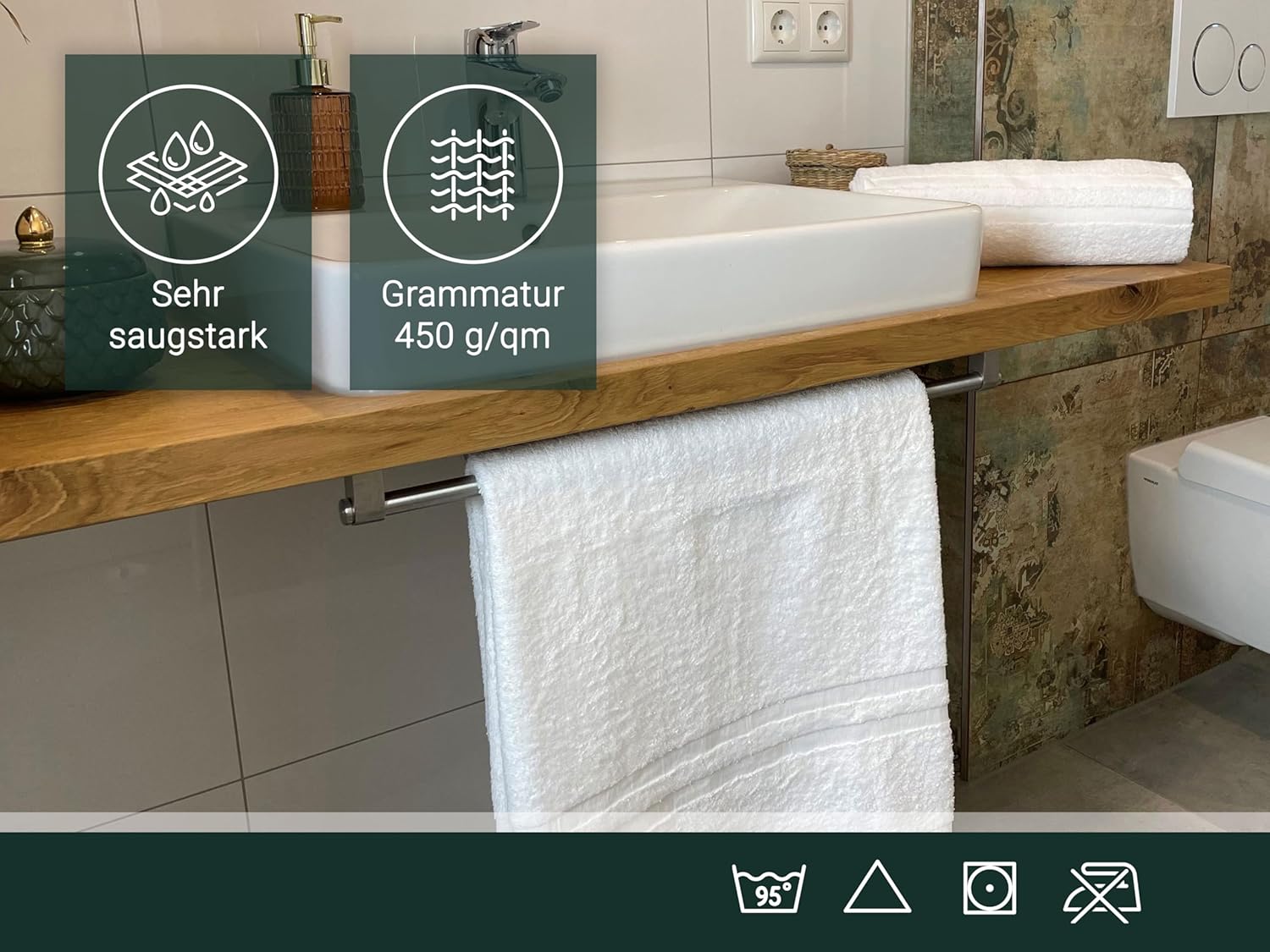 Петната нямат шанс с тези кърпи за миене. Кърпата, продавана милиони пъти в хотелската зона, е лесна за почистване, може да се пере до 95°C, устойчива е на варене и може да се суши в сушилня. Серията Amalfi се предлага в много други размери. От размер приблизително 50 x 100 см, кърпите имат красив и фин раиран бордюр.