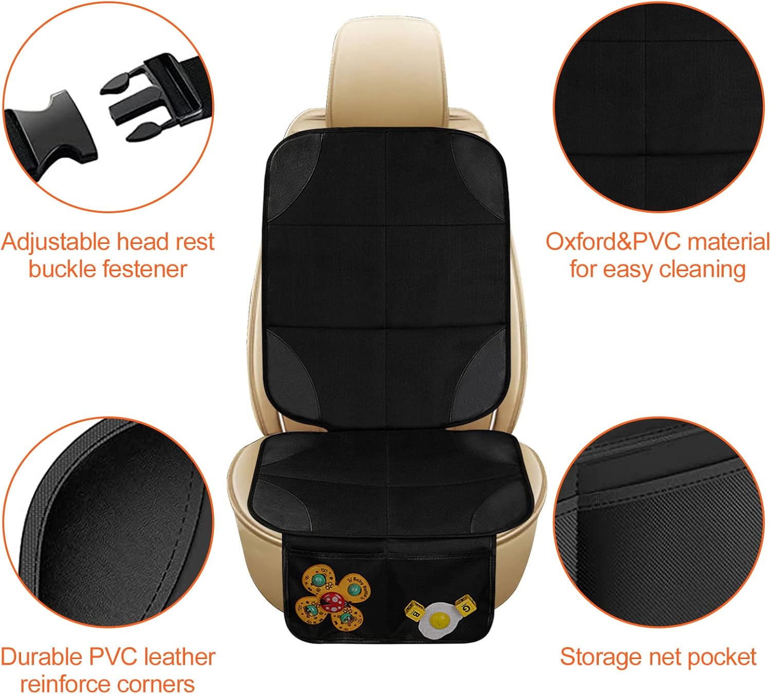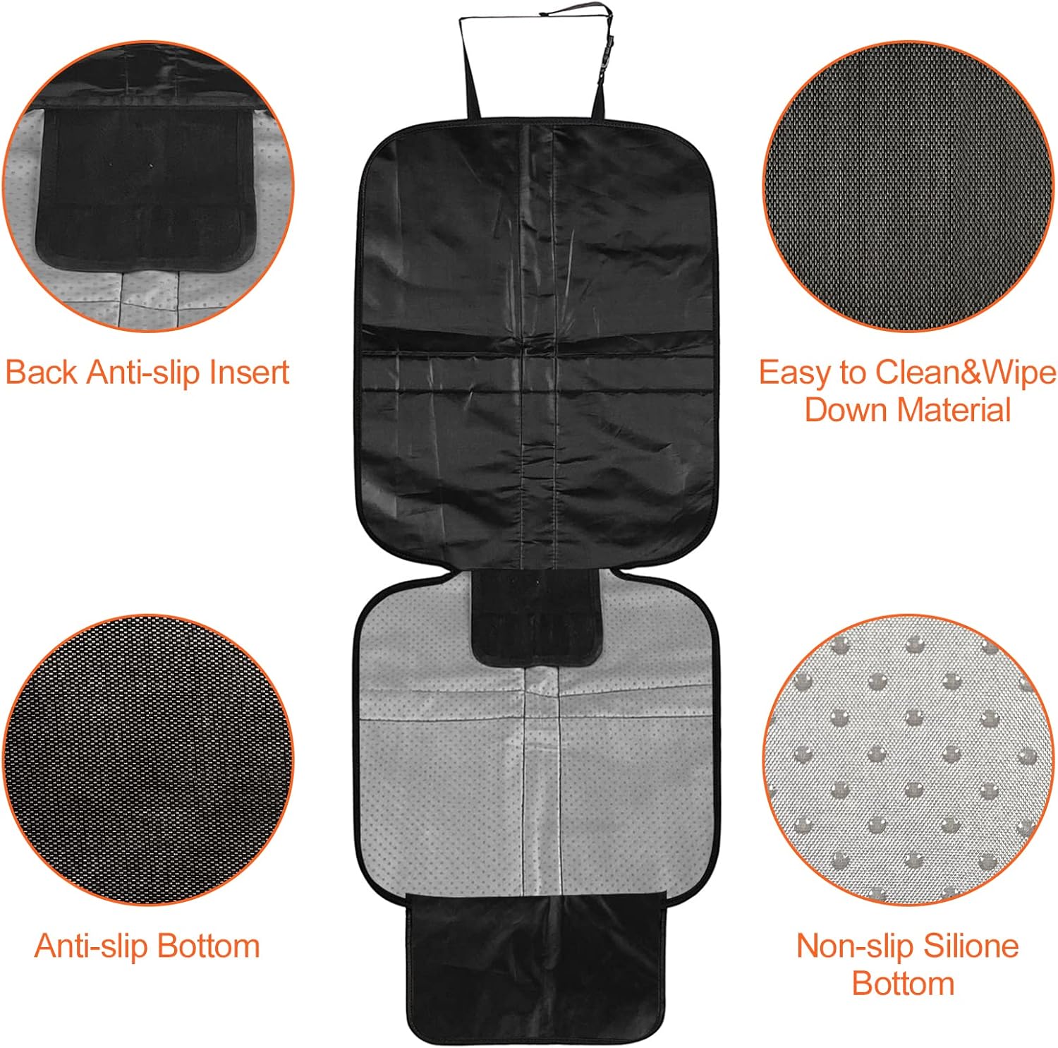 • Безопасност и без хлъзгане: калъфът за столчето за кола е оборудван с регулируема катарама за облегалката за глава, която може да се закрепи много здраво към облегалката за глава на столчето за кола. На гърба има силиконови точки против хлъзгане, които могат да подобрят сцеплението и да гарантират, че калъфът за столче за кола не се хлъзга.