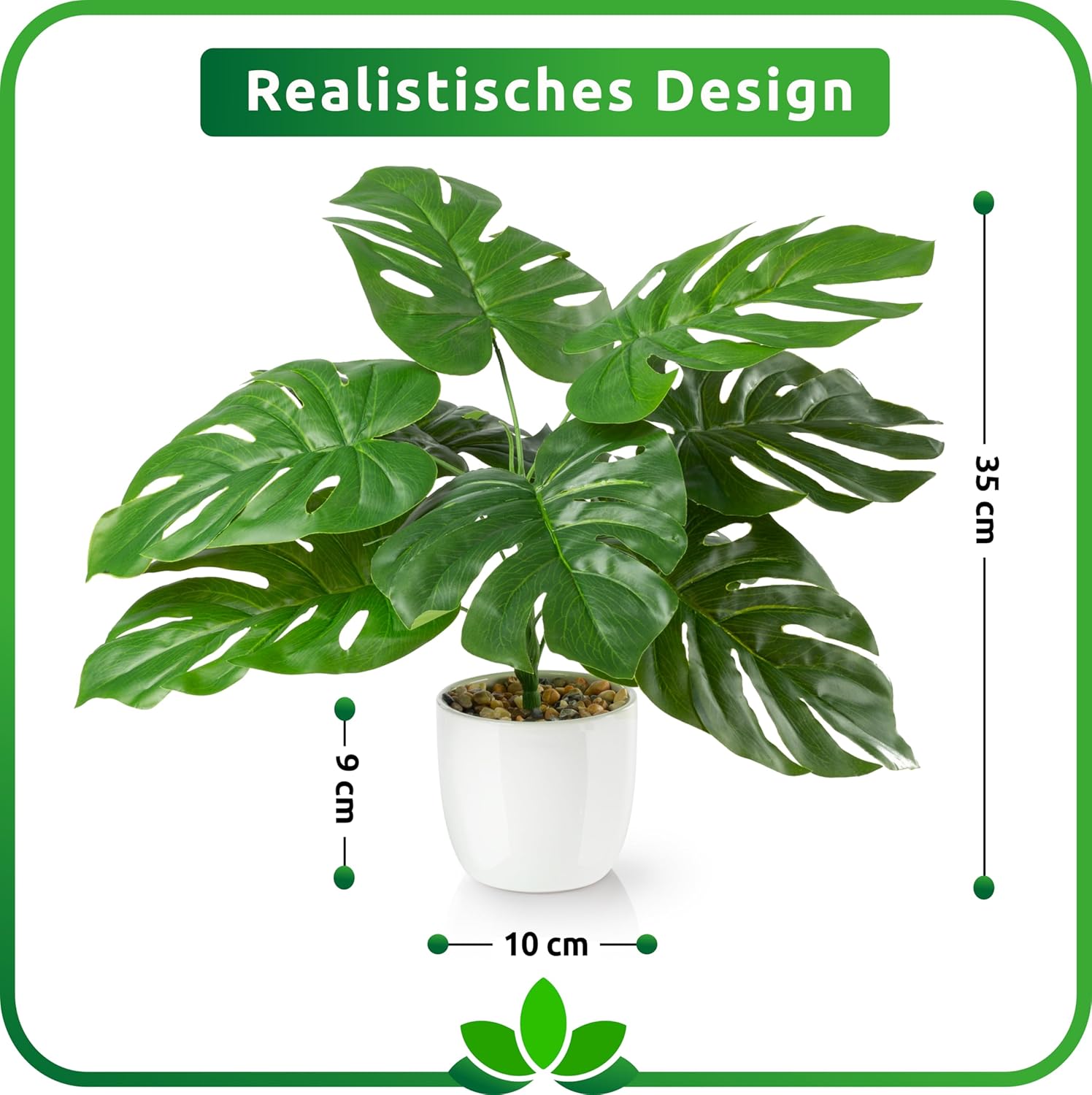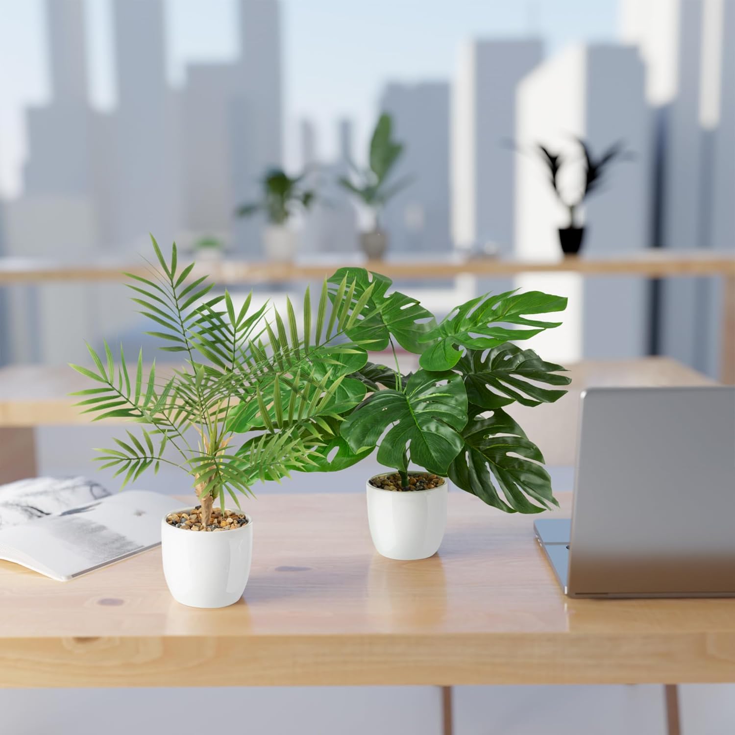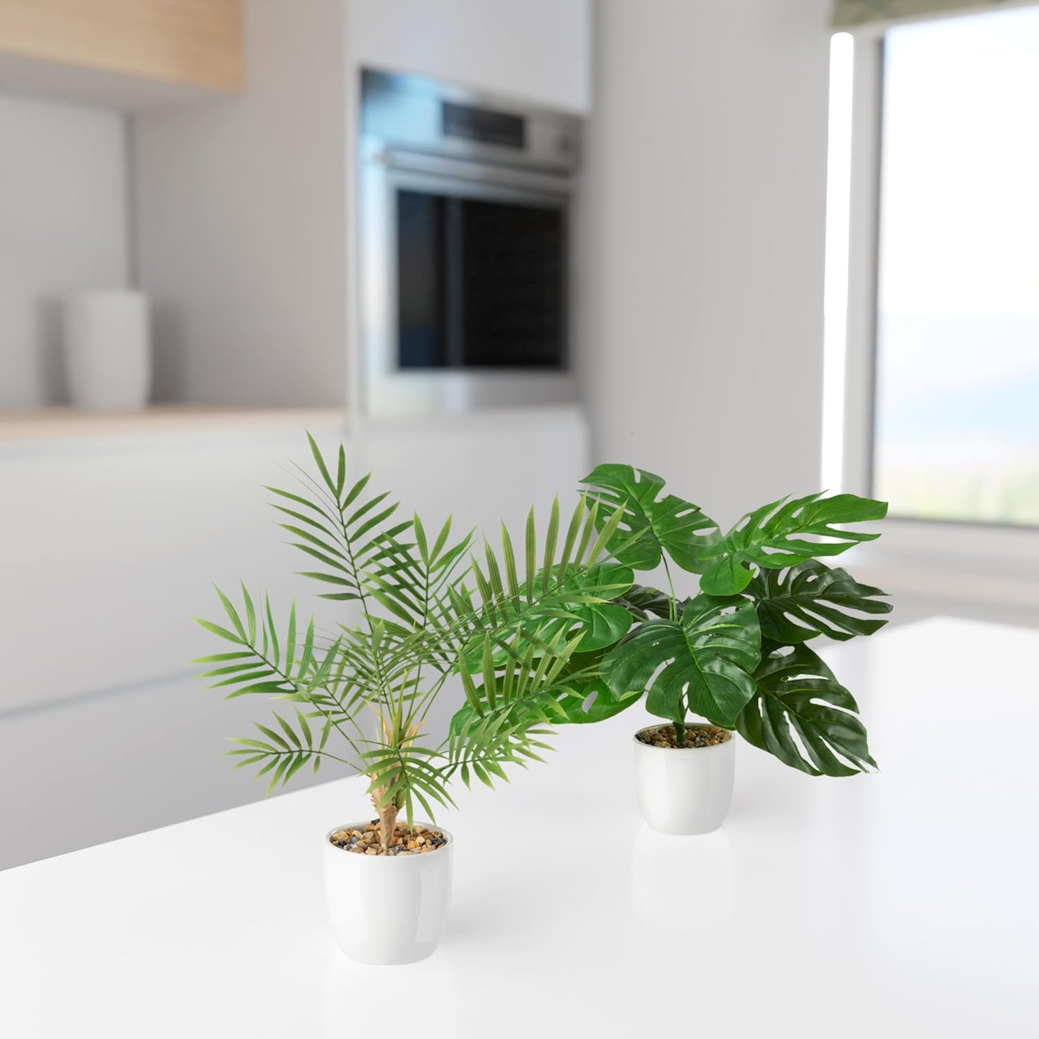 Комплект от 2 изкуствени палми PASCH - монстера и арека (35 см) в бели керамични саксии: Изкуствени растения като истински изкуствени растения в саксия + изкуствено палмово дърво, изкуствени цветя в саксия