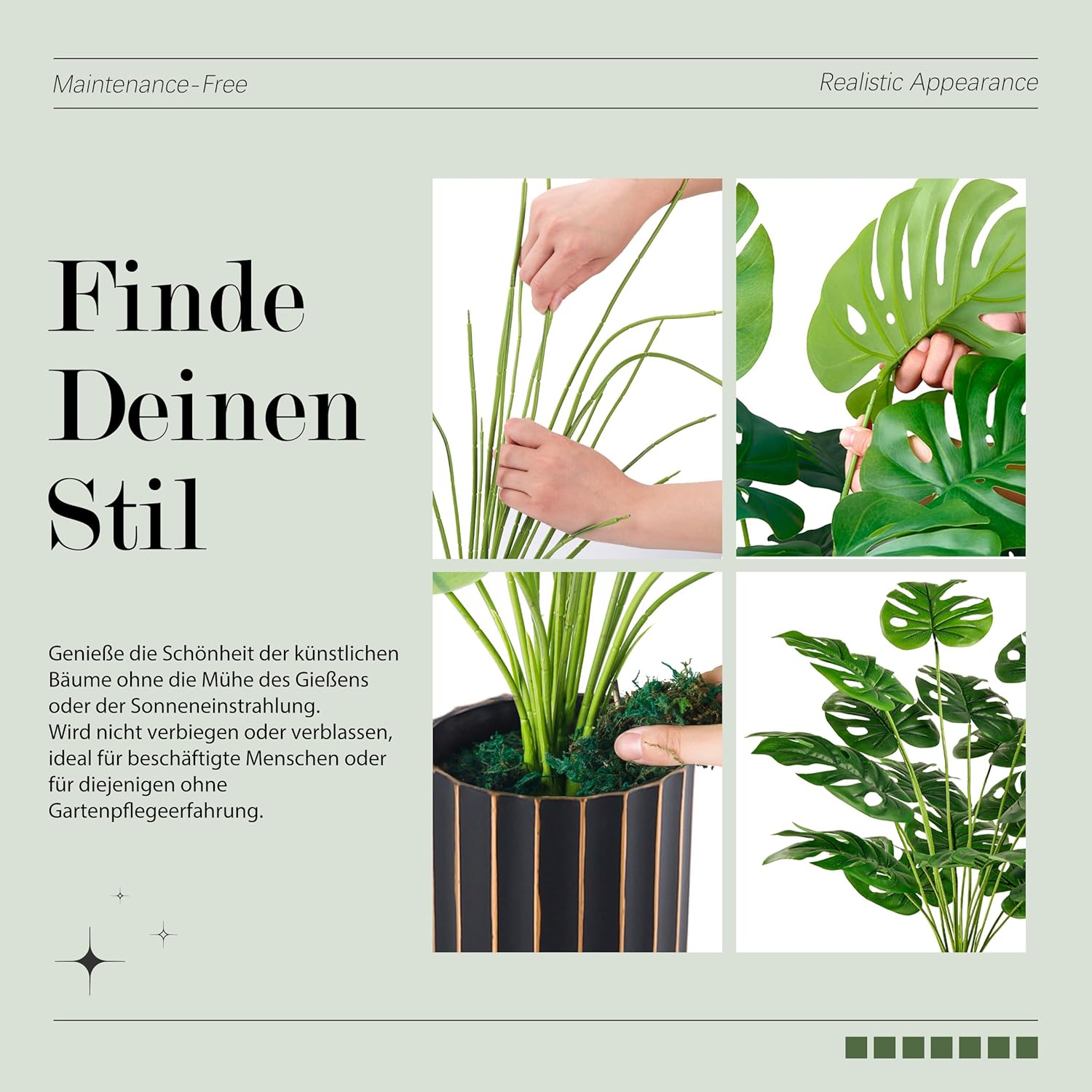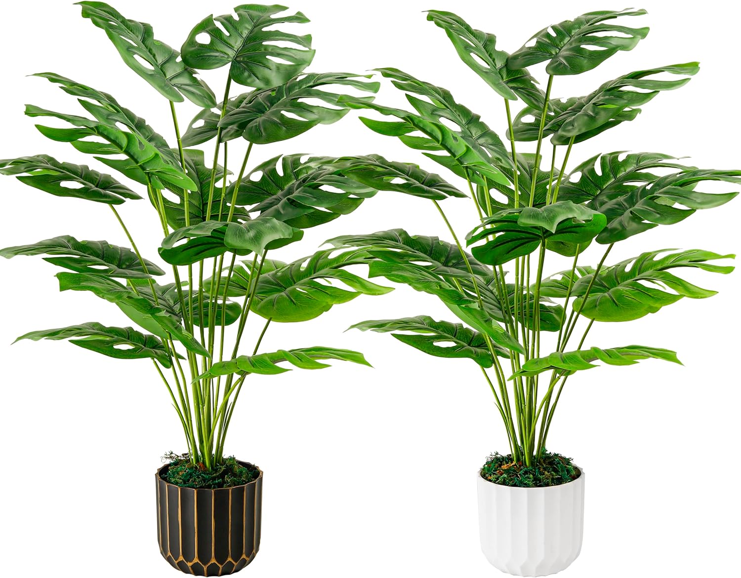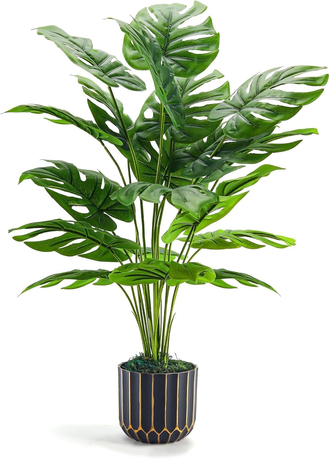 • РАЗМЕР И СТИЛ Саксиите са с височина 12,2 см, ширина 10,9 см, растенията монстера са високи 72 см, нашите изкуствени растения за стайно ползване са перфектно пропорционирани, за да се поберат на всеки рафт или бюро. Уникалният дизайн на саксиите в черно и златисто добавя първокласна красота към вашия дом.