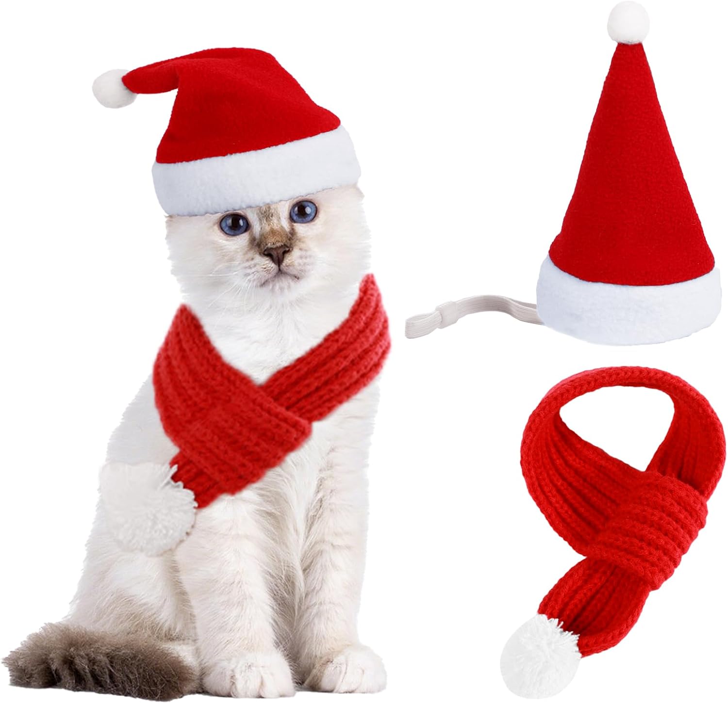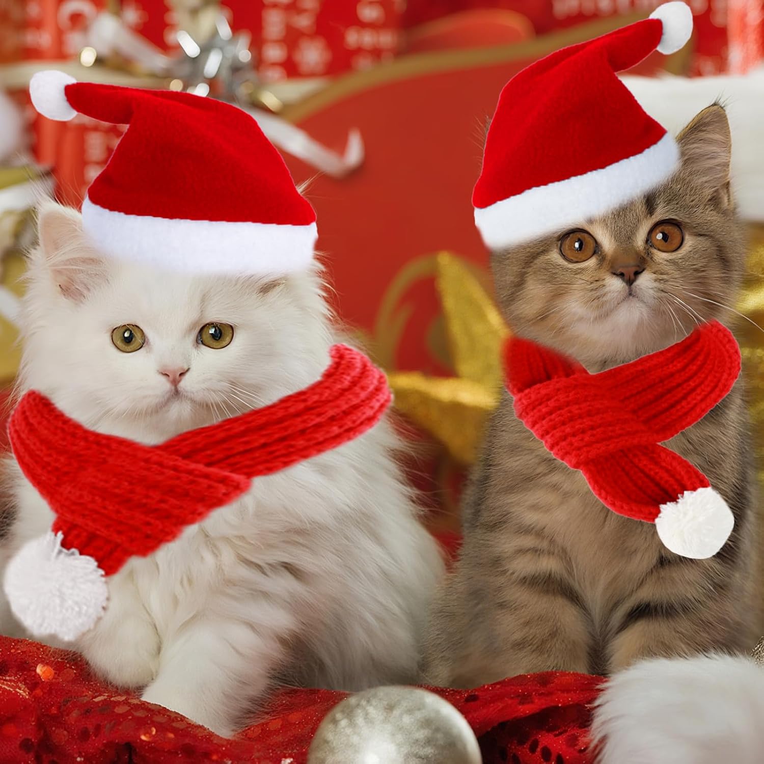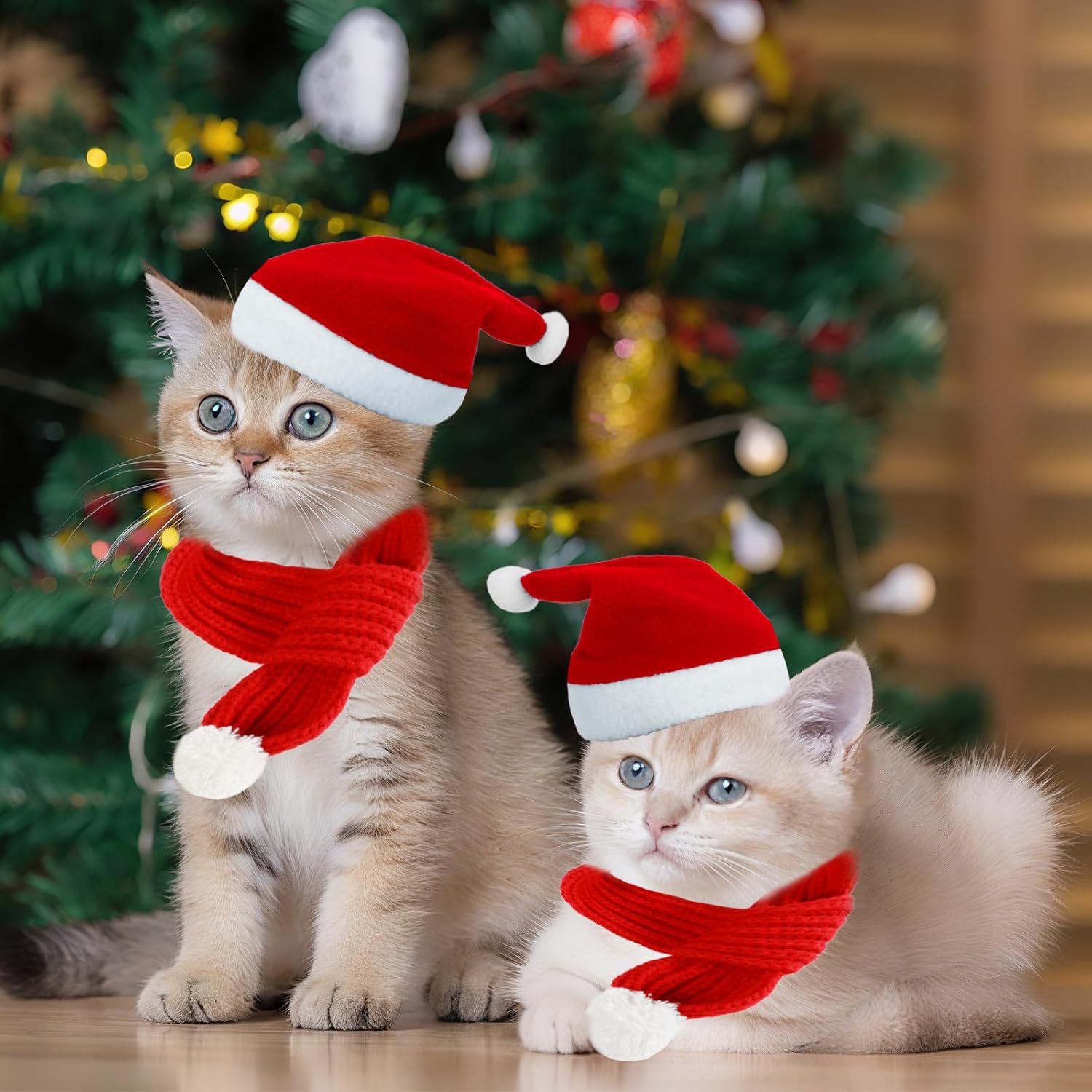 Комплект от 2 коледни костюма за котка, червен, коледна шапка и шал за котка, коледни костюми за домашни любимци, комплект аксесоари за коледни костюми за малки кучета и котки, коледни дрехи