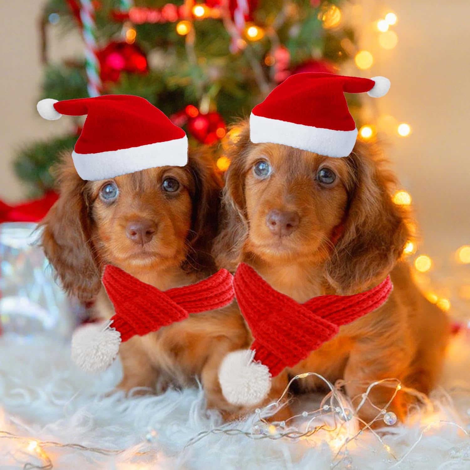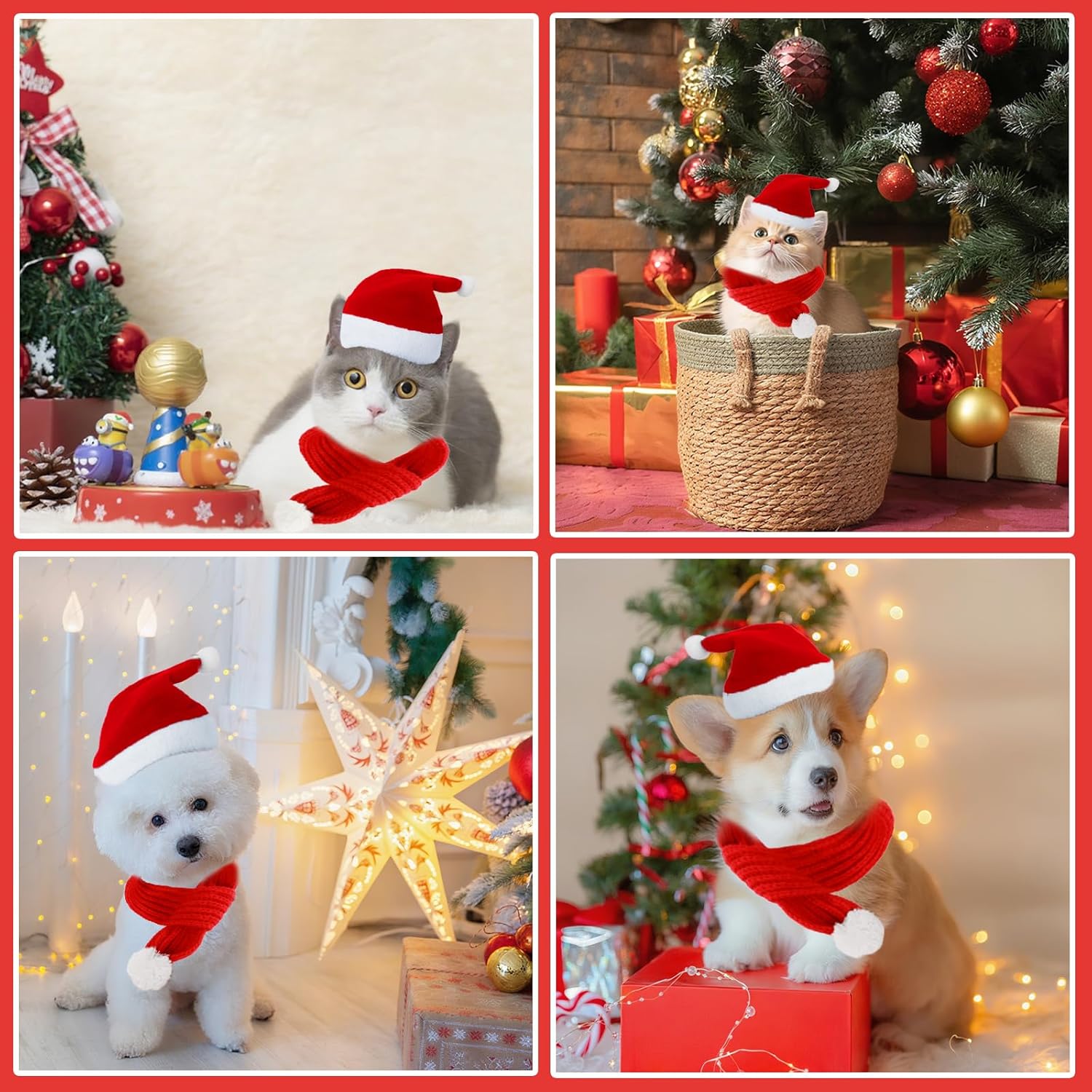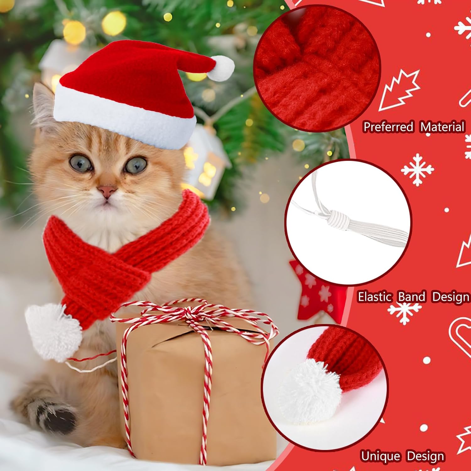 Комплект от 2 коледни костюма за котка, червен, коледна шапка и шал за котка, коледни костюми за домашни любимци, комплект аксесоари за коледни костюми за малки кучета и котки, коледни дрехи