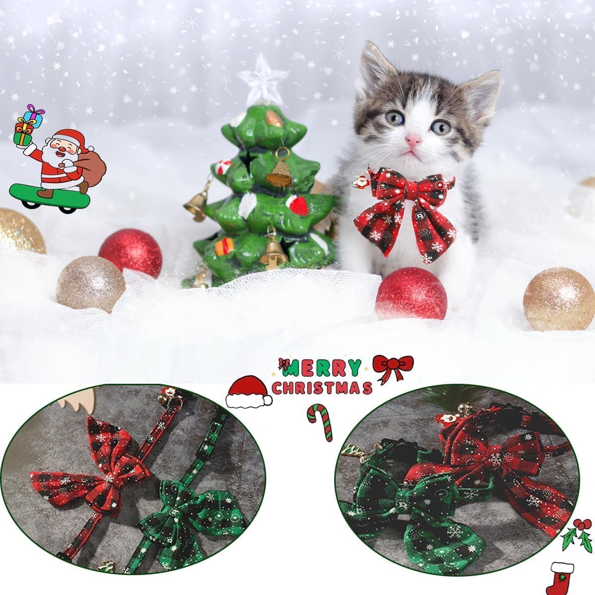 Комплект от 2 коледни нашийника за котки, регулируем нашийник с панделка, червено-зелени карирани нашийници със снежинки, регулируем нашийник за коледен костюм на котенца и кученца