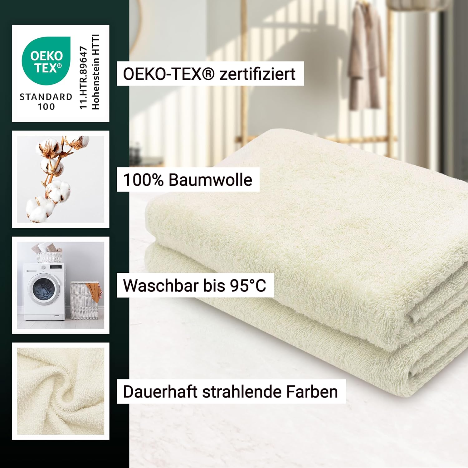Абсорбиращите постелки за баня впечатляват с най-високата си устойчивост на цветовете. Благодарение на боядисването с индантрен, хавлиените кърпи постигат най-високи стойности за устойчивост на цветовете и най-добра стабилност на цветовете, могат да се перат до 95°C и дори са устойчиви на кипене и хлор.