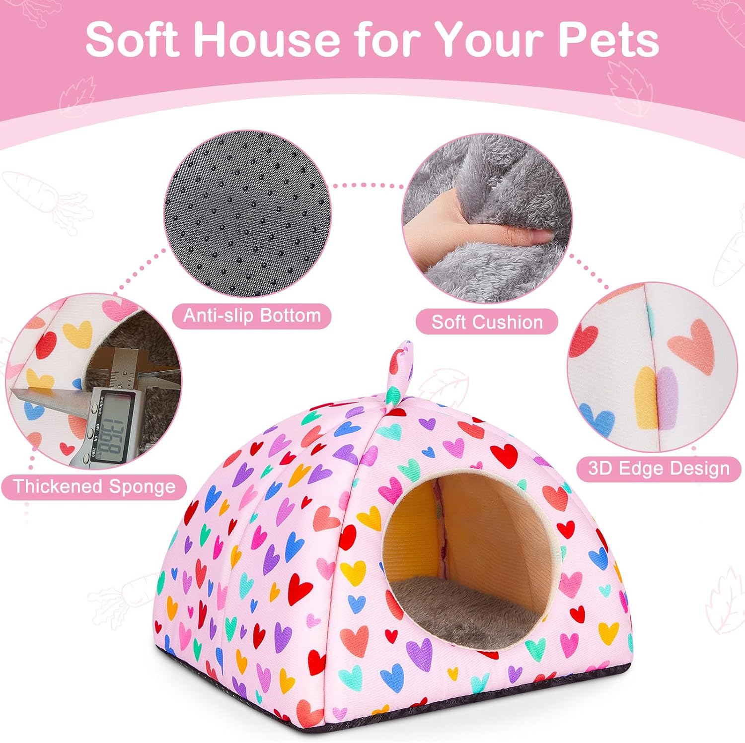 • ПЕРФЕКТЕН РАЗМЕР И СЛАДЪК ДИЗАЙН Нашата заешка пещера е със сладки шарки и е с размери 27 x 27 x 26 см - идеално подходяща за морски свинчета, хамстери, чинчили, таралежи, порове и джуджешки зайци. Моля, измерете домашния си любимец преди покупка, за да сте сигурни, че ще пасне перфектно.