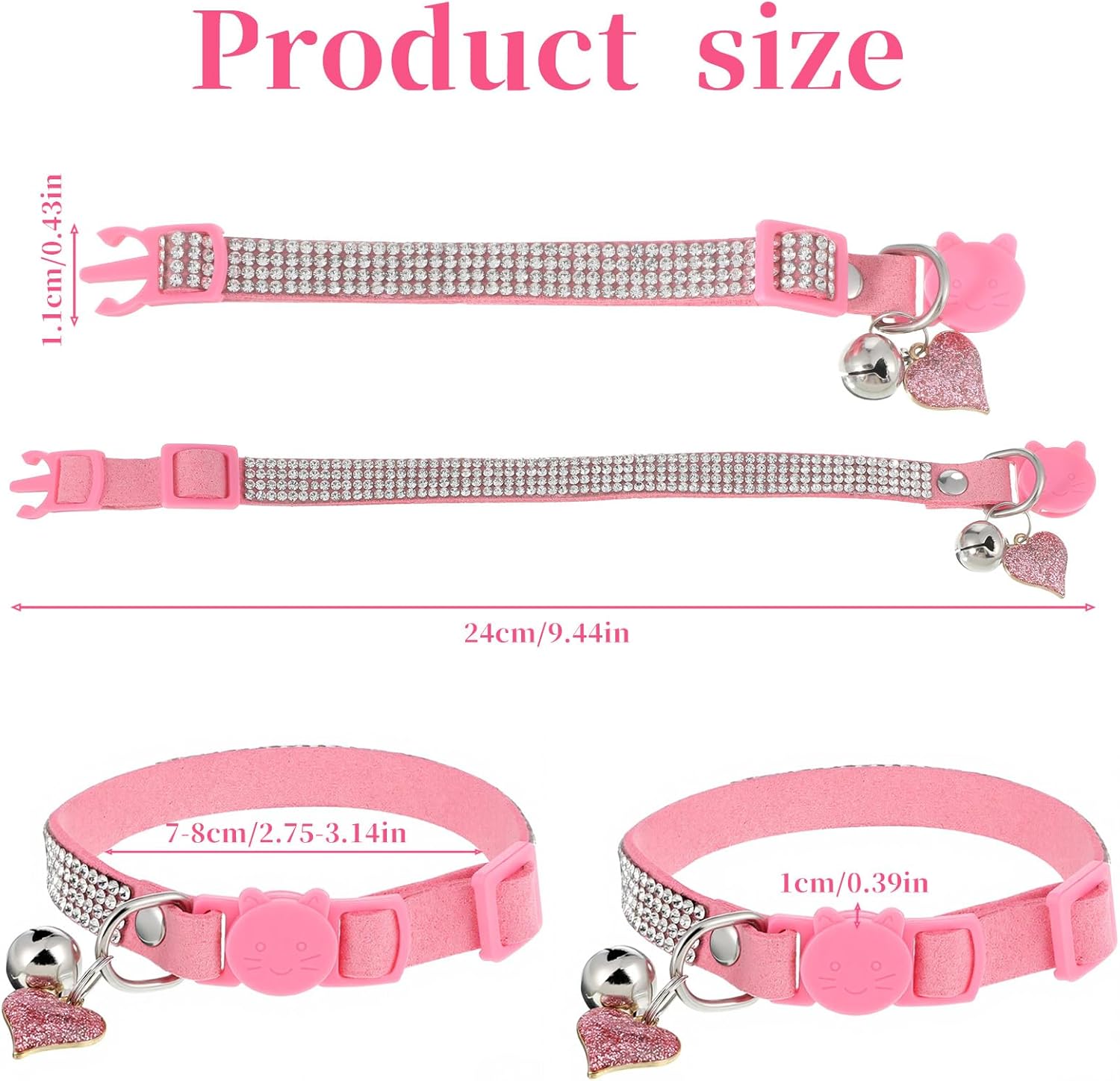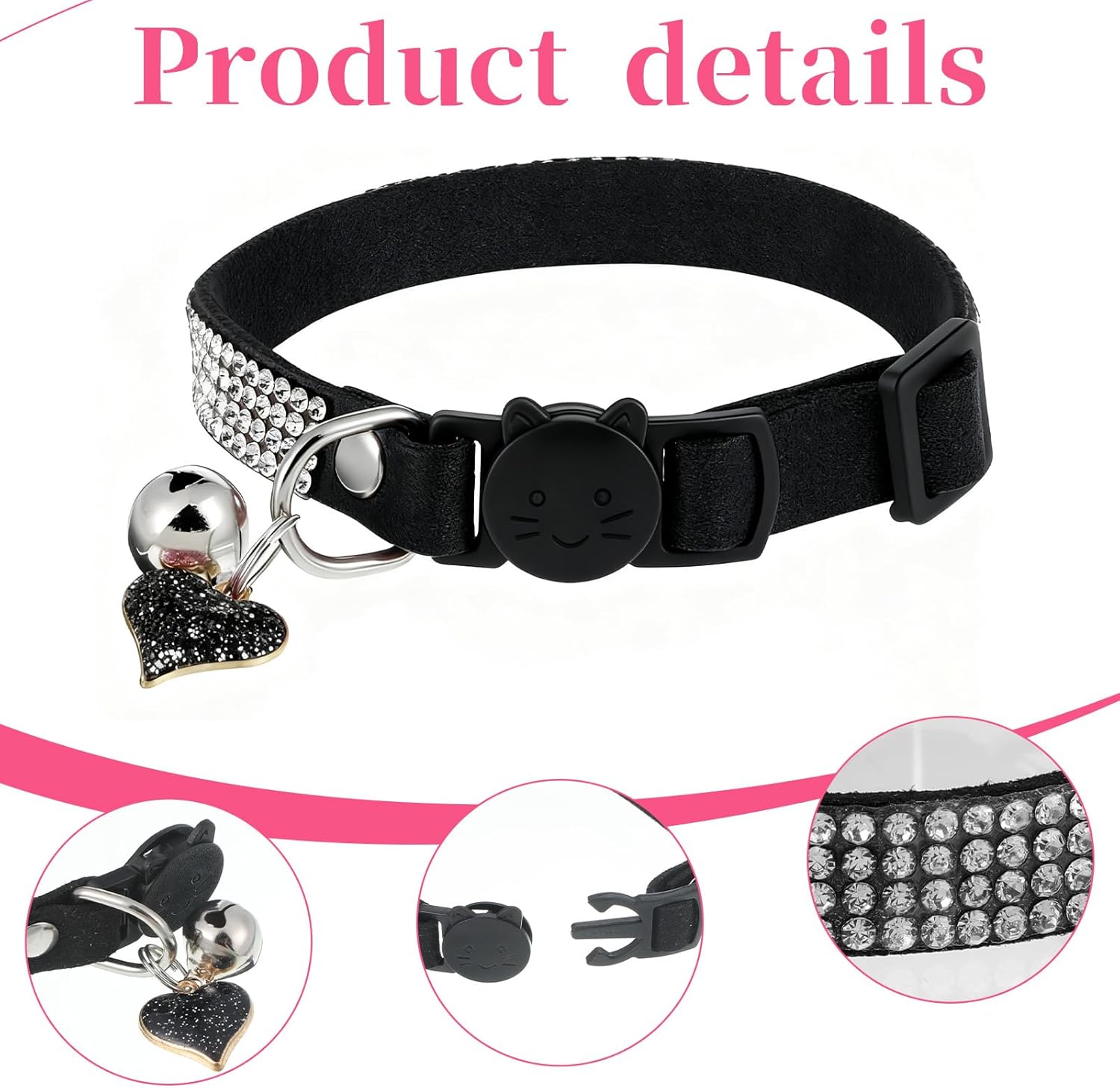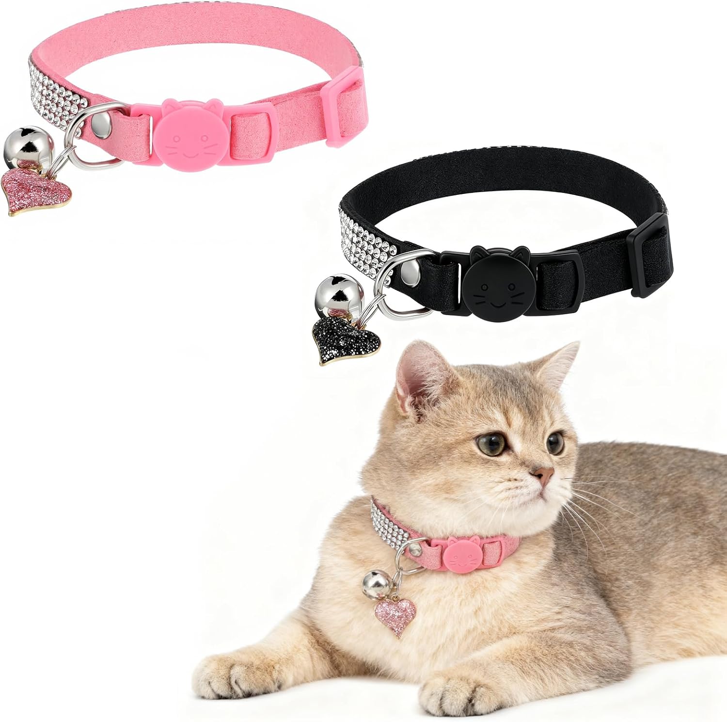 Комплект от 2 нашийника за котки с предпазна закопчалка, нашийници за котки със звънец, кристали, регулируем мек нашийник за котенца за малки котки, кучета, зайци (розов, черен)