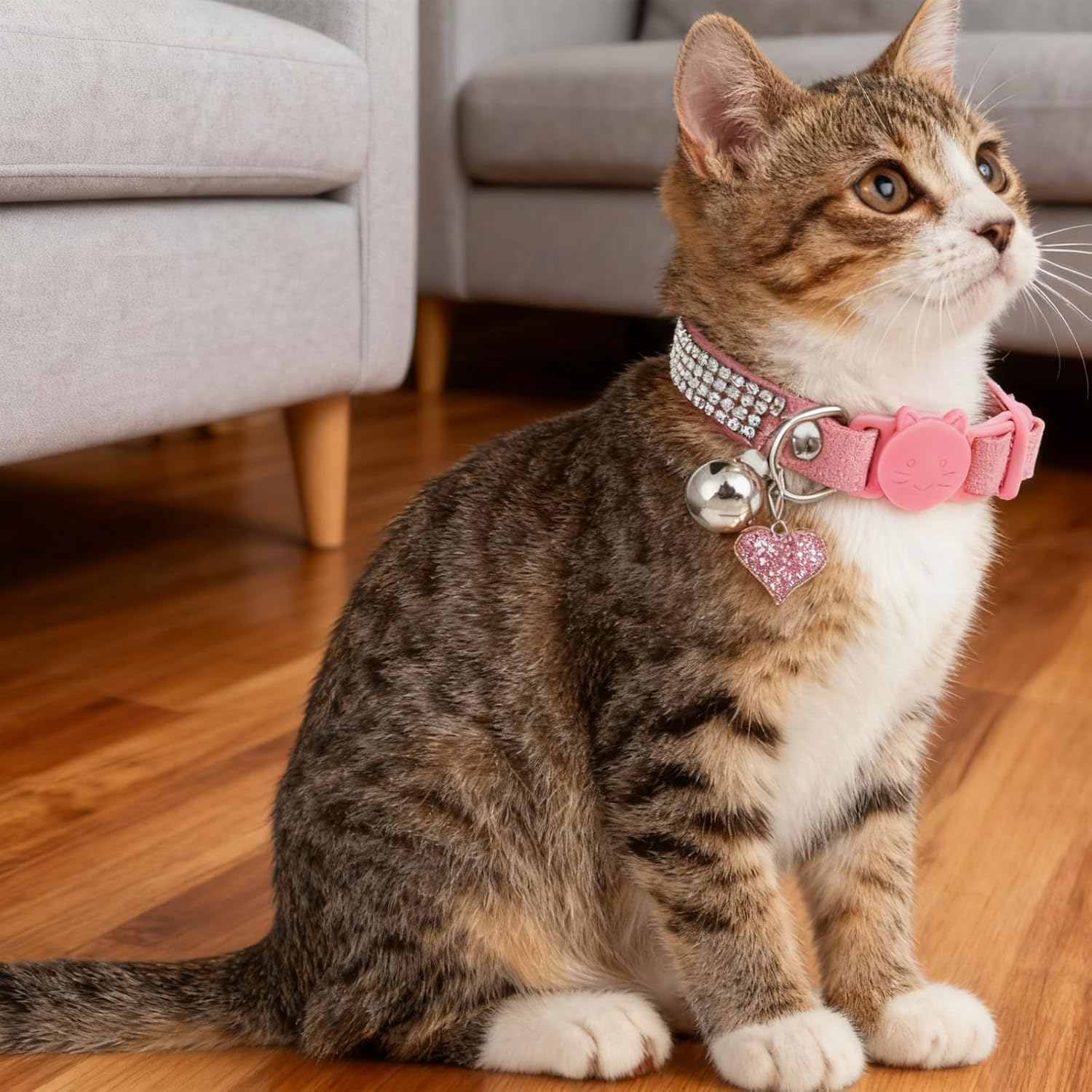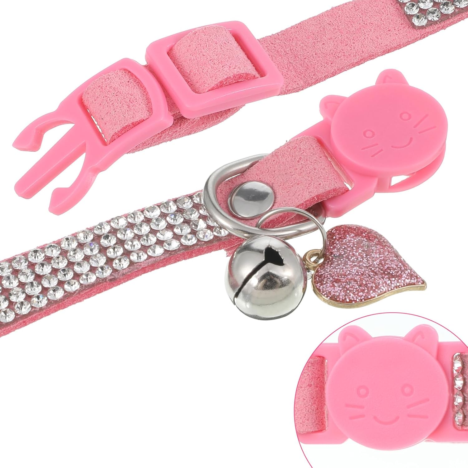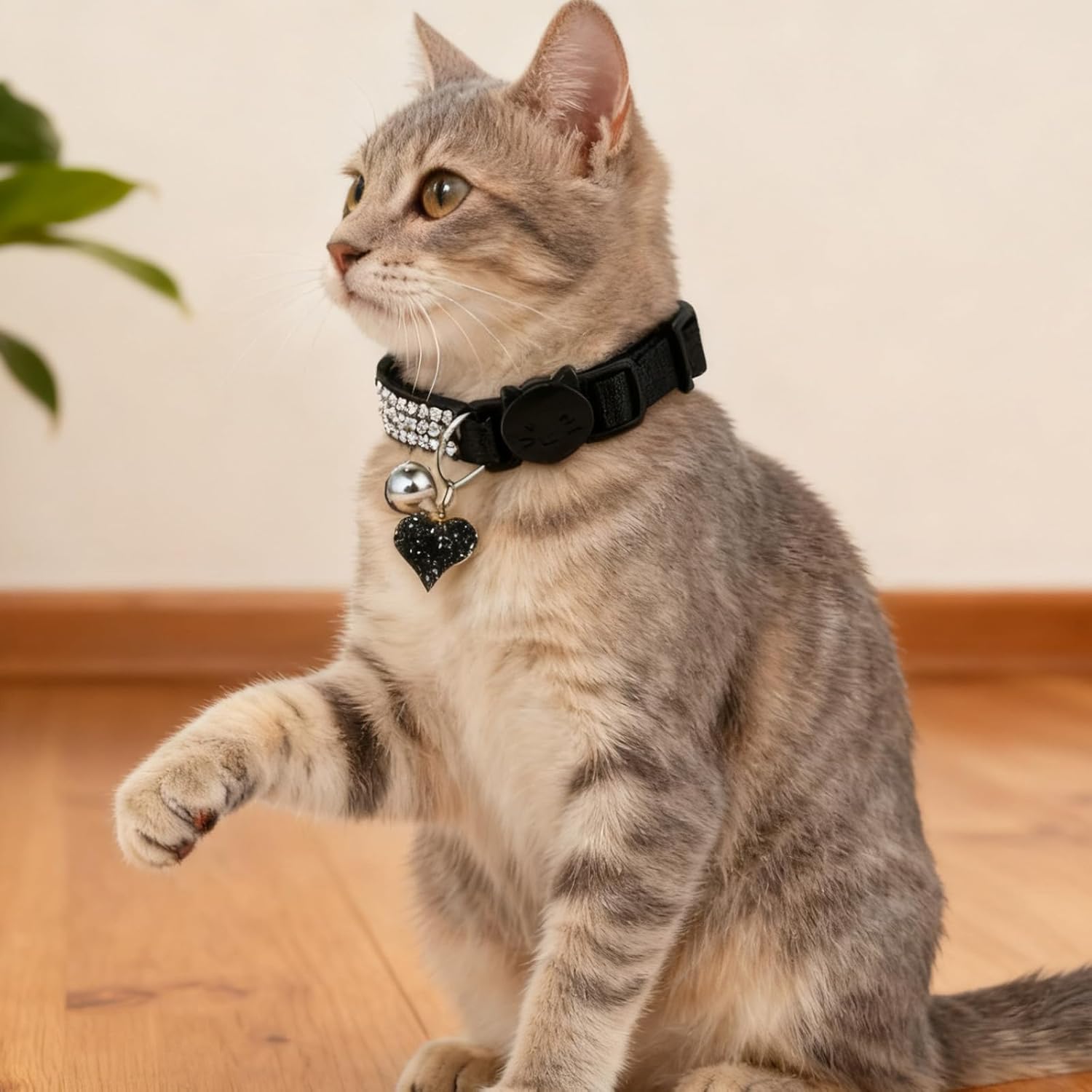 Комплект от 2 нашийника за котки с предпазна закопчалка, нашийници за котки със звънец, кристали, регулируем мек нашийник за котенца за малки котки, кучета, зайци (розов, черен)