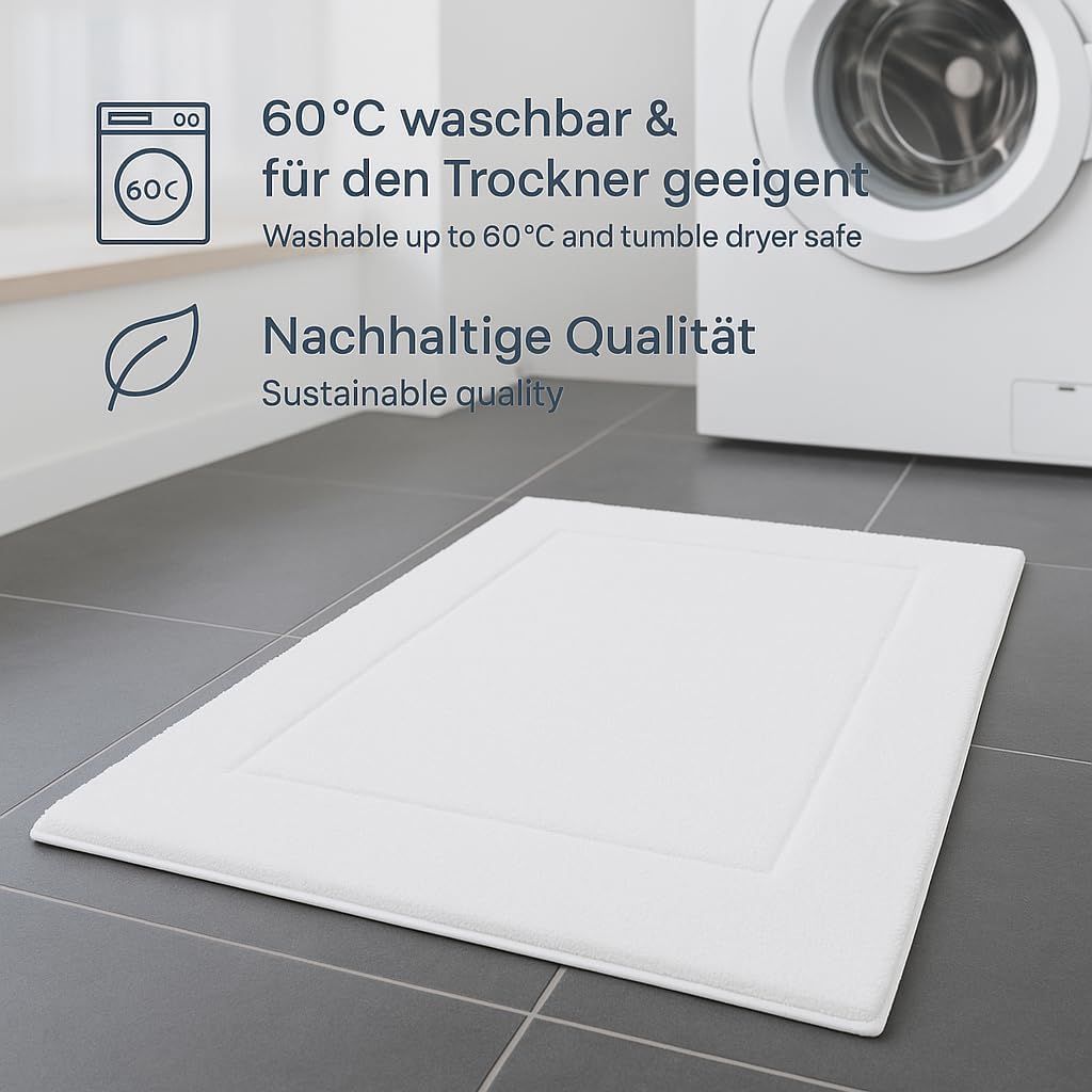 • Много лесна за поддръжка: постелката за баня за тоалетната и банята е изключително издръжлива – абсорбираща – мека и следователно много издръжлива. Може да се пере до 60 градуса и е подходяща за сушене в сушилня.
