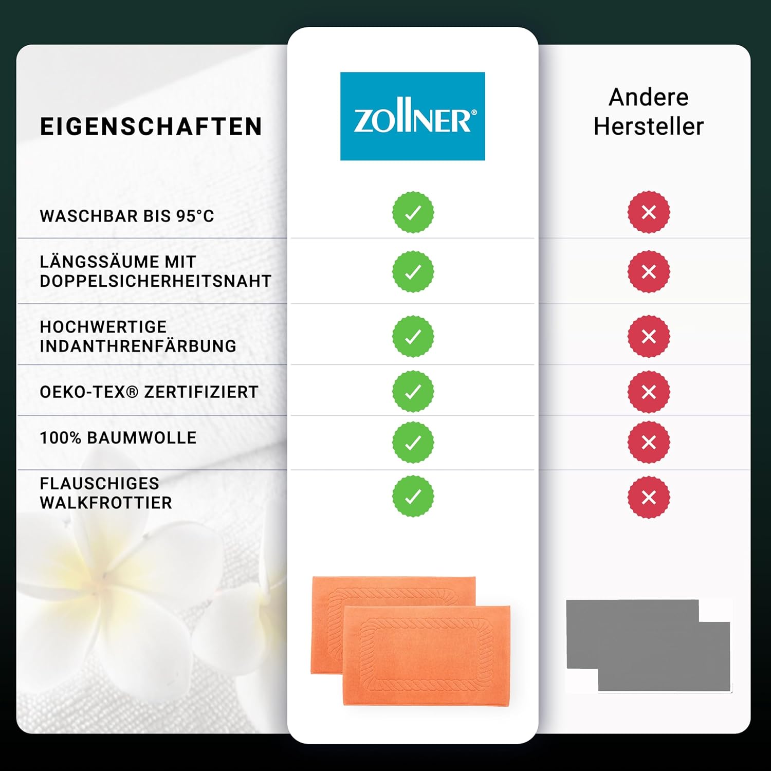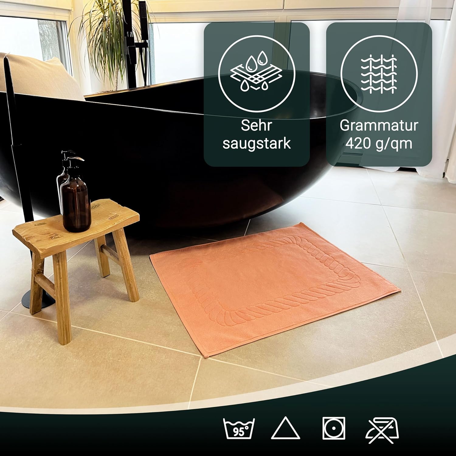Абсорбиращите постелки за баня впечатляват с най-високата си устойчивост на цветовете. Благодарение на боядисването с индантрен, хавлиените кърпи постигат най-високи стойности за устойчивост на цветовете и най-добра стабилност на цветовете, могат да се перат до 95°C и дори са устойчиви на кипене и хлор.