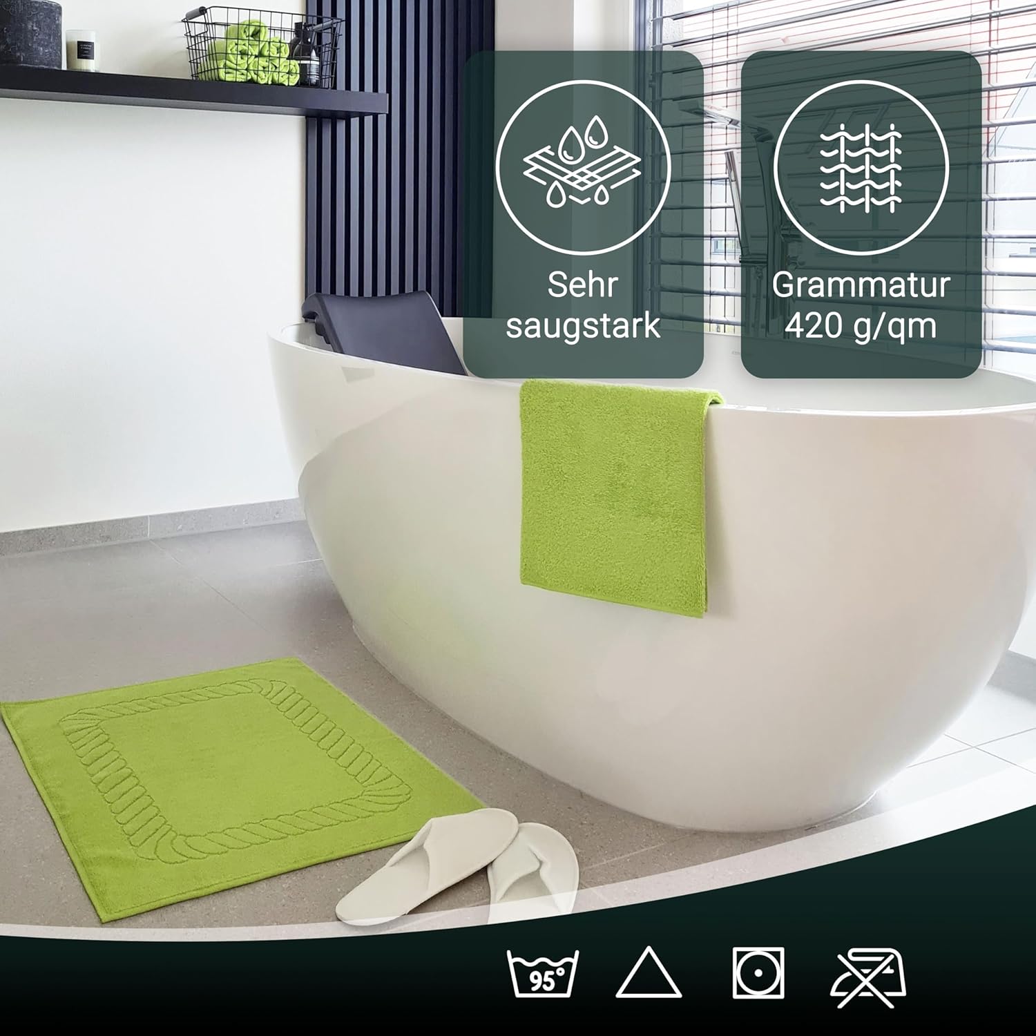 Абсорбиращите постелки за баня впечатляват с най-високата си устойчивост на цветовете. Благодарение на боядисването с индантрен, хавлиените кърпи постигат най-високи стойности за устойчивост на цветовете и най-добра стабилност на цветовете, могат да се перат до 95°C и дори са устойчиви на кипене и хлор.