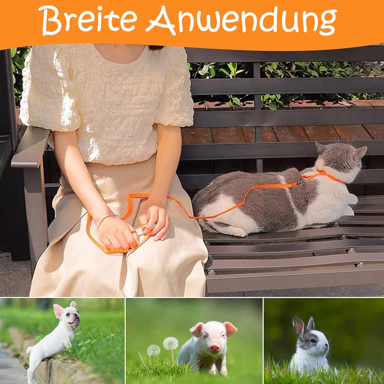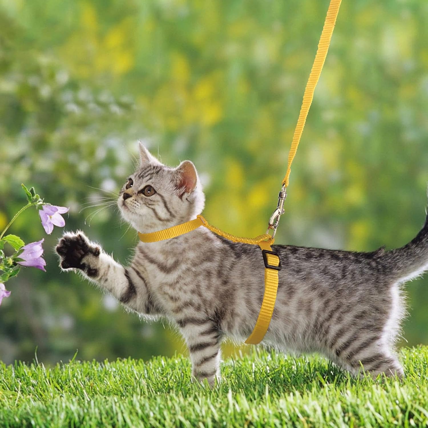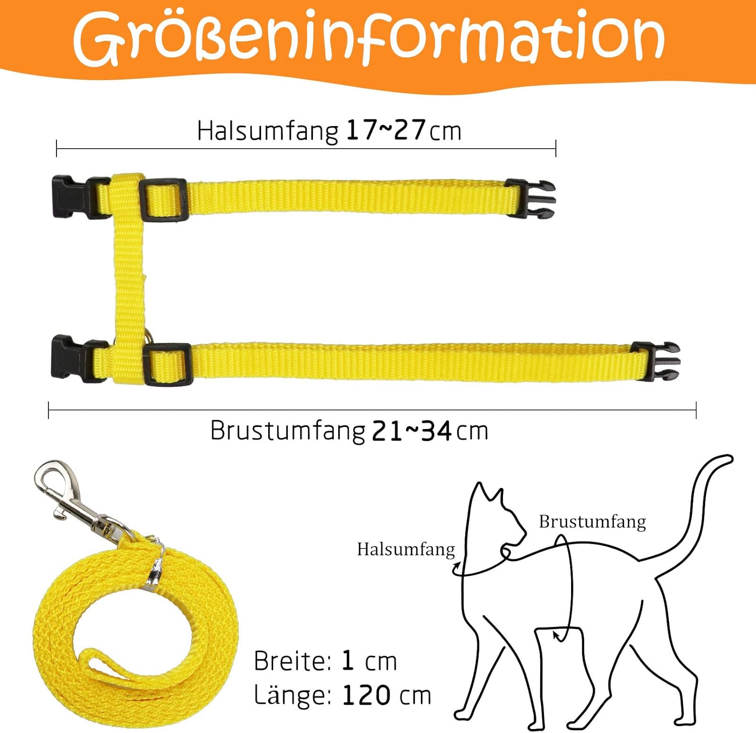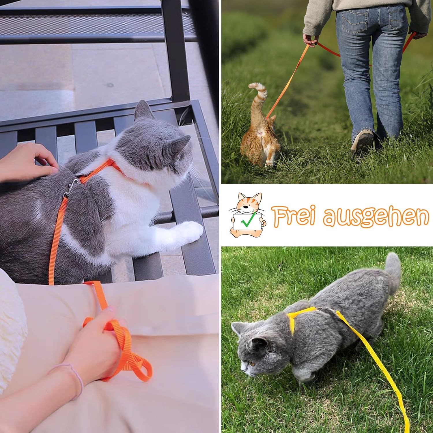 1. Remove the cat leash and harness from the packaging. 2. Adjust the size of the harness to your cat's neck chest circumference by adjusting the H-shaped buckle. 3. Make sure that it sits comfortably and does not constrict. 4. Connect lead. 5. Let your run carefully and watch if it feels comfortable.