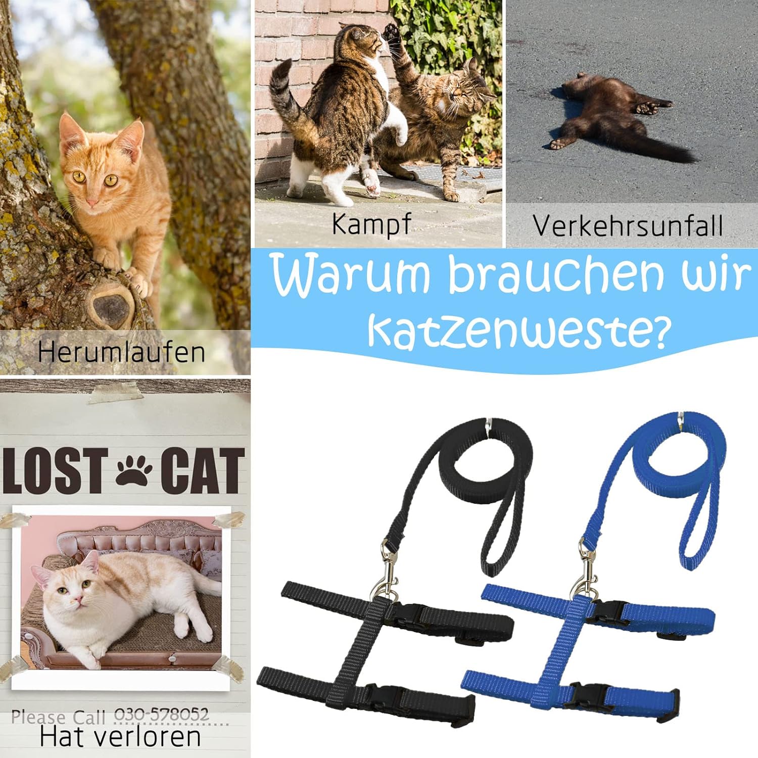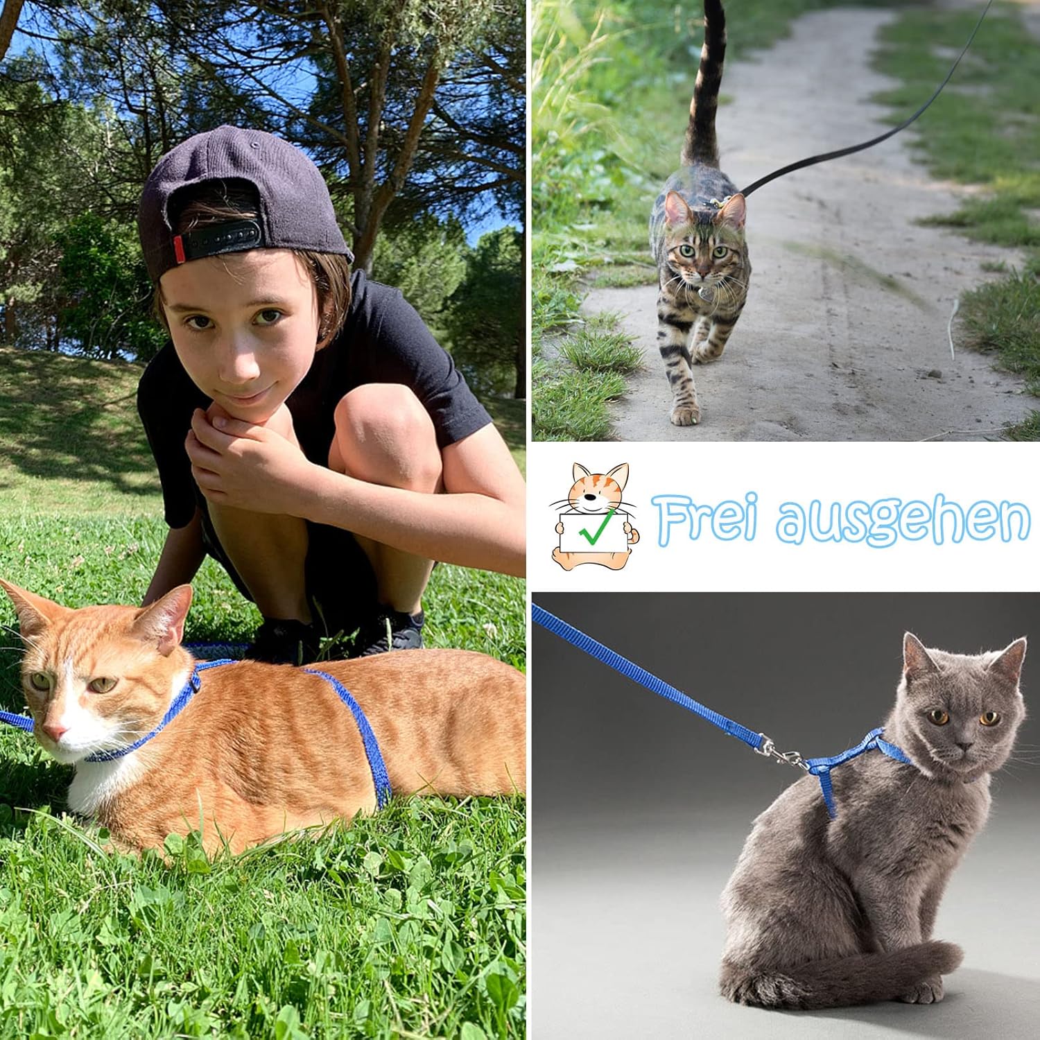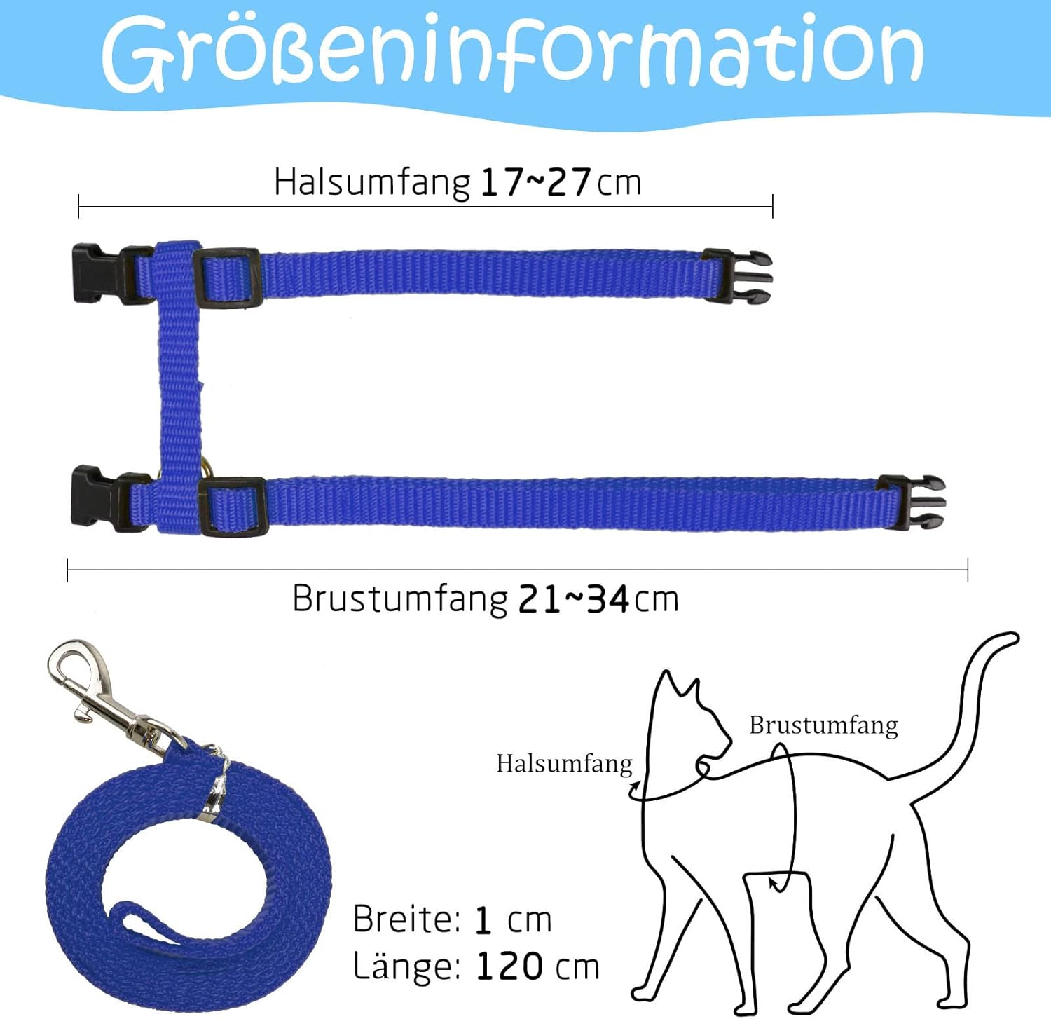 1. Remove the cat leash and harness from the packaging. 2. Adjust the size of the harness to your cat's neck chest circumference by adjusting the H-shaped buckle. 3. Make sure that it sits comfortably and does not constrict. 4. Connect lead. 5. Let your run carefully and watch if it feels comfortable.