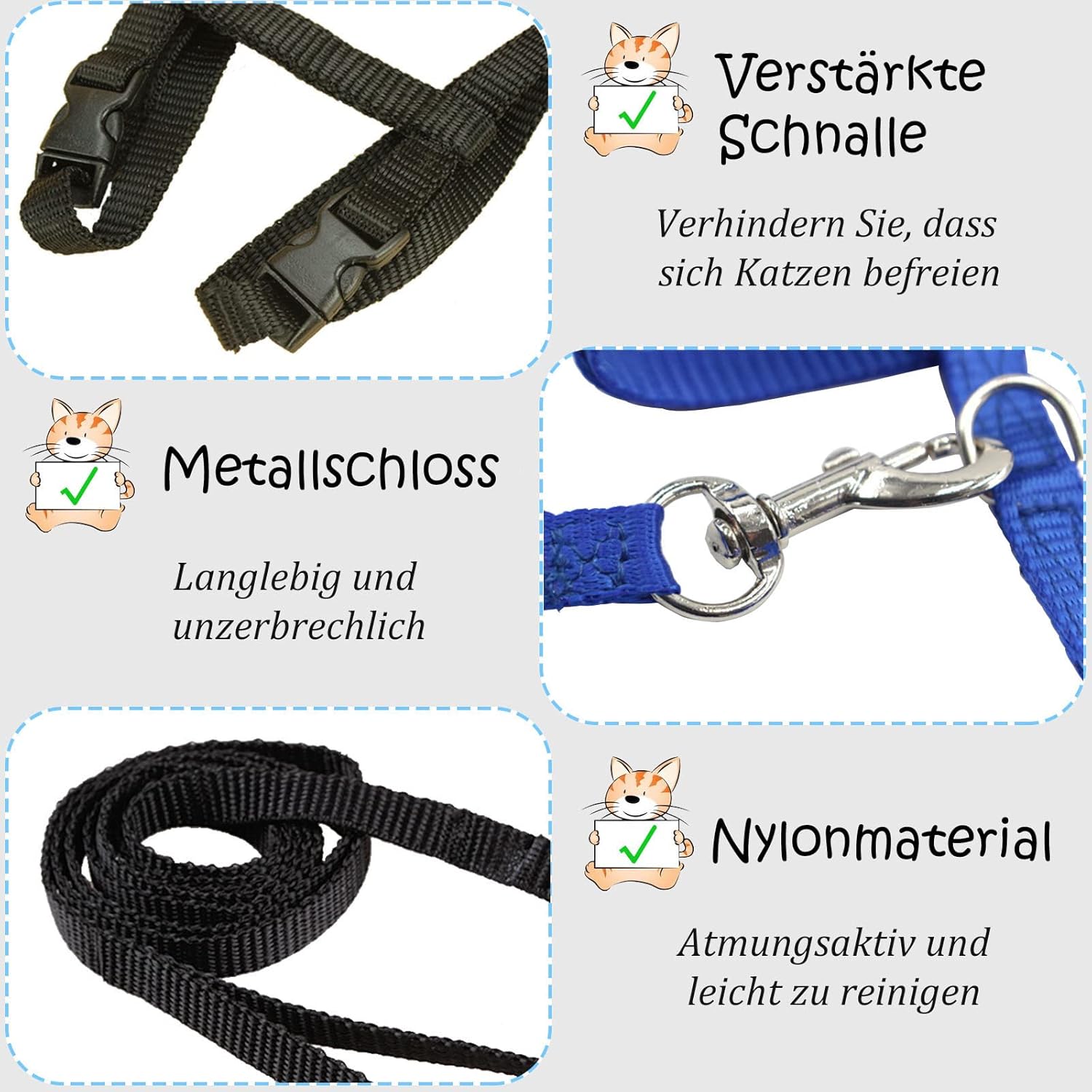3. Найлоновият котешки каишка за връзка е изработен от метални куки, които могат ефективно да предотвратят измъкването на домашни любимци и са безопасни и здрави.