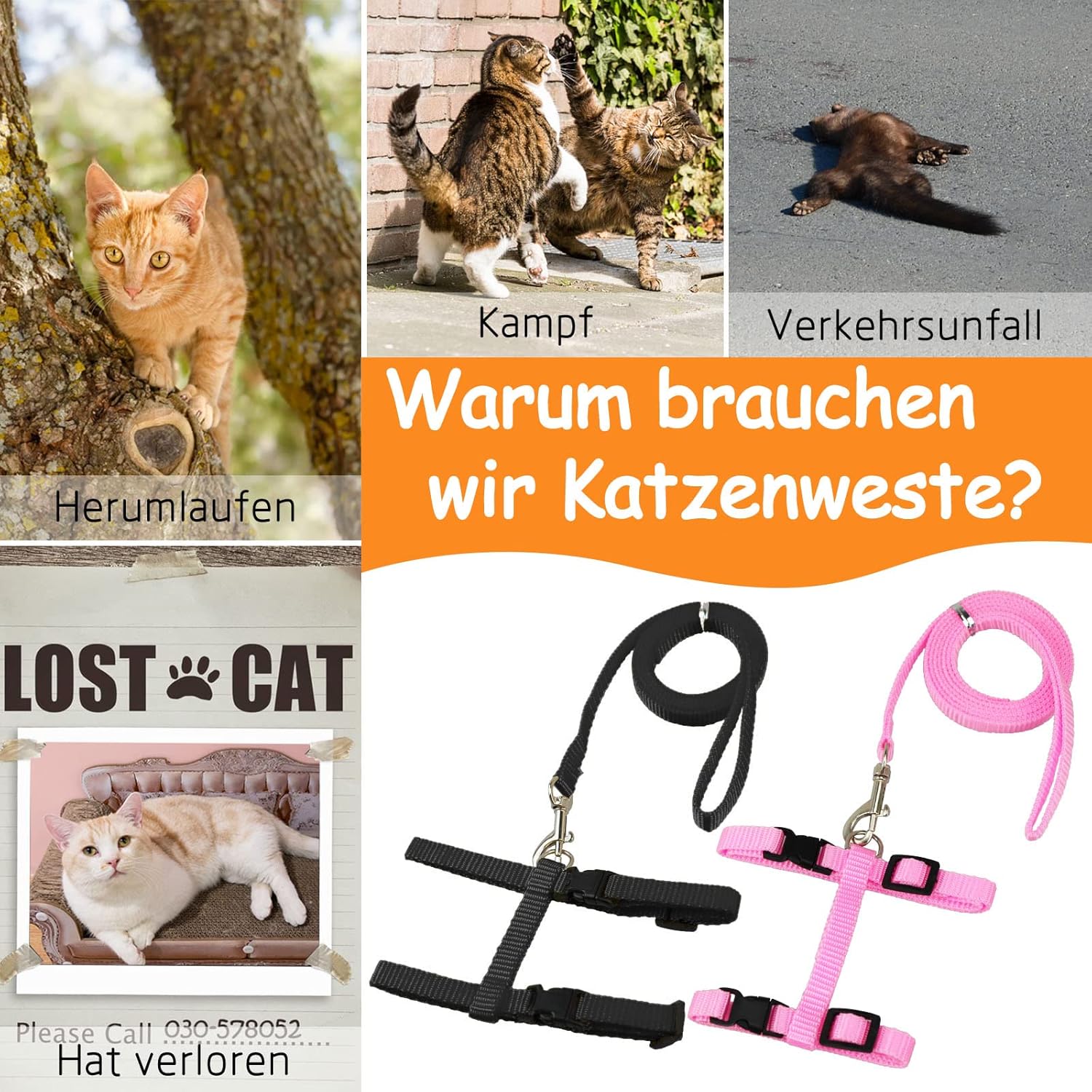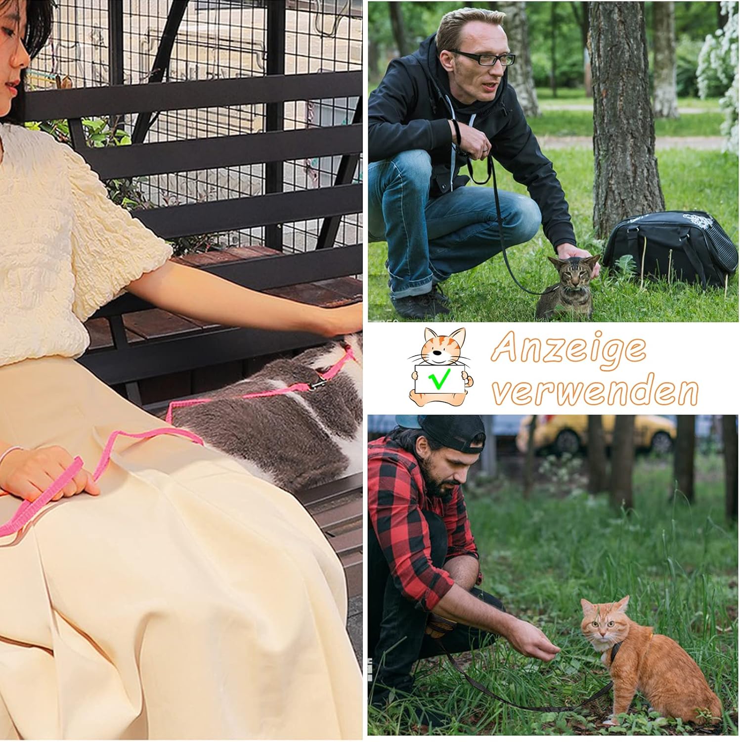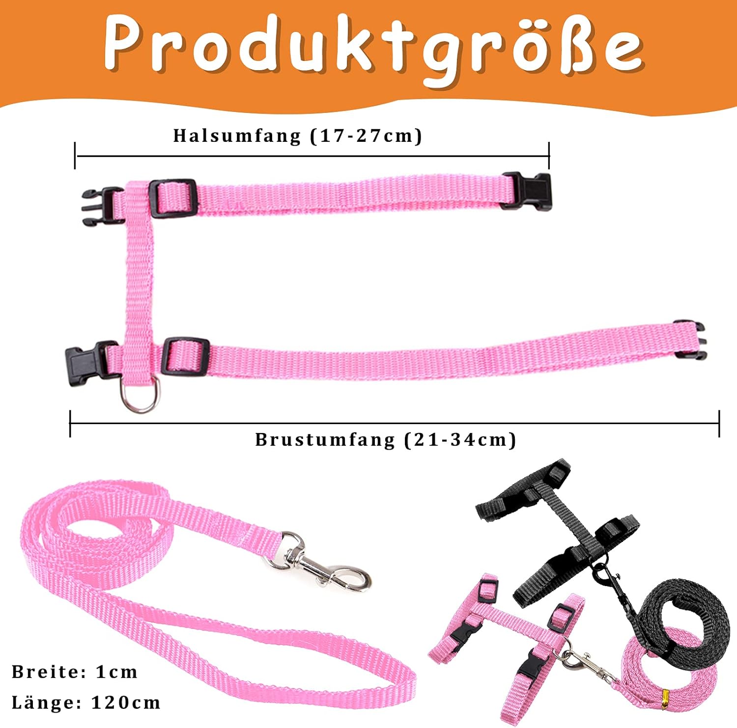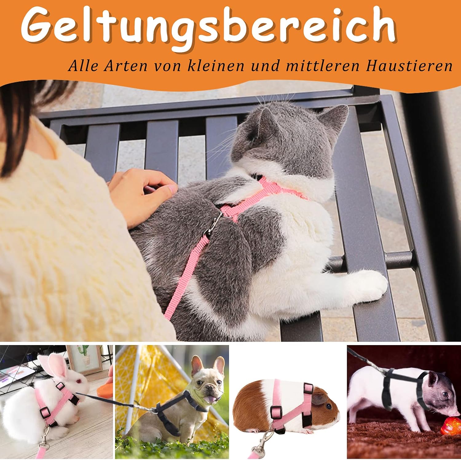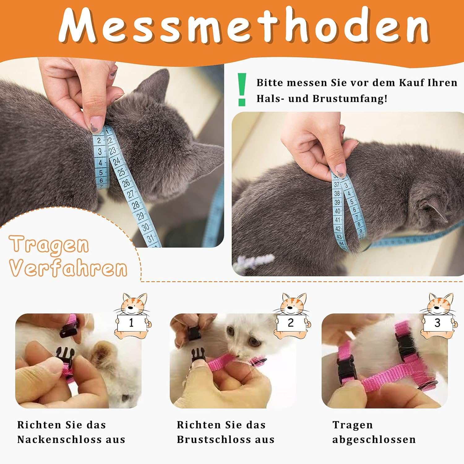 1. Remove the cat leash and harness from the packaging. 2. Adjust the size of the harness to your cat's neck chest circumference by adjusting the H-shaped buckle. 3. Make sure that it sits comfortably and does not constrict. 4. Connect lead. 5. Let your run carefully and watch if it feels comfortable.