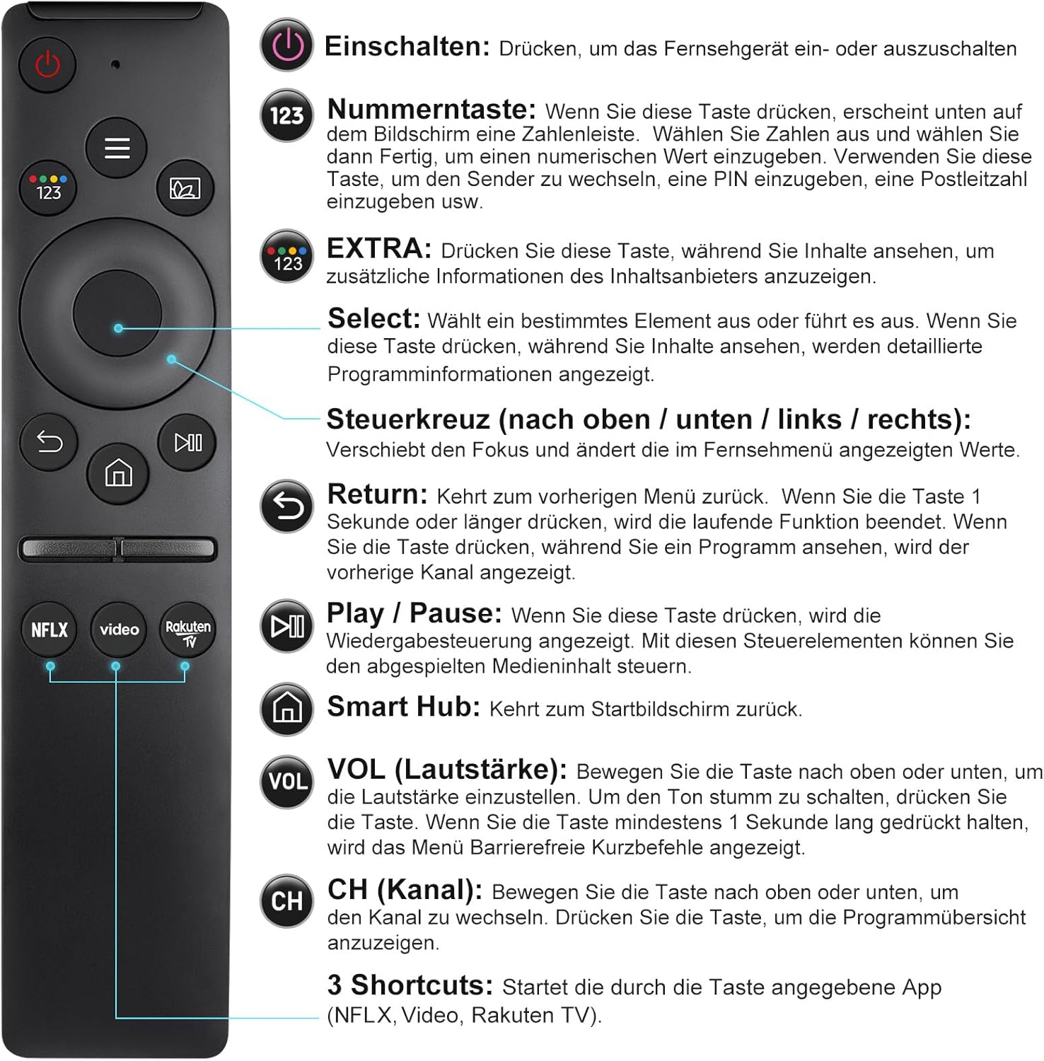 • Първокласна производителност: Универсалното дистанционно за телевизор разполага с бутони за бърз достъп до Netflix и Rakuten TV за допълнително удобство. Нашето дистанционно е подобрено, за да ви предложи по-голямо разстояние на предаване (над 12,2 м) и по-стабилна производителност.