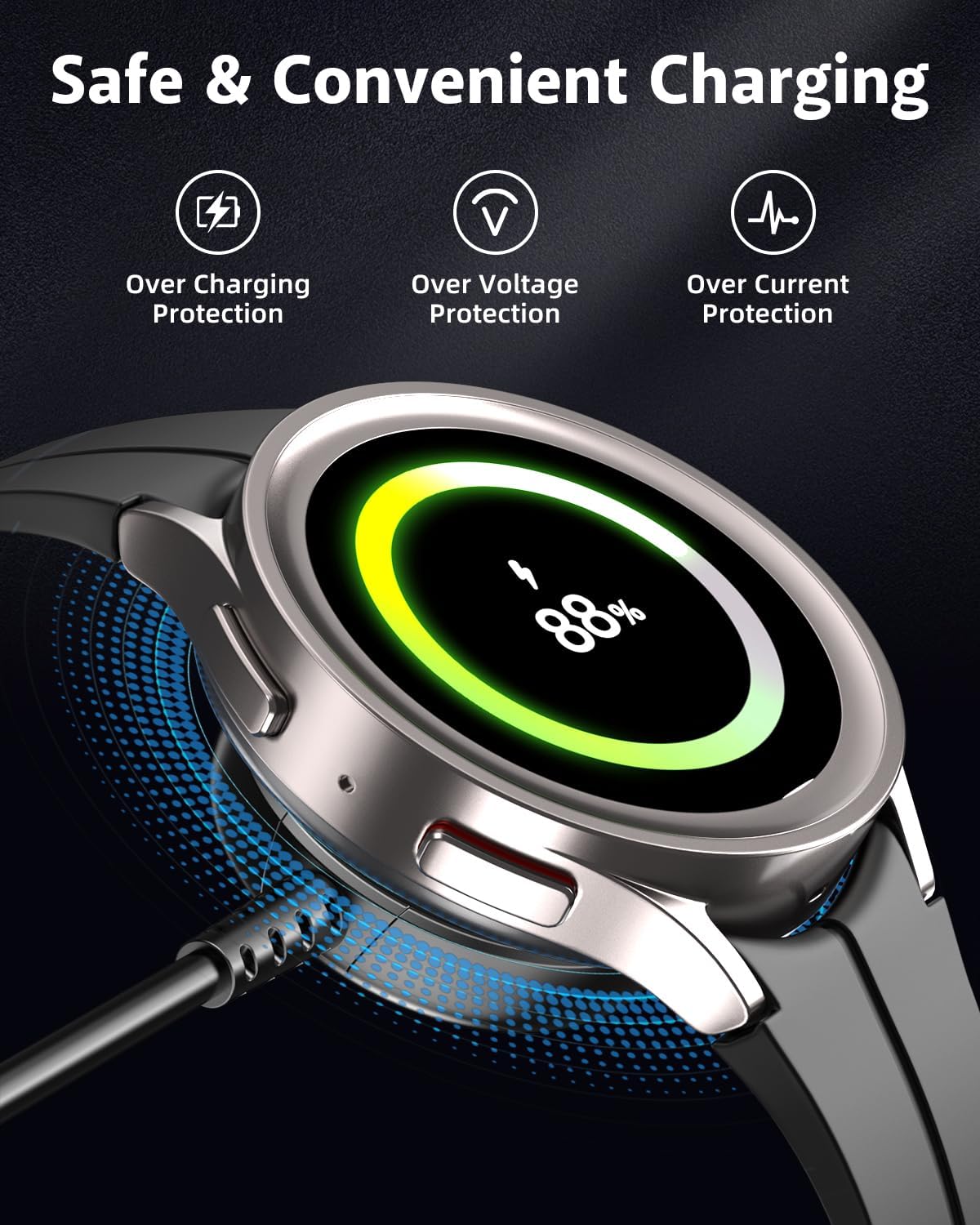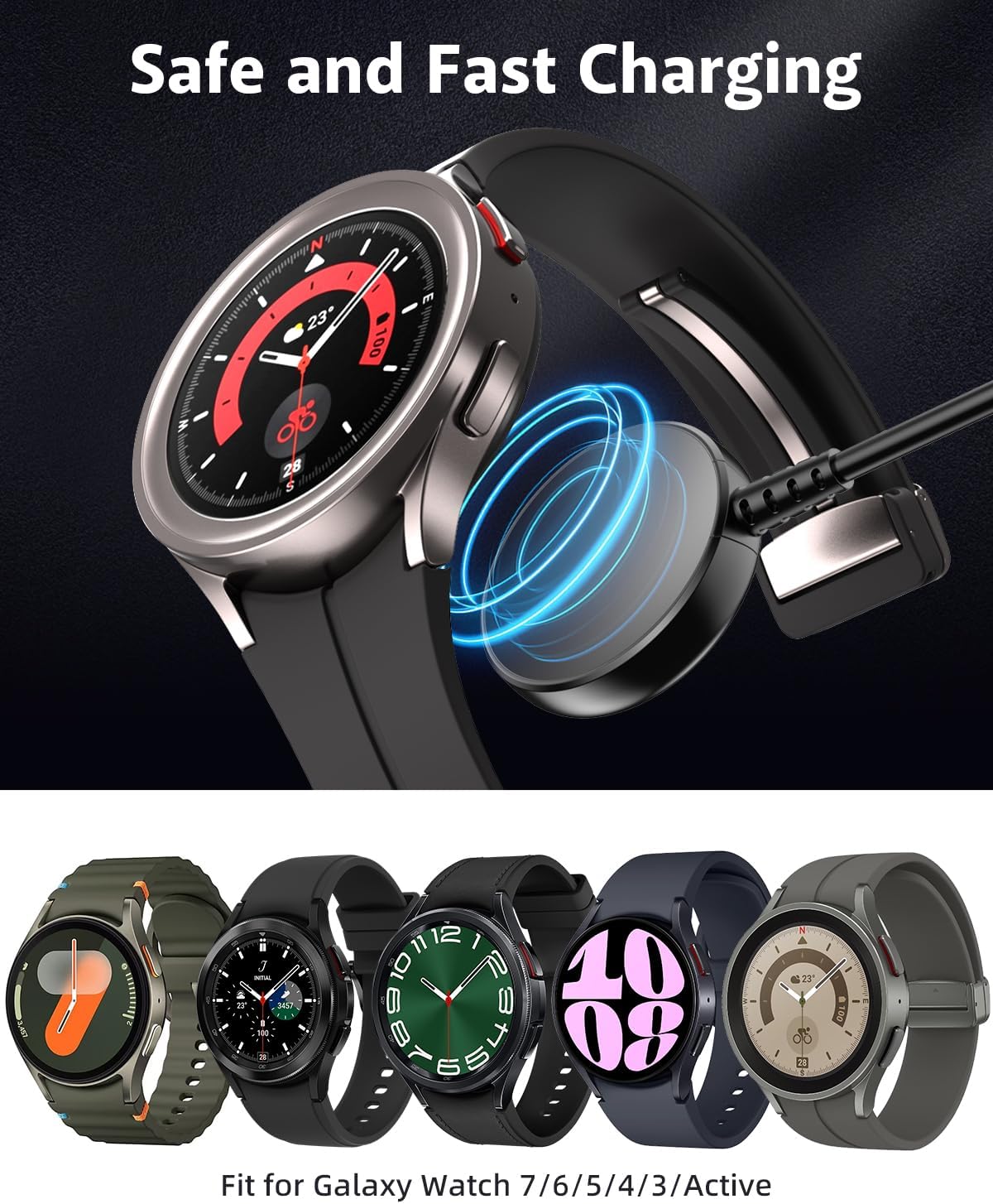 • 【Широка съвместимост】: Това зарядно за Samsung Watch е съвместимо със Samsung Galaxy 7/6/6 Classic, Watch Ultra/Watch FE, Watch 5/Samsung Galaxy Watch 5 Pro, Galaxy Watch 4/3/Active2/Active.