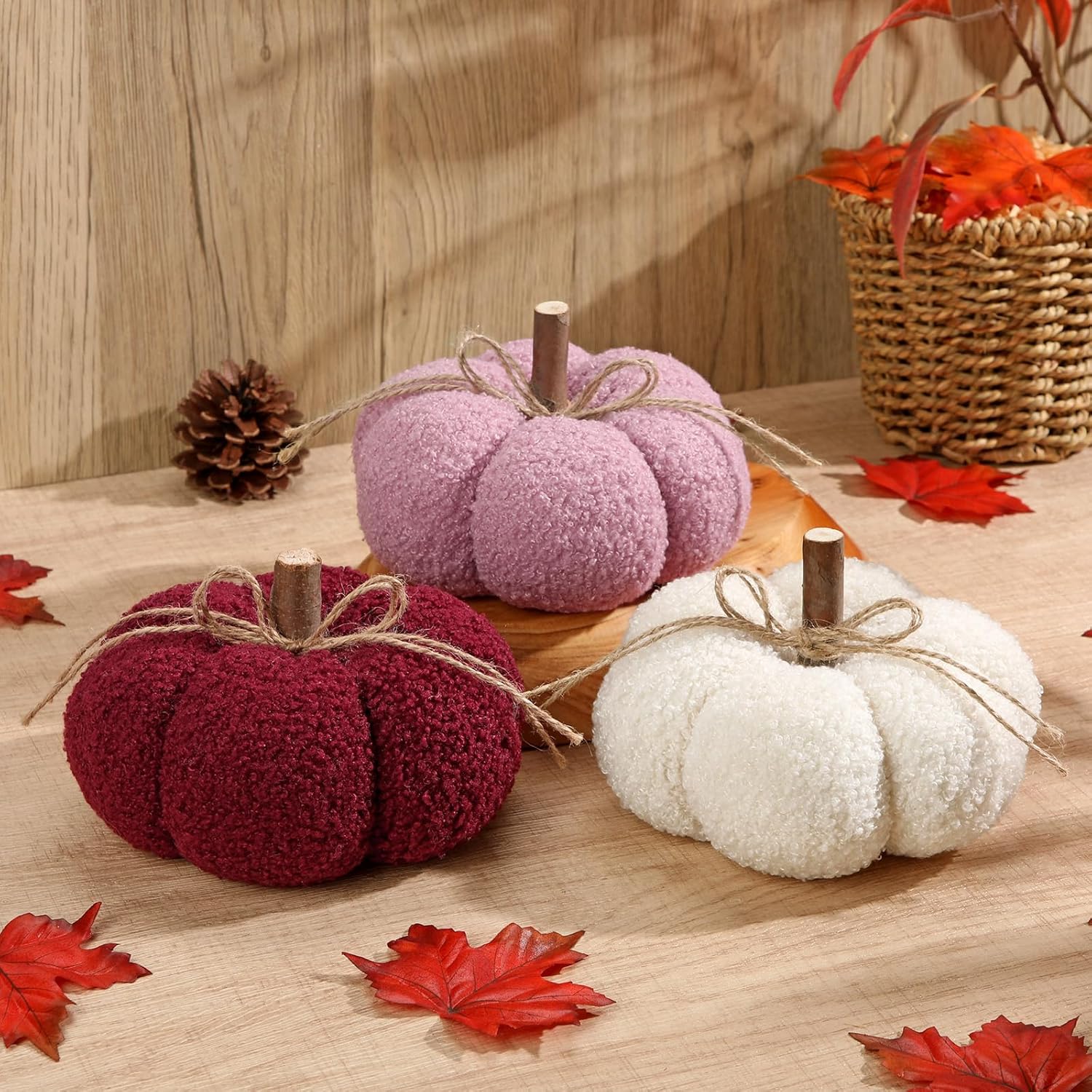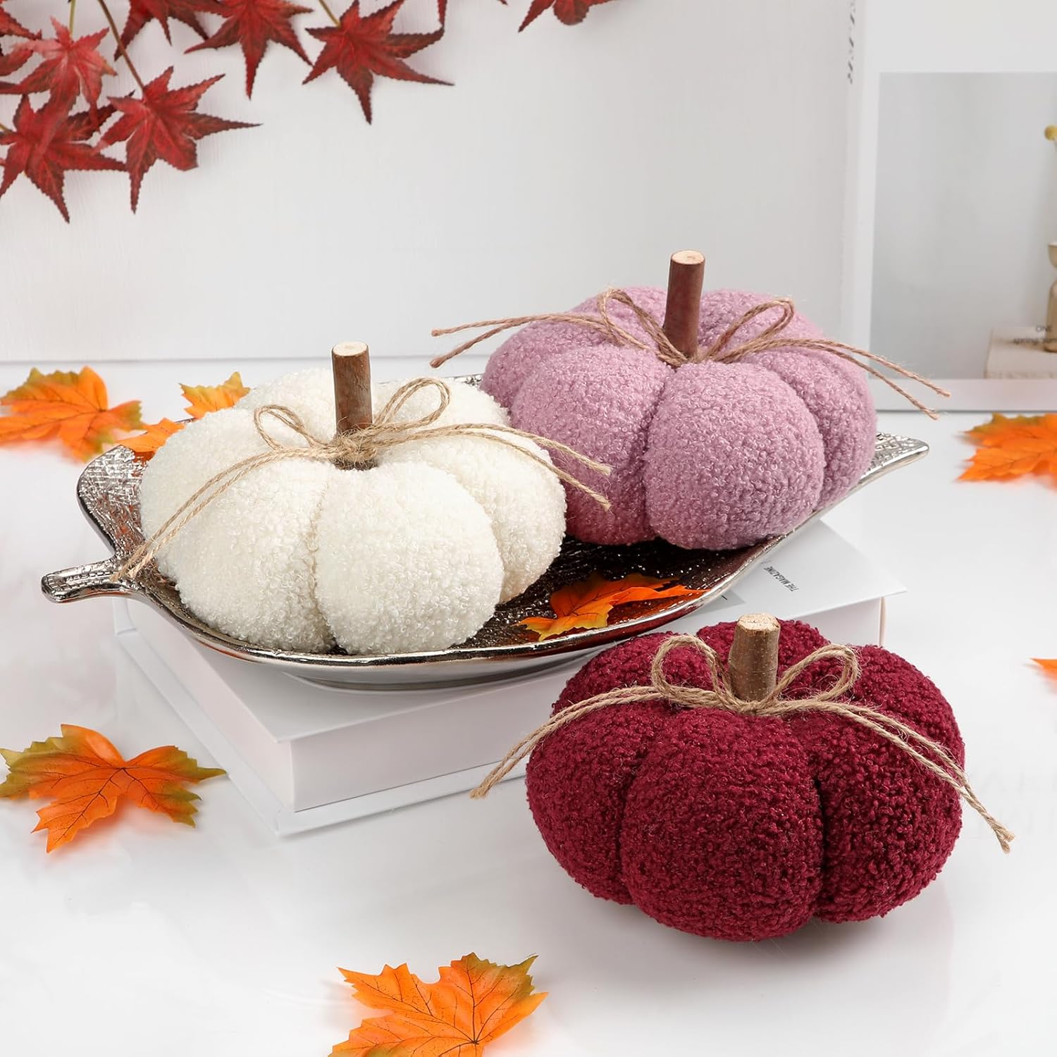 Комплект от 3 изкуствени кадифени тикви Oairse 15 см изкуствена тиква за есенна декорация, декорации за маса, есенни декорации „Направи си сам“, централен елемент за есенна сватба, есенна декорация за дома, Денят на благодарността