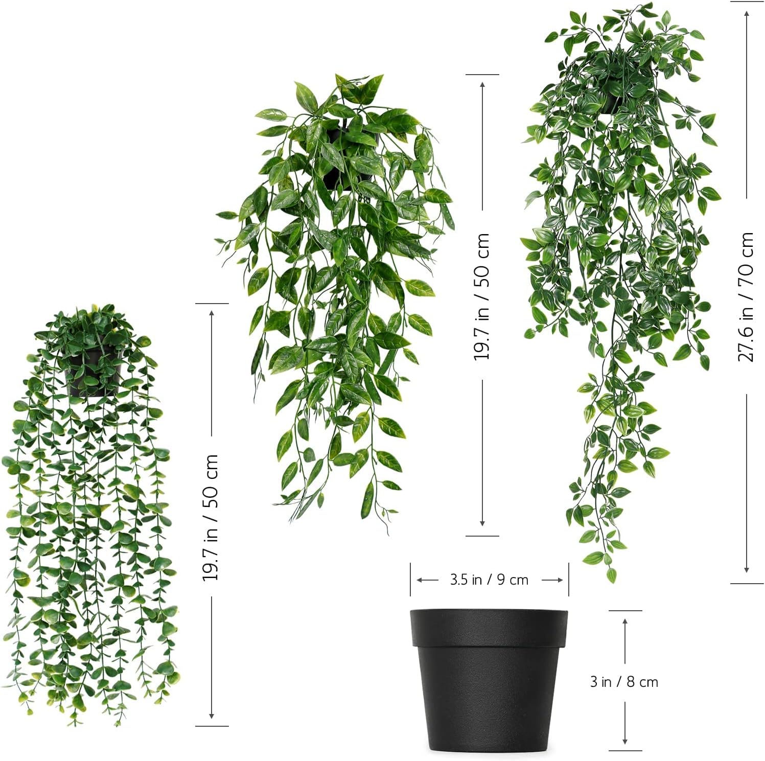 Материал: Висококачествени материали. Стъблото е изработено от тел с пластмасово покритие. Стил: Опаковка от 3. Изкуствени листа от евкалипт, изкуствени листа от грахови шушулки, изкуствени висящи растения мандала. Размери: Дължината на изкуственото висящо растение мандала е 70 см. Изкуствените листа от евкалипт са 50 см, а листата от грахови шушулки са 50 см. Размерите на саксията са 9 см x 8 см.