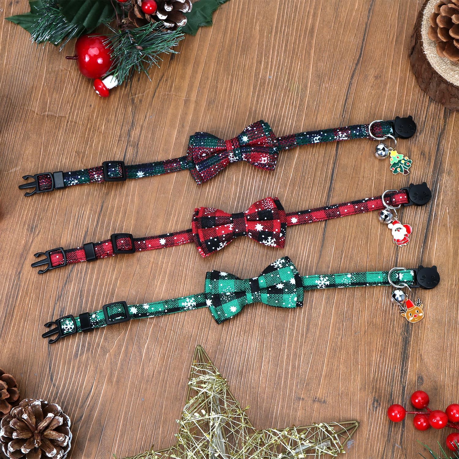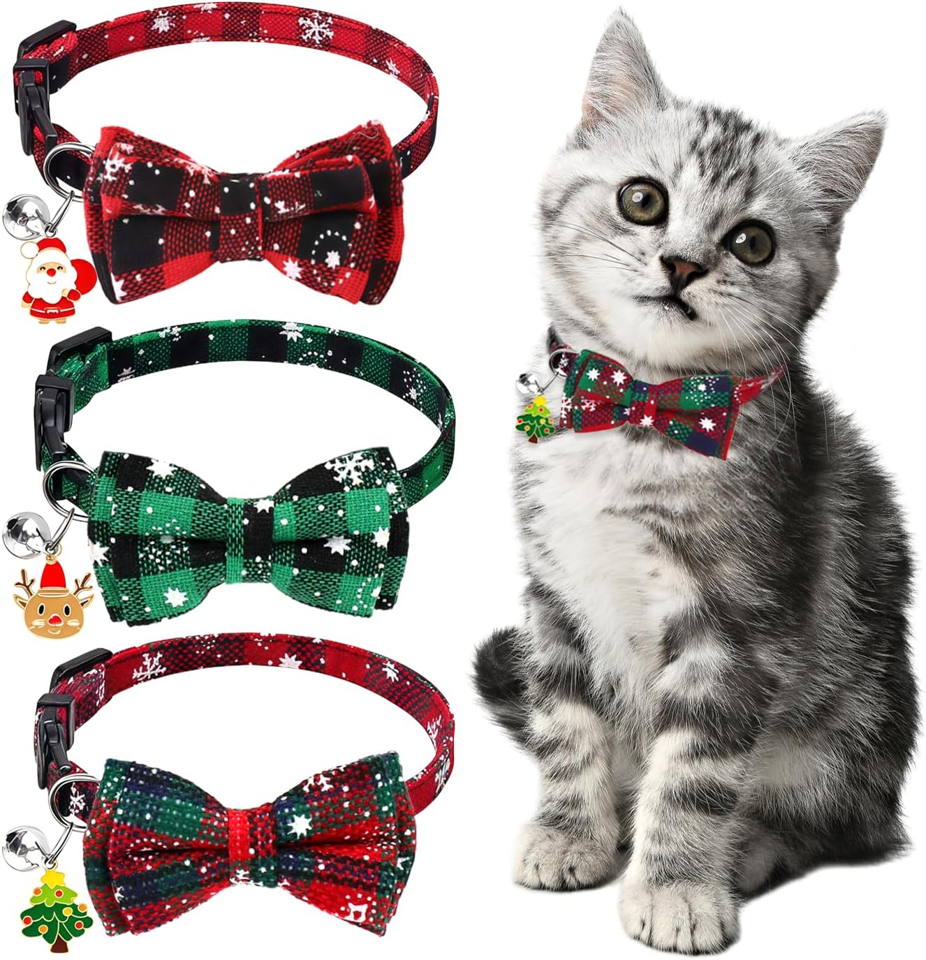 Комплект от 3 коледни нашийника за котки и кучета, коледен нашийник с папионка и снежинки, коледен нашийник със звънец, бързо освобождаване за безопасност, костюм на котенца и кученца