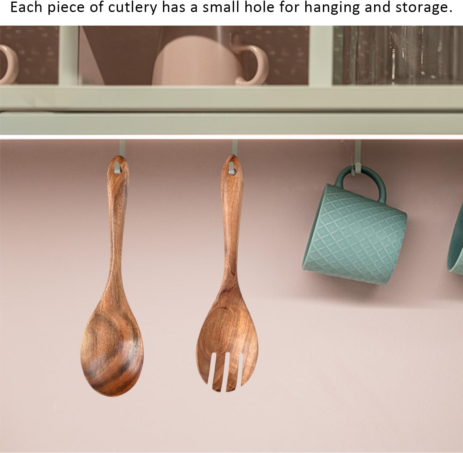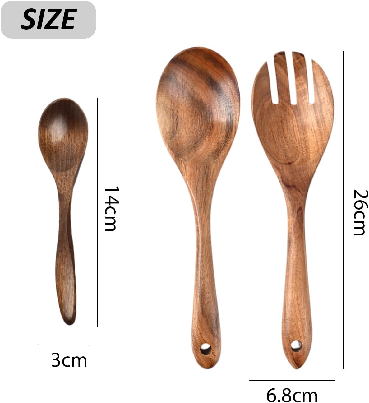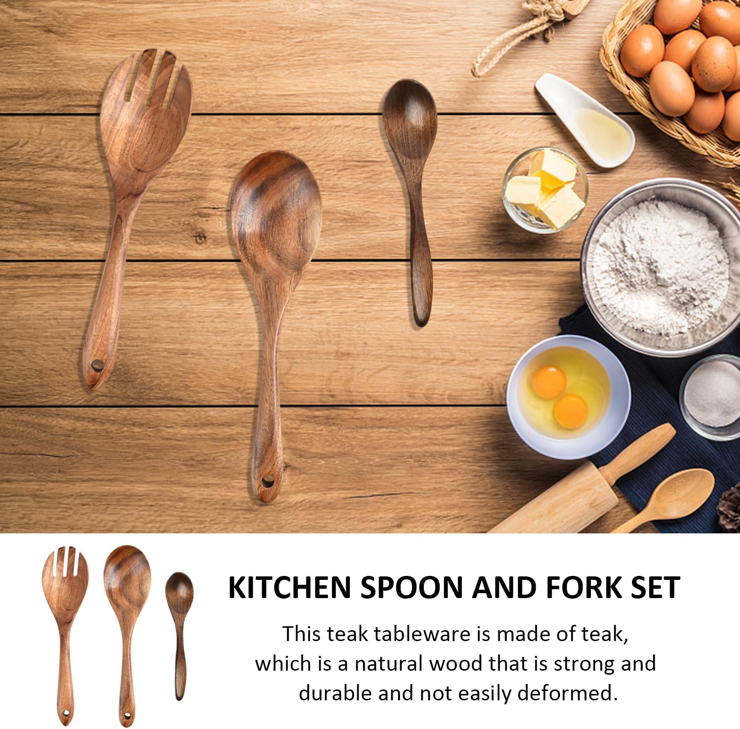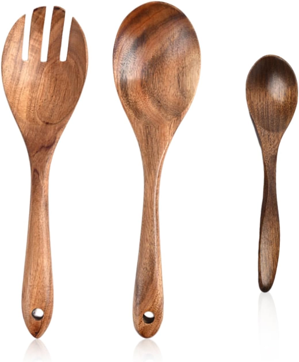 Този комплект от 3 тикови съдове за хранене включва 2 лъжици и 1 вилица, подходящи за готвене в незалепващ тиган и разбъркване на салати. Тиковото дърво е не само устойчиво на топлина и антибактериално, но и гарантира безопасност на храната. Простият, но елегантен дизайн подчертава естествените дървесни шарки, а комплектът е приятен на допир. Всяка част има малък отвор за лесно окачване и съхранение.