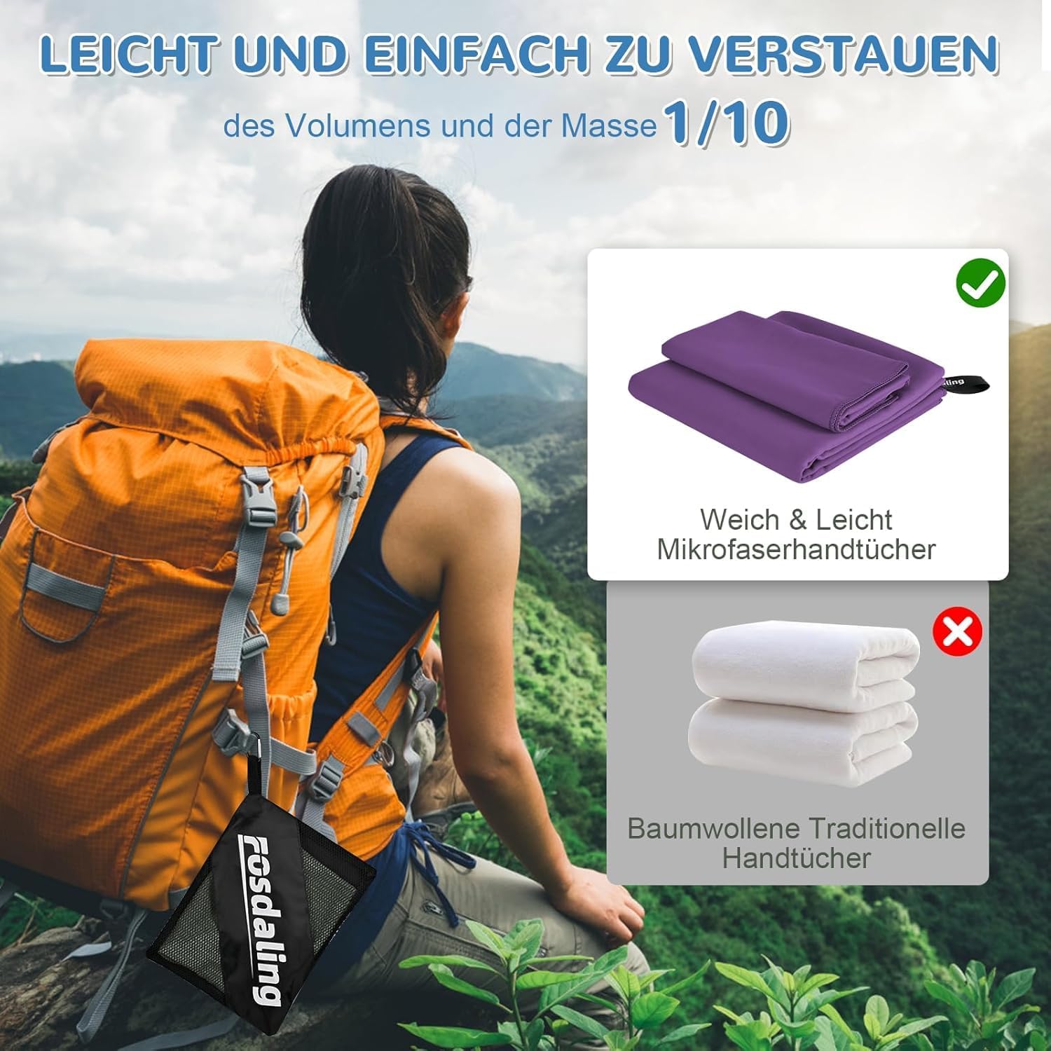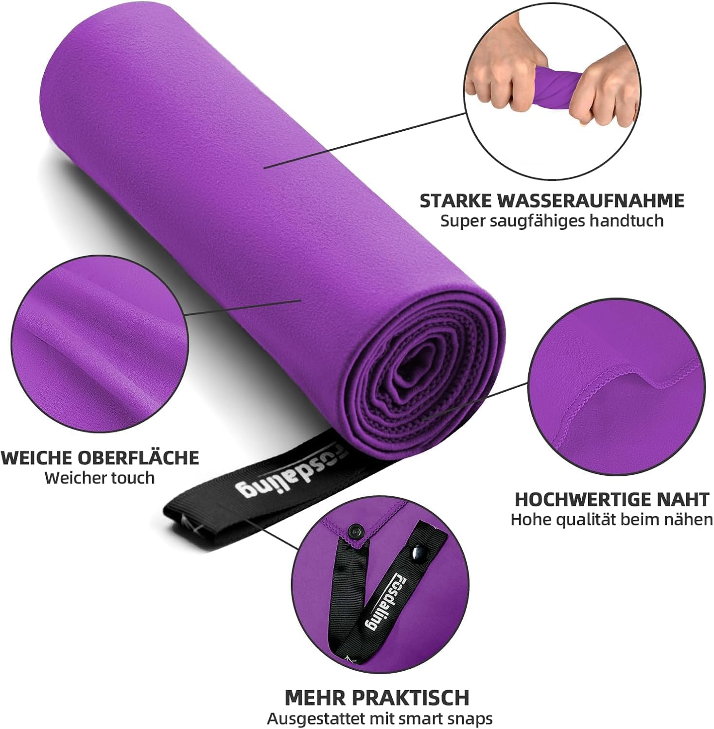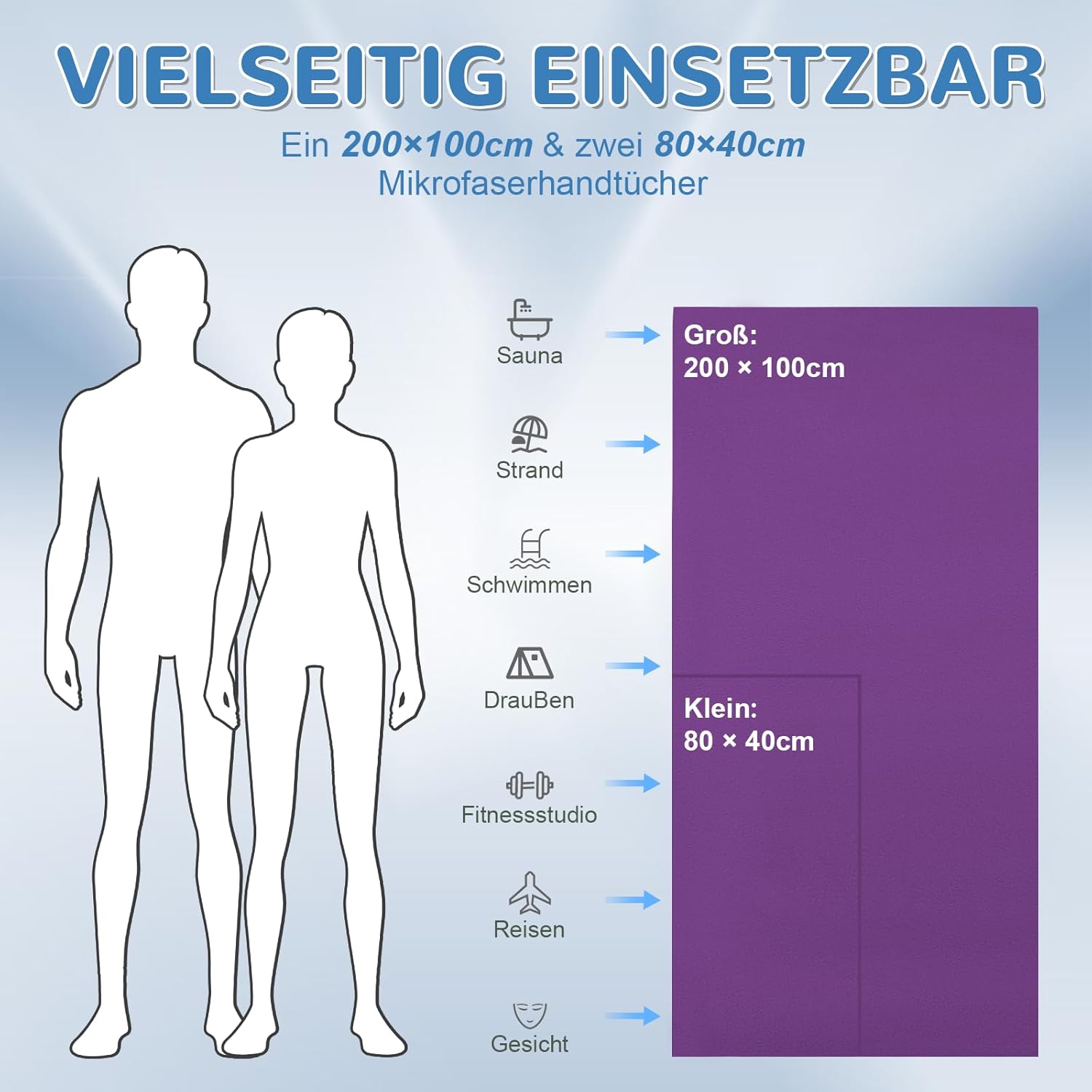 • Многофункционални: голяма кърпа 200 x 100 см и 2 малки кърпи 80 x 40 см, включително аксесоари: преносима чанта за съхранение. Микрофибърни кърпи, подходящи за различни поводи като пътуване, дейности на открито, къмпинг, фитнес зала, плуване, сауна, спорт, фитнес и йога.