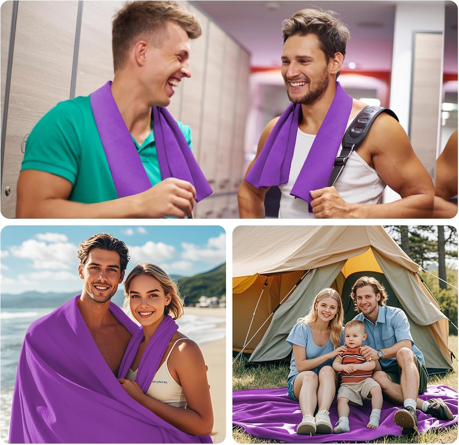 Комплект от 3 микрофибърни кърпи - големи 200 x 100 см и 2 малки 80 x 40 см, бързосъхнеща спортна кърпа от микрофибър за пътуване, кърпа за баня, кърпи за фитнес и спорт и кърпа за плаж (лилава)