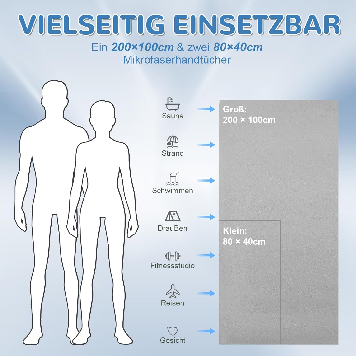 • Многофункционални: голяма кърпа 200 x 100 см и 2 малки кърпи 80 x 40 см, включително аксесоари: преносима чанта за съхранение. Микрофибърни кърпи, подходящи за различни поводи като пътуване, дейности на открито, къмпинг, фитнес зала, плуване, сауна, спорт, фитнес и йога.